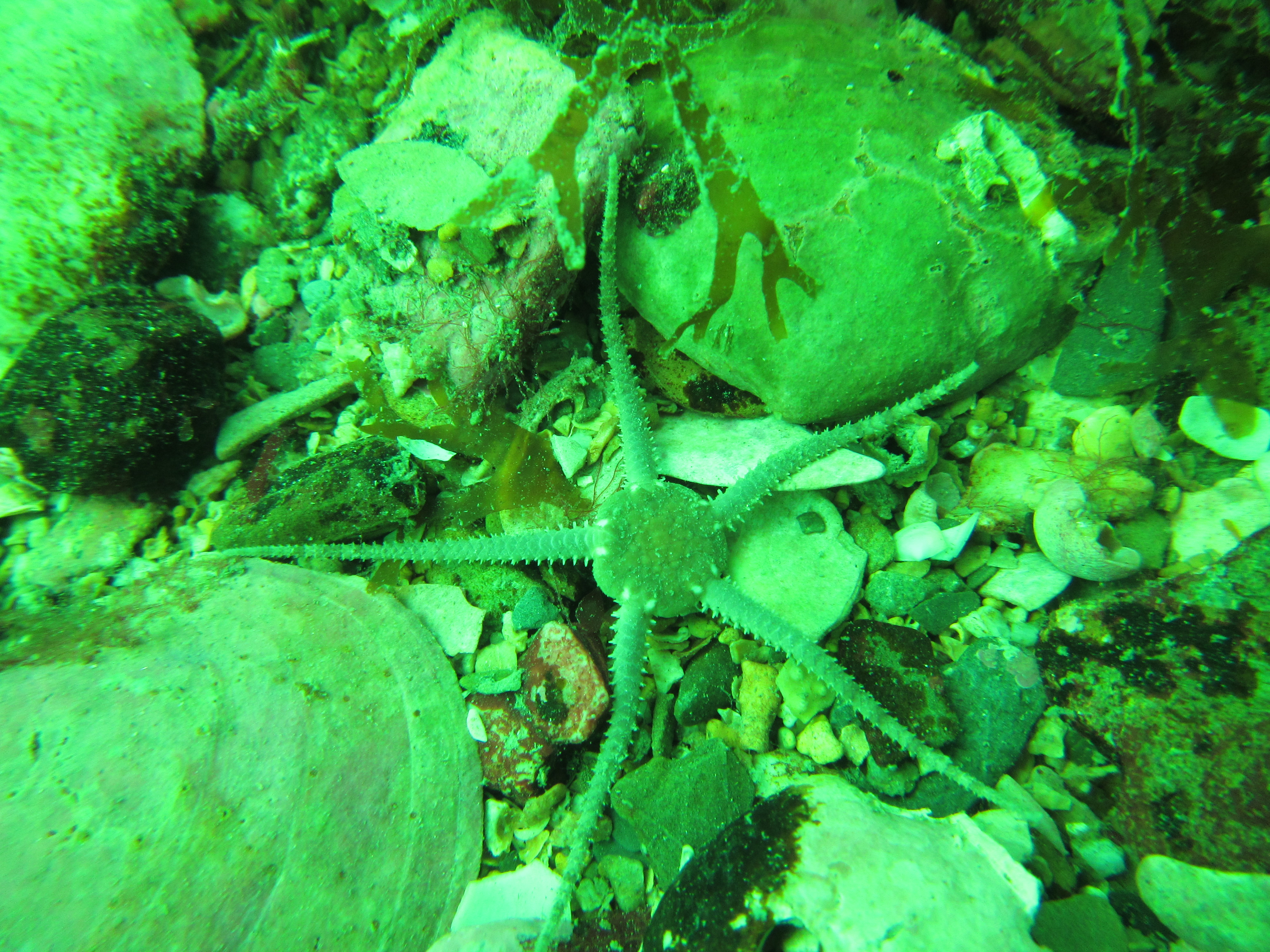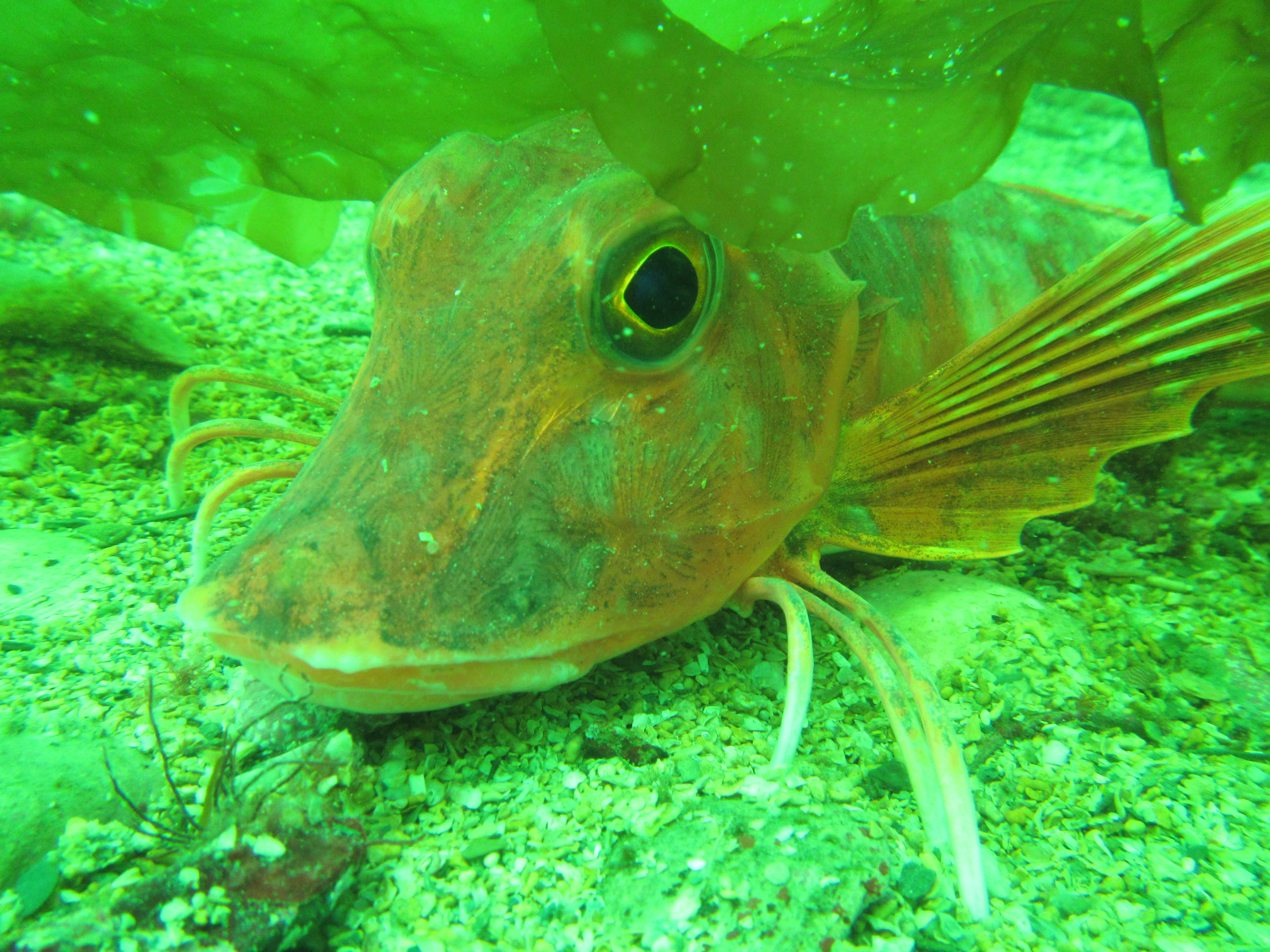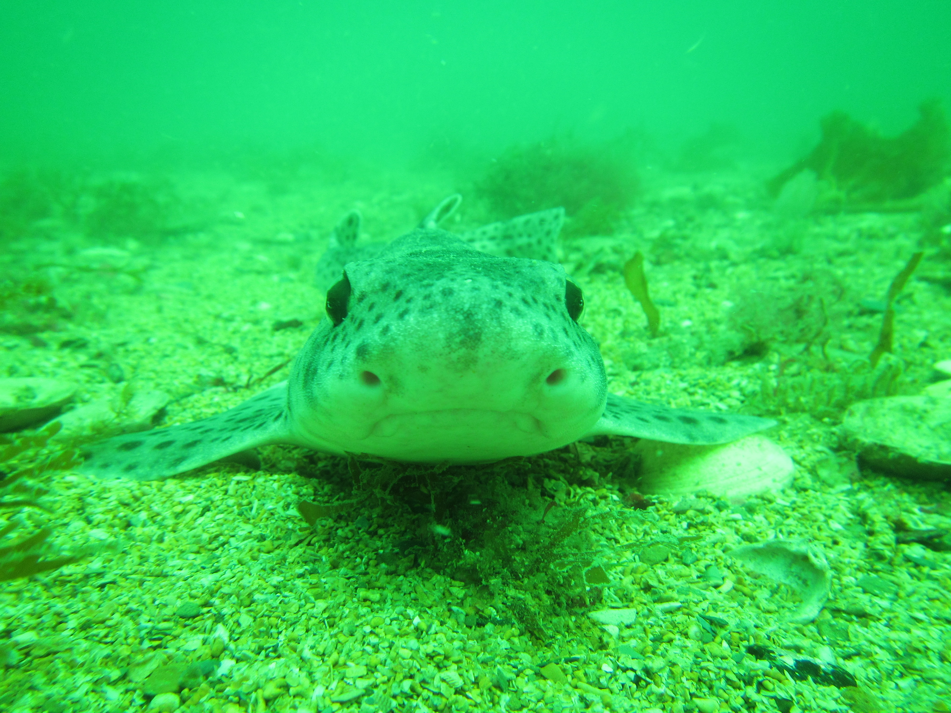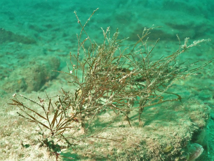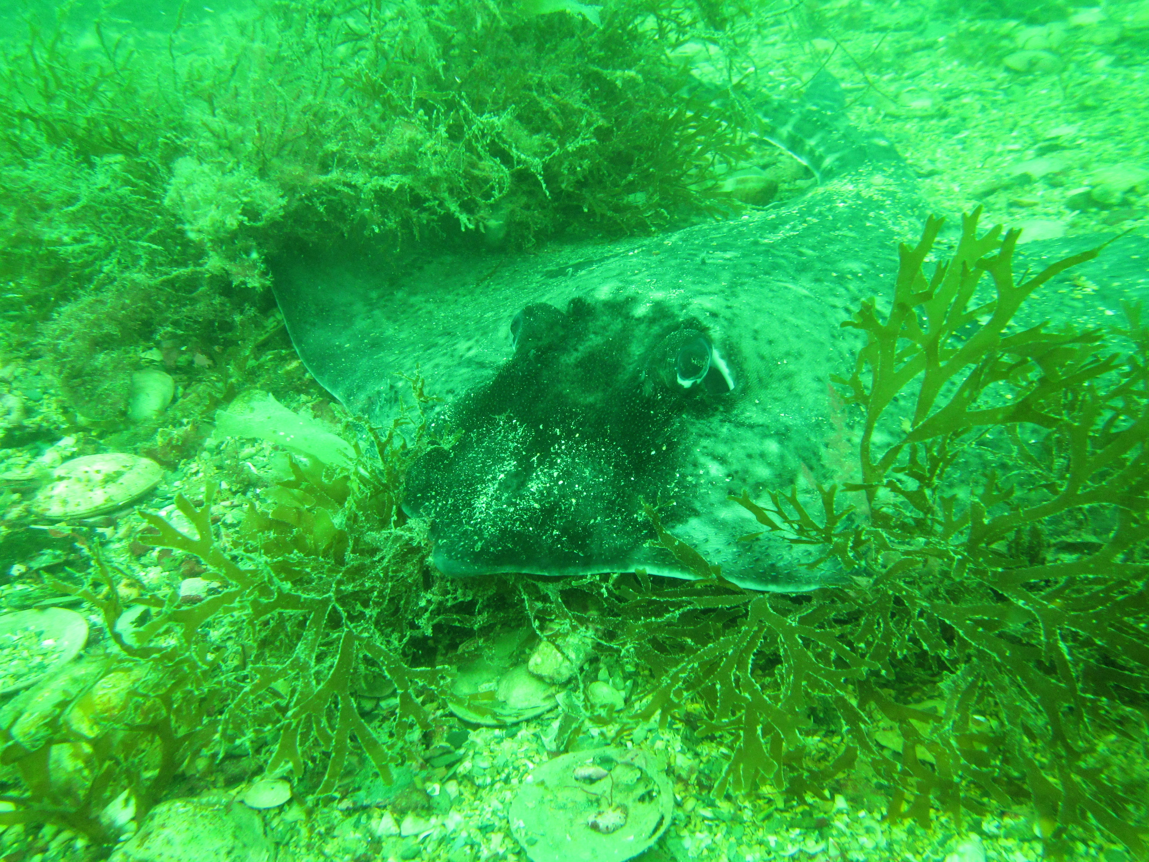 No cuttlefish in sight this time, but loads of eggs so it is likely that this is an important breeding ground for this species. We encountered one Thornback ray Raya clavata, which, like cuttlefish, are not very shy. These species occur in very shallow waters (we probably did not dive deeper than 7 meter) and the influence of the surrounding woodland is clear, with decaying oak leaves and pine cones amidst the seaweeds and eelgrass.