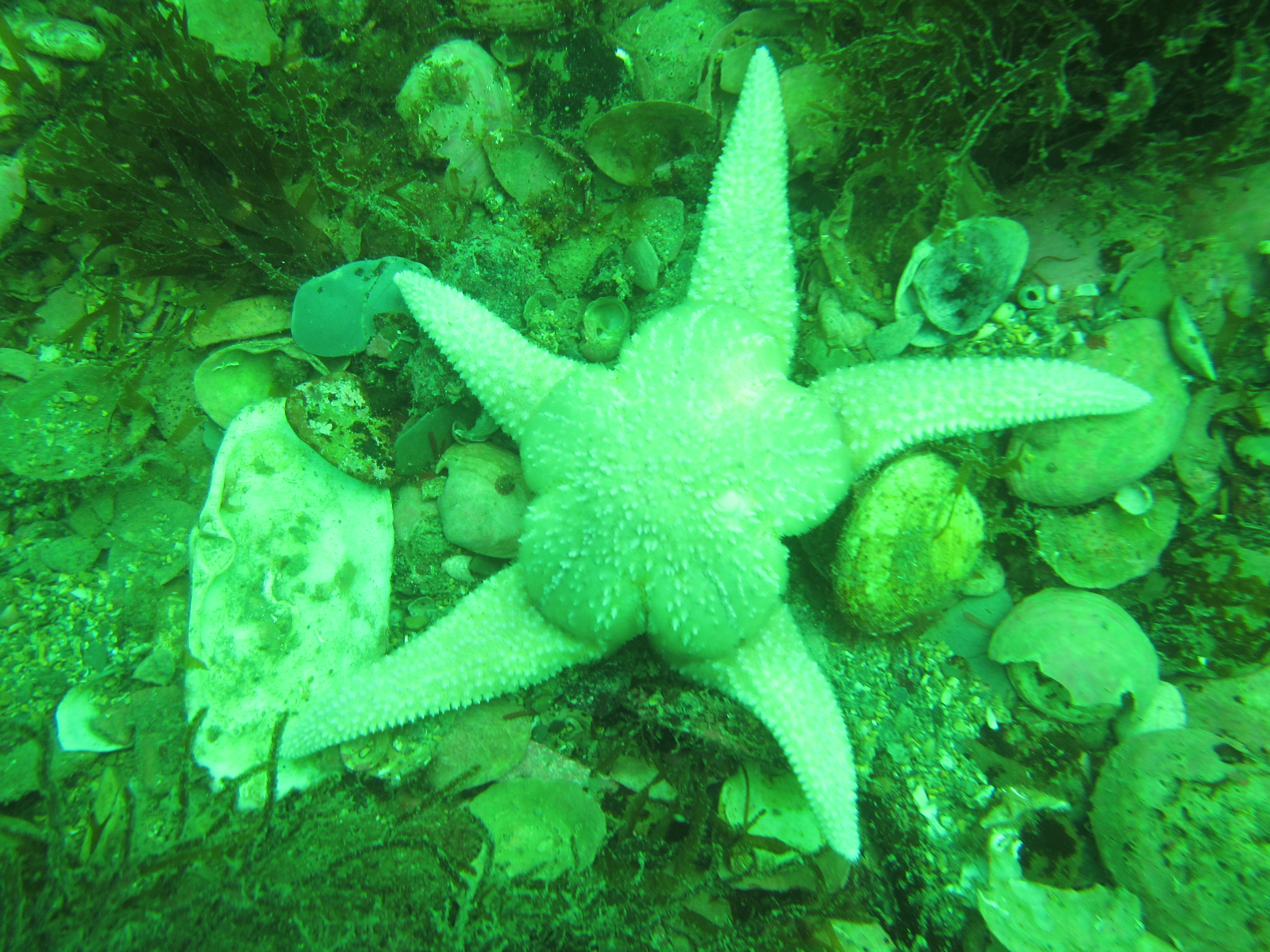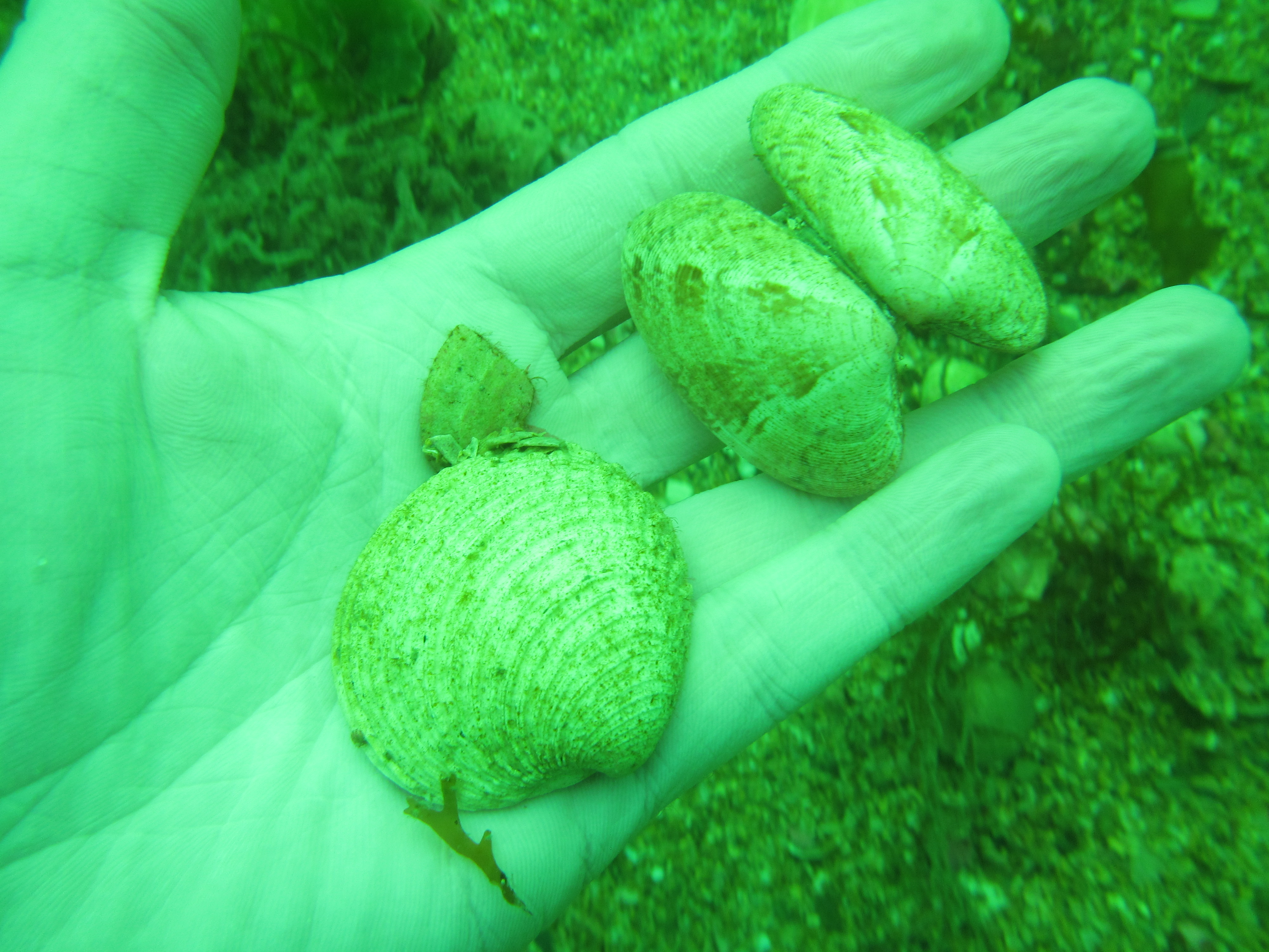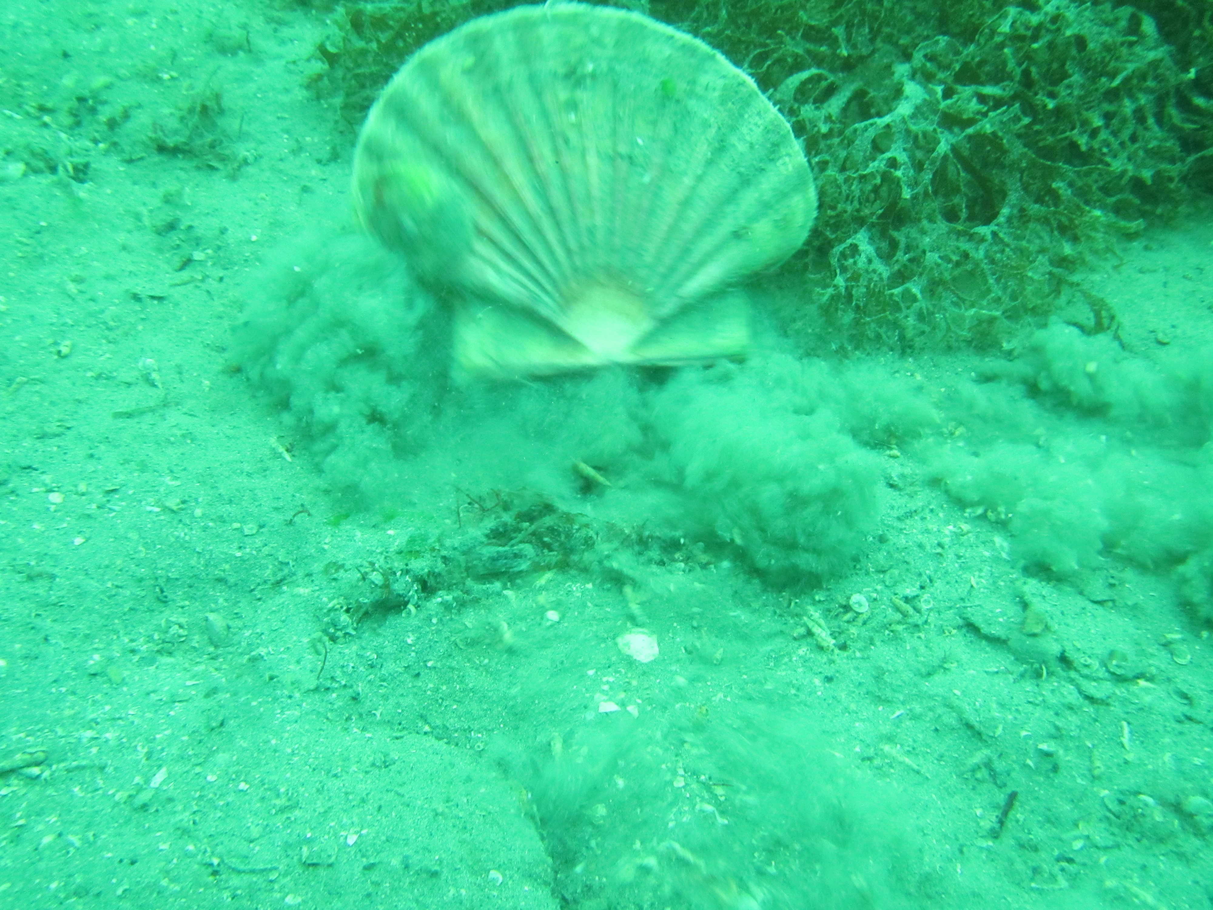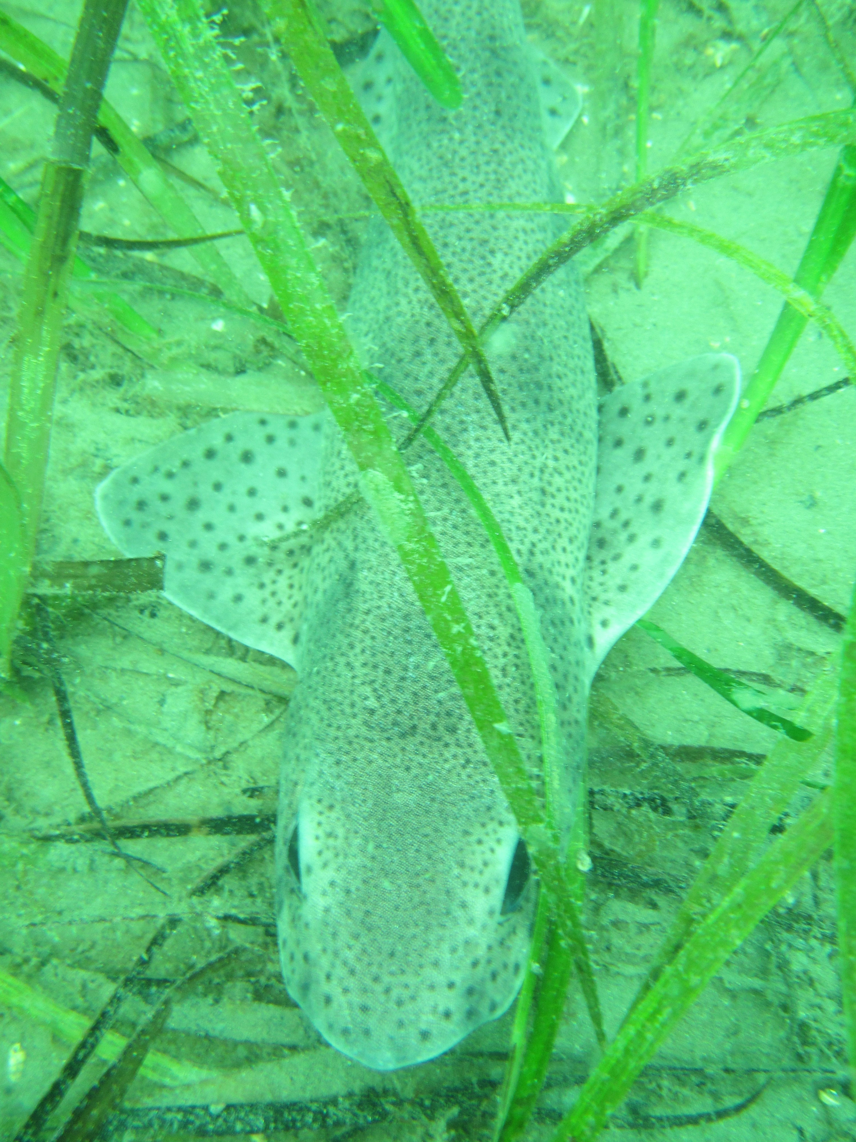 No cuttlefish in sight this time, but loads of eggs so it is likely that this is an important breeding ground for this species. We encountered one Thornback ray Raya clavata, which, like cuttlefish, are not very shy. These species occur in very shallow waters (we probably did not dive deeper than 7 meter) and the influence of the surrounding woodland is clear, with decaying oak leaves and pine cones amidst the seaweeds and eelgrass.