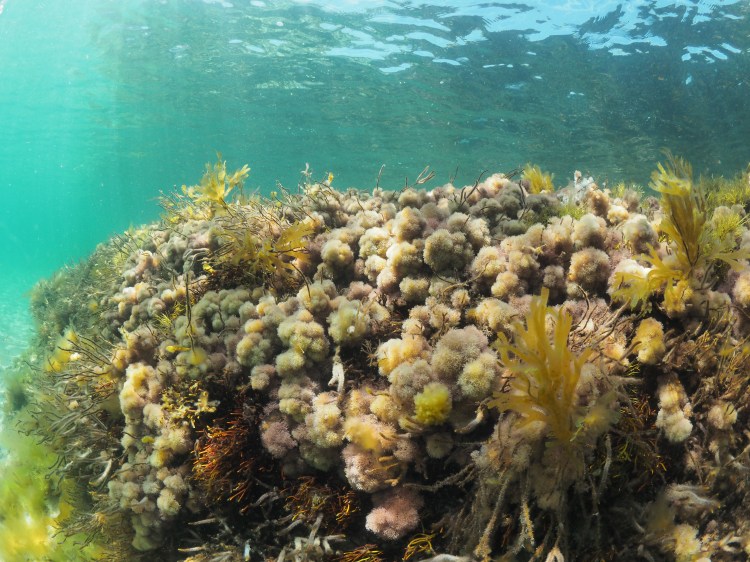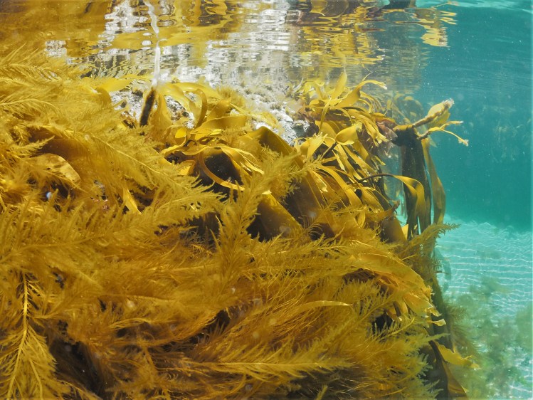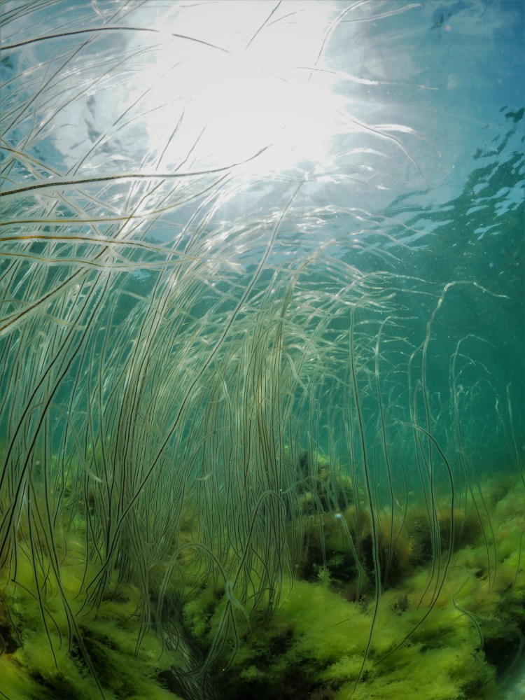 The photos above and below illustrate the state of the rock pools at the moment: quite brownish with the Sargassum and Himanthalia growing everywhere. The red, pink and purple species have largely disappeared (apart from Harpoon weed) and there is quite a bit of green Ulva growing. The water teems with juvenile pollack in the rock pools and schools of sand eels a bit further out. Diving over sandy patches, you can see the latter species shooting out of the sand en masse. It is crazy how such a silvery pelagic fish can also burrow in the sand. I guess it does take its toll, as there are quite some dead ones to be seen too.