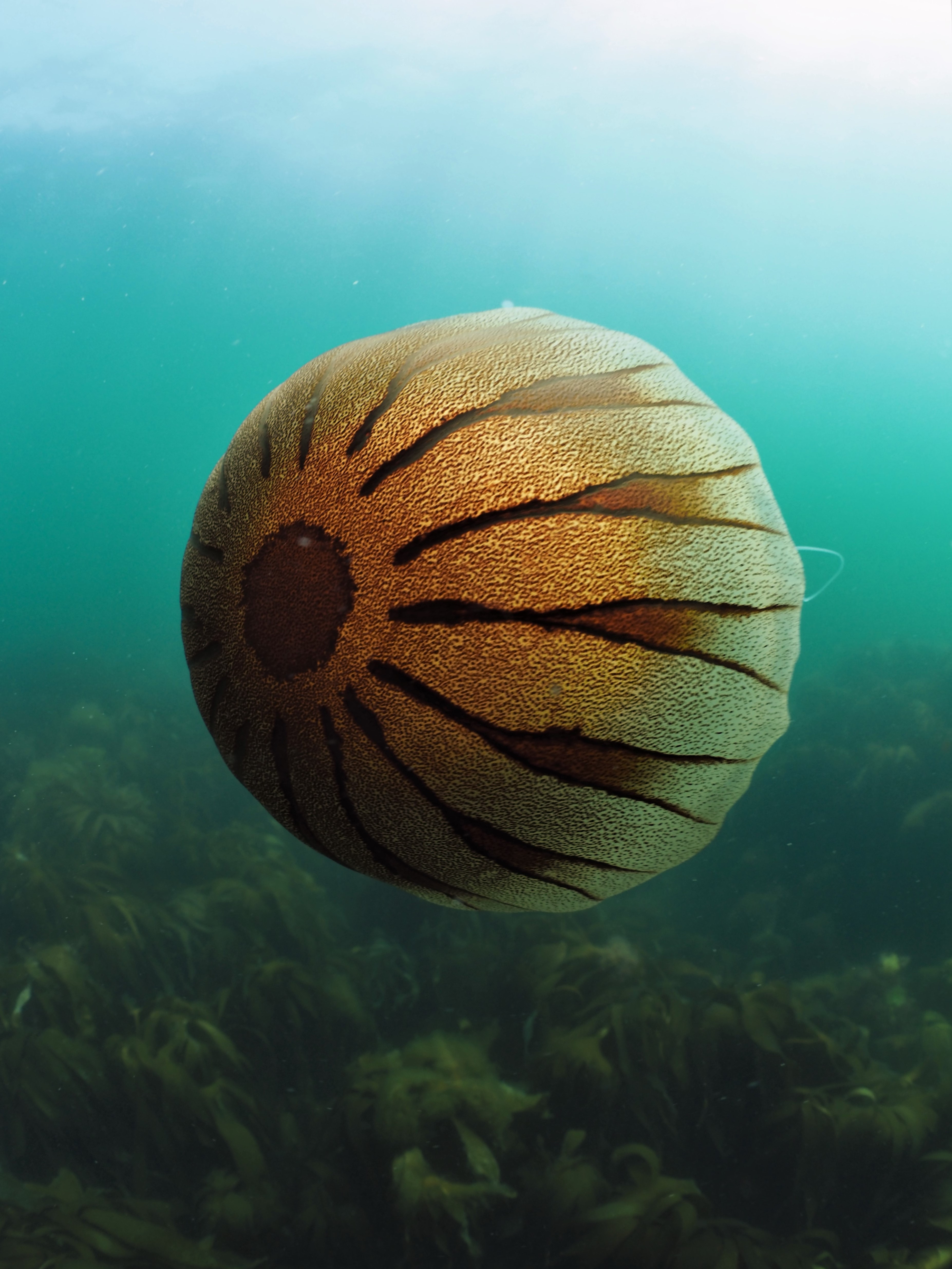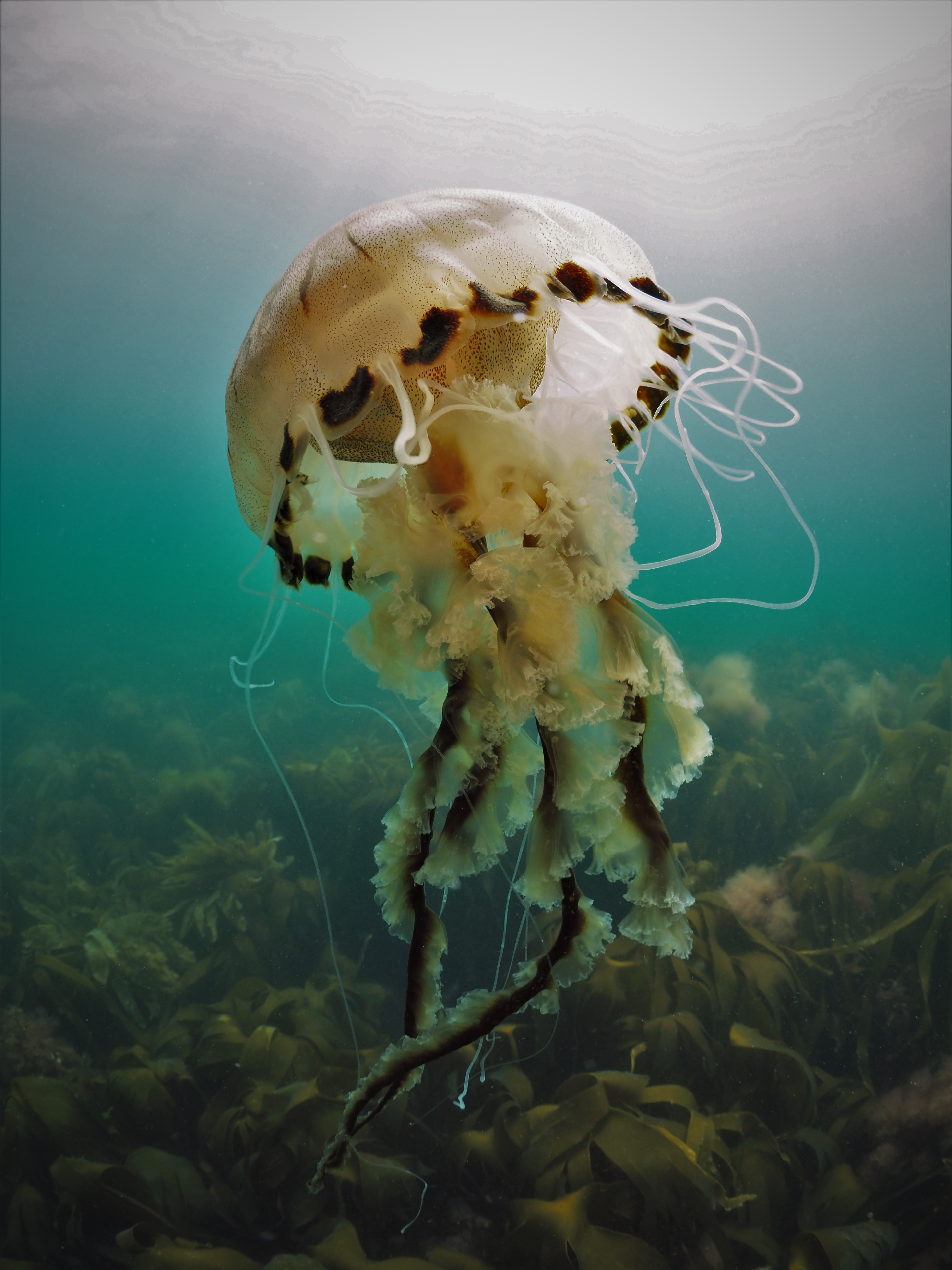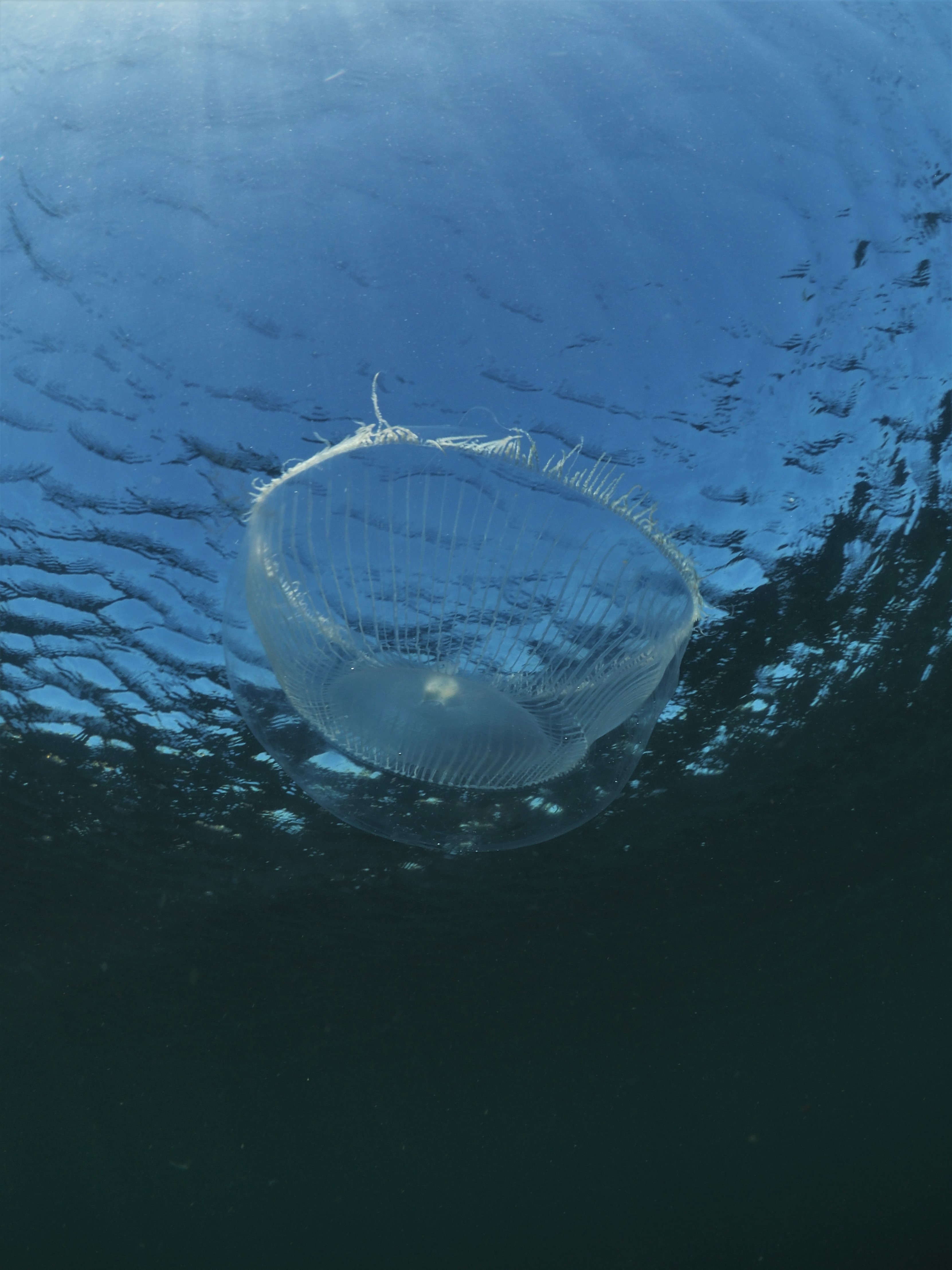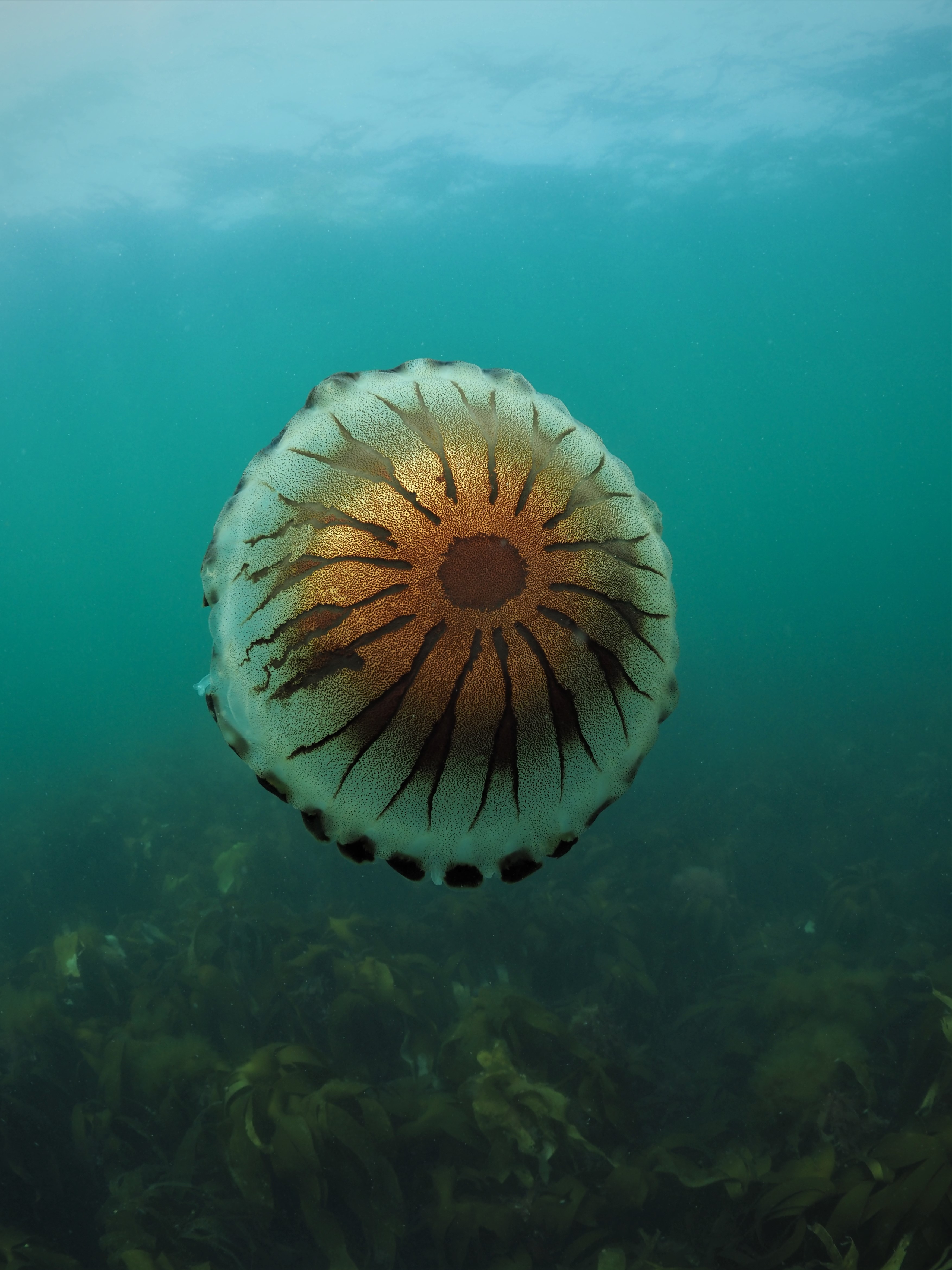 It is the time of year where the rock pools look less attractive (for an example see this old post) and jellyfish appear in the sea beyond. As they are pretty and slow moving, they make for excellent subjects and so I have ventured out over the kelp recently to look for them. I now have a reliable INON D-200 strobe (actually I have two such strobes, it is just that the second arrived 6 weeks ago but not its fibre optic cable…) which makes a huge difference in the types of shots you can take. Photos taken using natural light only can be pretty (see for example here for previous attempts) but a strobe just opens a whole new range of possibilities. I was quite pleased with myself with the shot above of a Compass Jellyfish that seems to float in outer space. Here, the strobe lights up the jelly (which is really close in front of the camera) but it cannot light the ocean behind. Using a fast shutter speed, the ambient light (that would make the water blue) is not let into the camera, resulting in a black background. An exception is the bright sky, which is visible in Snell’s Window, and which looks a bit like a planet against the black background. Of course, even with using a strobe you can choose to let in ambient light, leading to more conventional shots such as the one below (however the jellyfish is a bit further away and not very nicely lit up by the strobe):