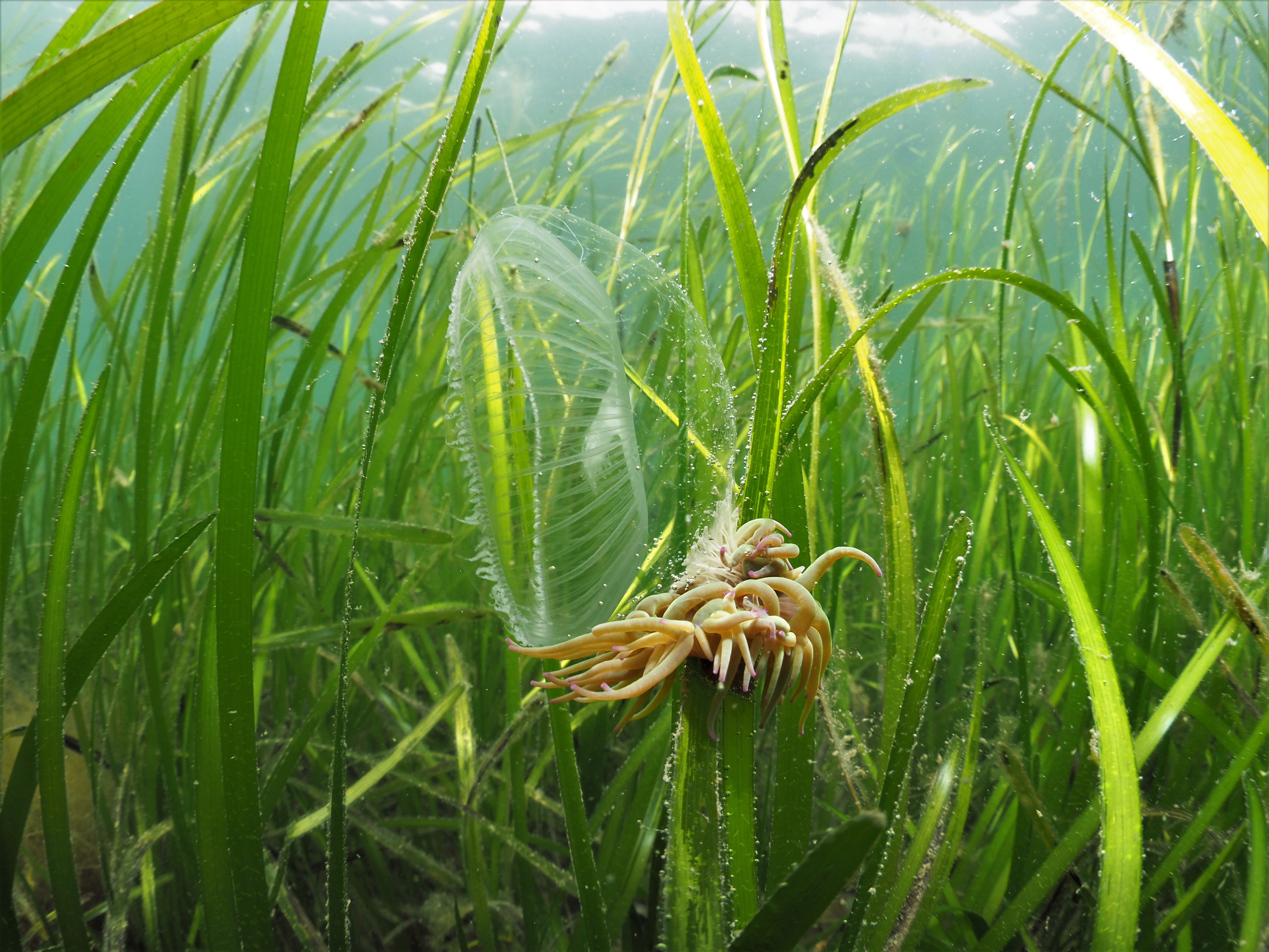 The Flushing snorkel site is very different, no (deep) rockpools, only a little bit of kelp but with a very healthy patch of seagrass. No catsharks or thornback rays when we went in, just the odd small sea bass. There are many small Snakelocks anemones on the seagrass. I used to think that it was mostly the purple form that did this but I now noticed that most were the green variety, so the morphs do not seem to differ in this respect after all. One anemone had ‘caught’ a crystal jellyfish (an Aequorea medusa). Not sure if it was in the process of being digested or just ‘stuck’.