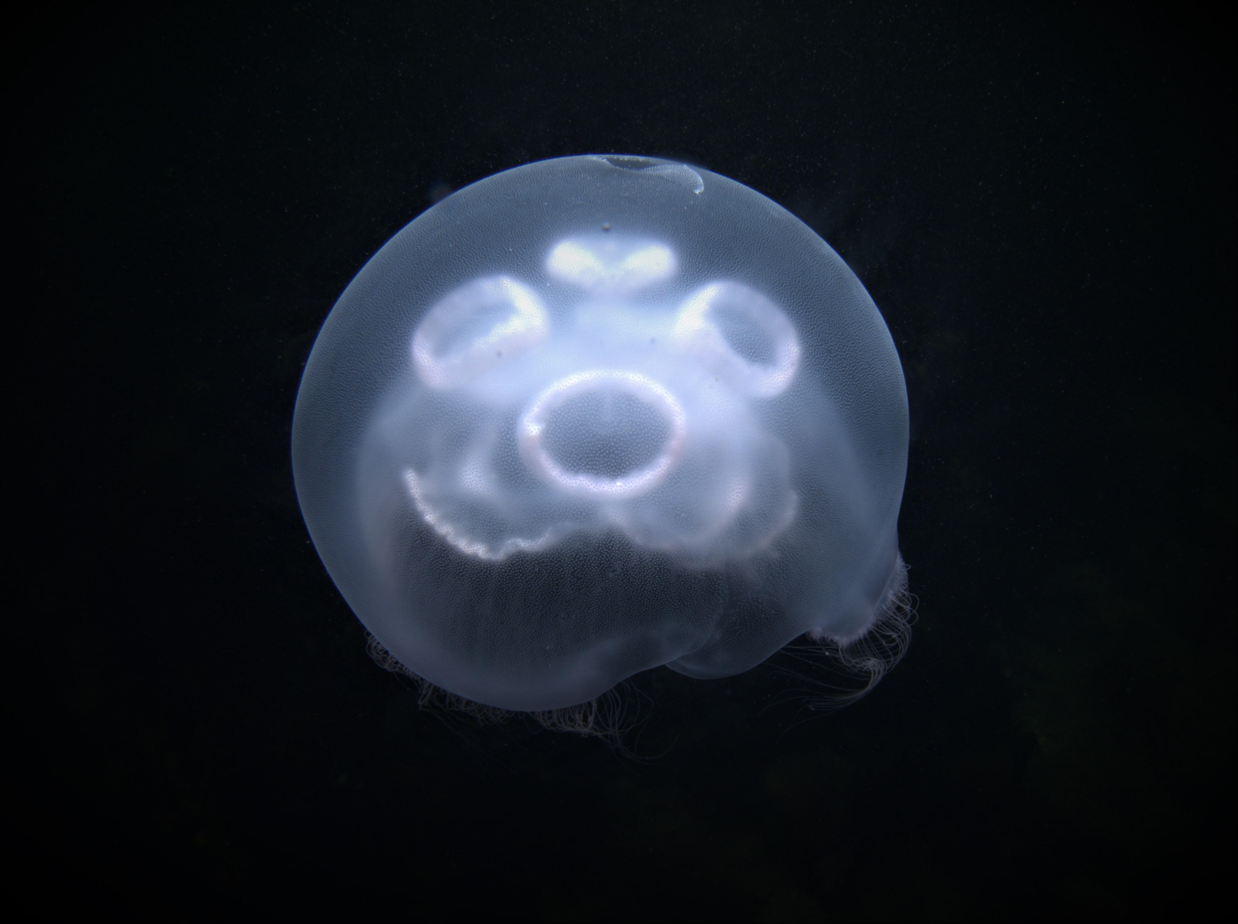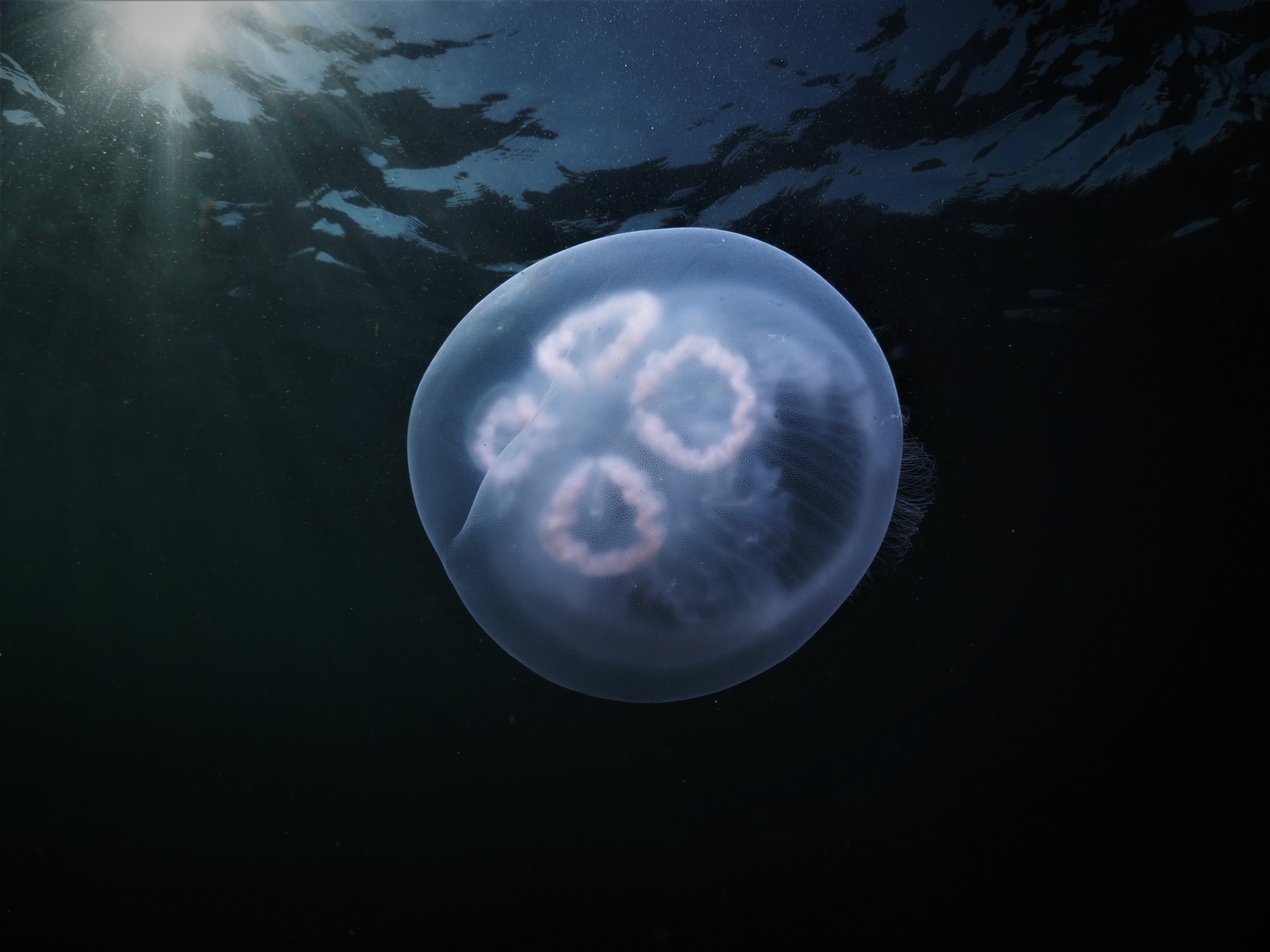 By pointing the camera downwards and getting rid of much of the sunlight, the fast shutter speed black background effect is even stronger, even on a sunny day. An example is the Moon Jellyfish below. Btw, I have touched these photos up with the generic Windows photoviewer (a poor man’s Adobe Lightroom) whch performs quite well. It is however tricky to get rid of some of the backscatter (particles in the water that light up because the strobe is incorrectly positioned, illuminating not just the subject but also the water in between subject and lens). This effect can be seen above the jelly in the second photo even after editing in Windows Photo: