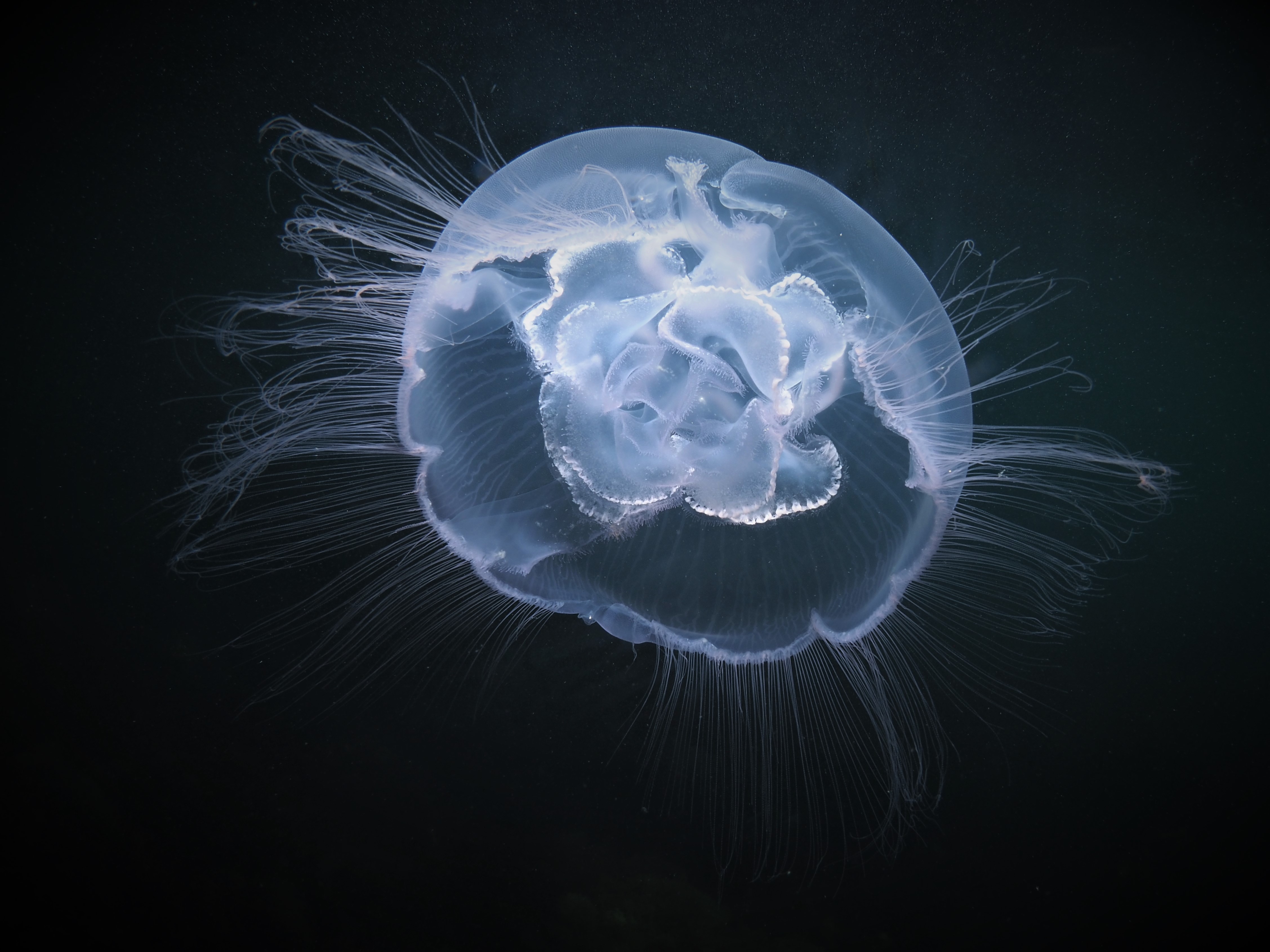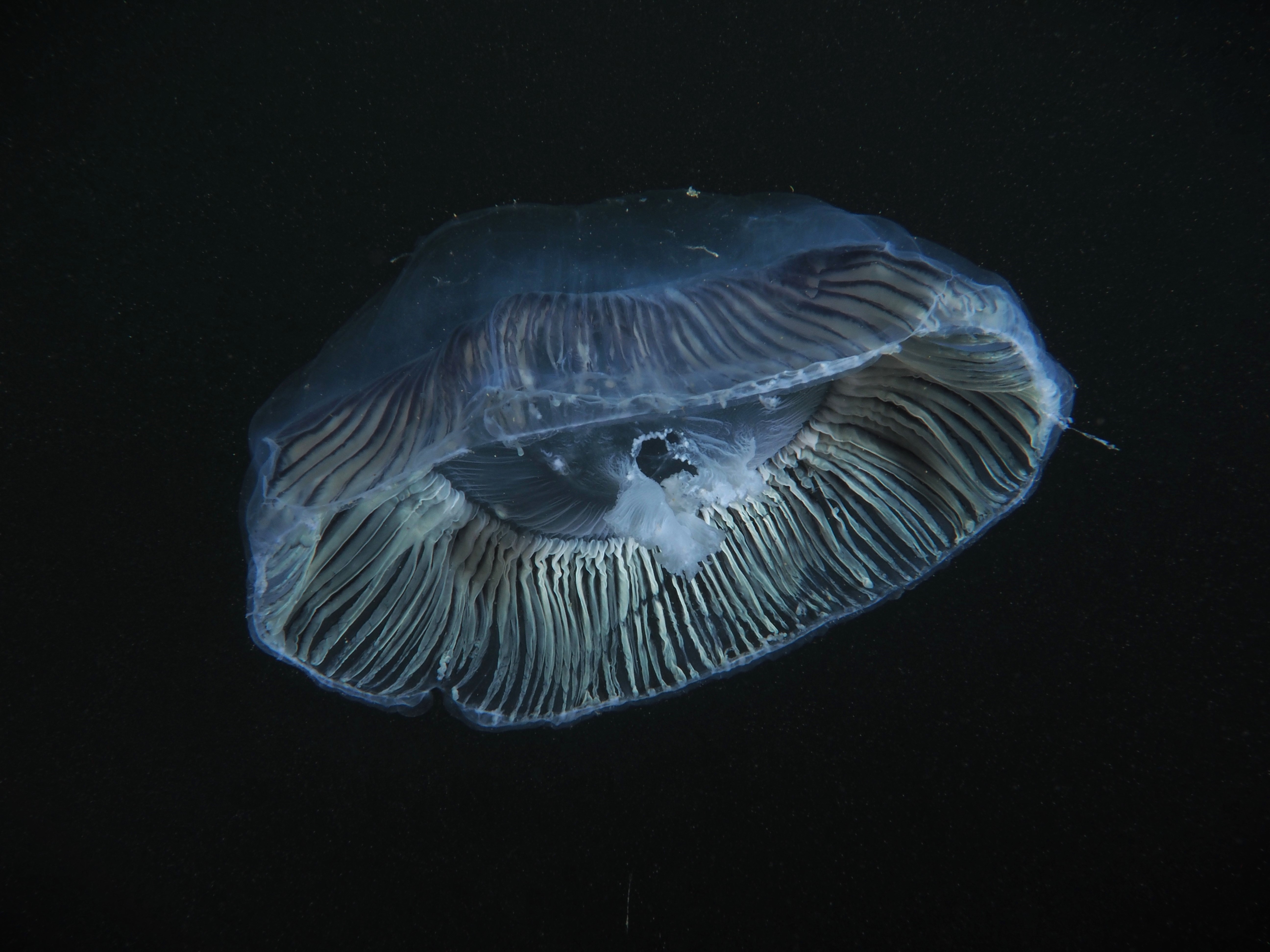 I tried some downward shots as well, which were much more gloomy. I saw a lone Blue jellyfish and a couple of Compass Jellyfish Chrysaora hysoscella. They are much smaller and have longer tentacles that unlike the Barrel jellyfish can sting (but not badly). Jellyfish are a great subject, beautiful and not rapidly swimming off! I hope to go back soon and try some more shots. (I will have to make sure to wipe the dome port occasionally as I had to spot-fix quite a bit).