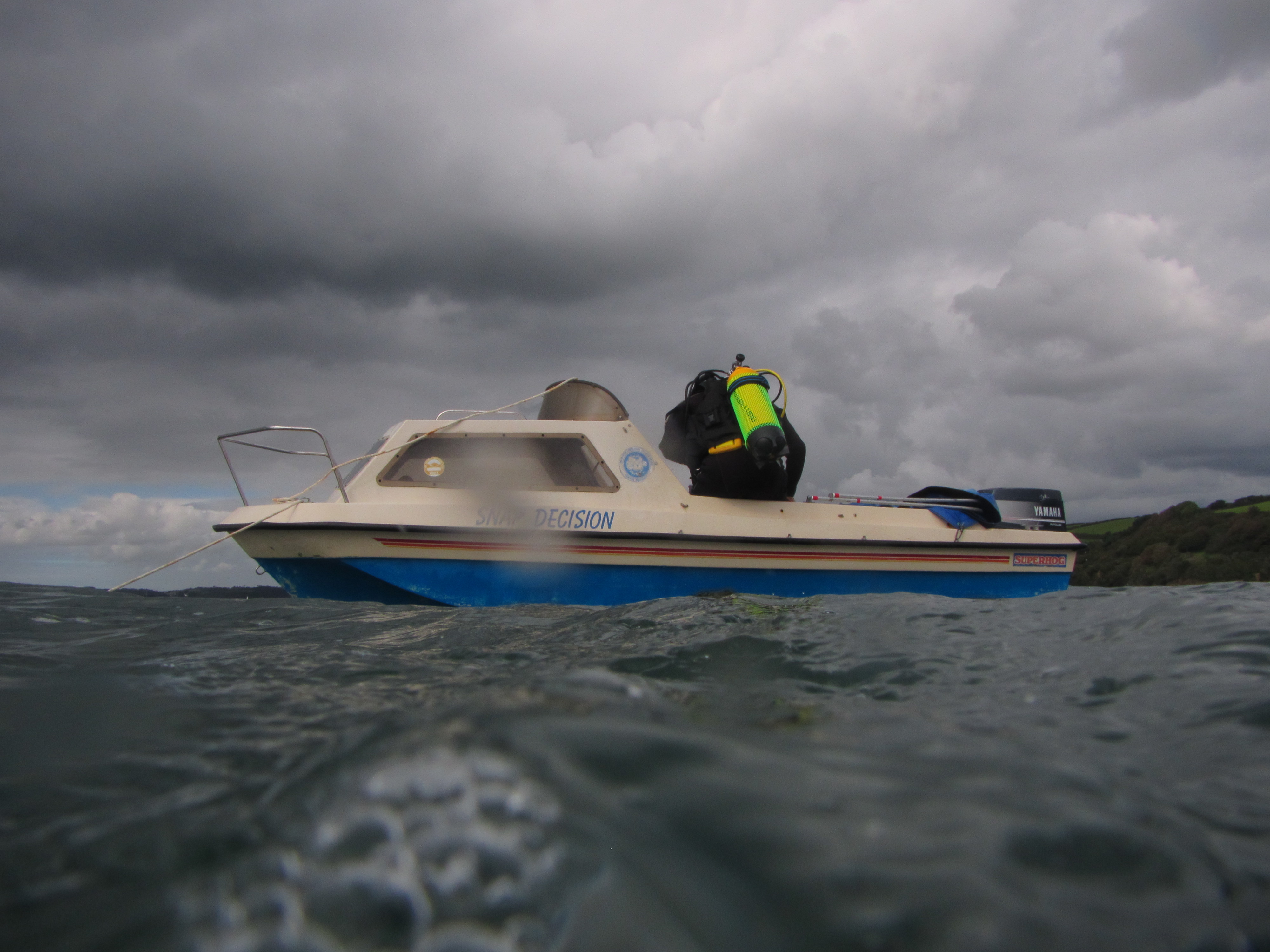 The weather was not great last weekend and we were too late at the diveshop on Saturday to be back in time to get the tanks refilled for a dive on Sunday but the one dive was (as always) worth the effort! We took dive buddy Chris’s boat from Loe Beach in Feock over to the other side of the Fal Estuary (between St. Just and St. Mawes) to explore the Maerl beds. See an earlier post on a snorkel trip to see this bed of ‘Cornish coral’ for some more background information. After the usual faffing about with equipment on board we plunged in the water. I took a single photo of the boat which turned out quite dramatic: