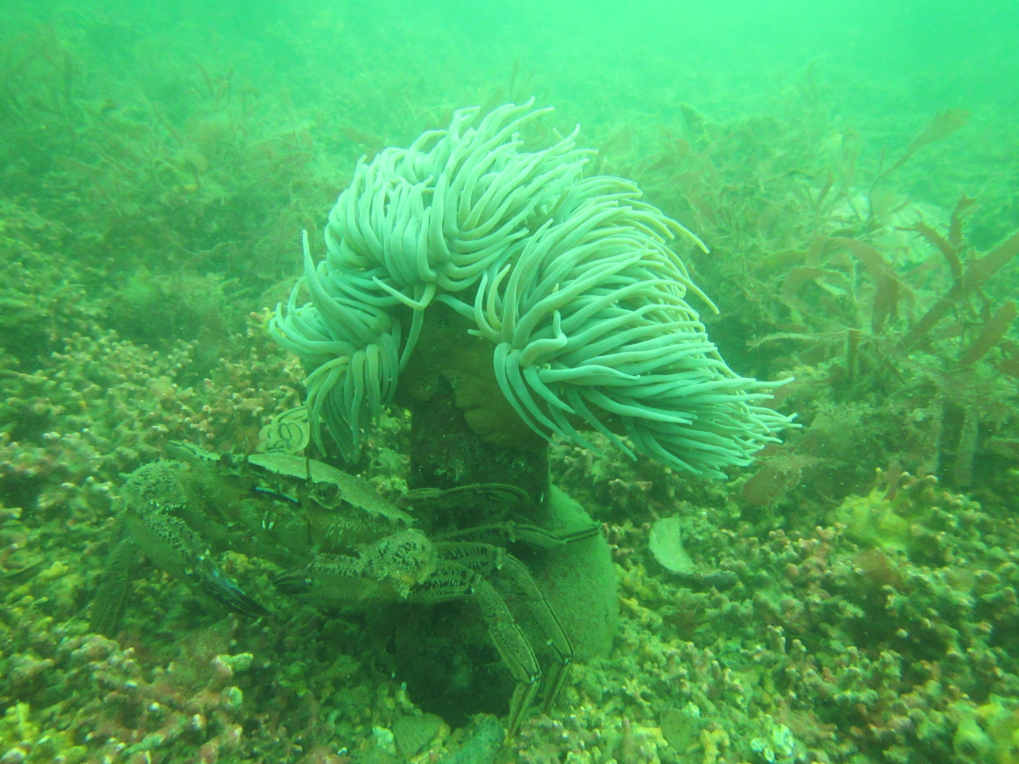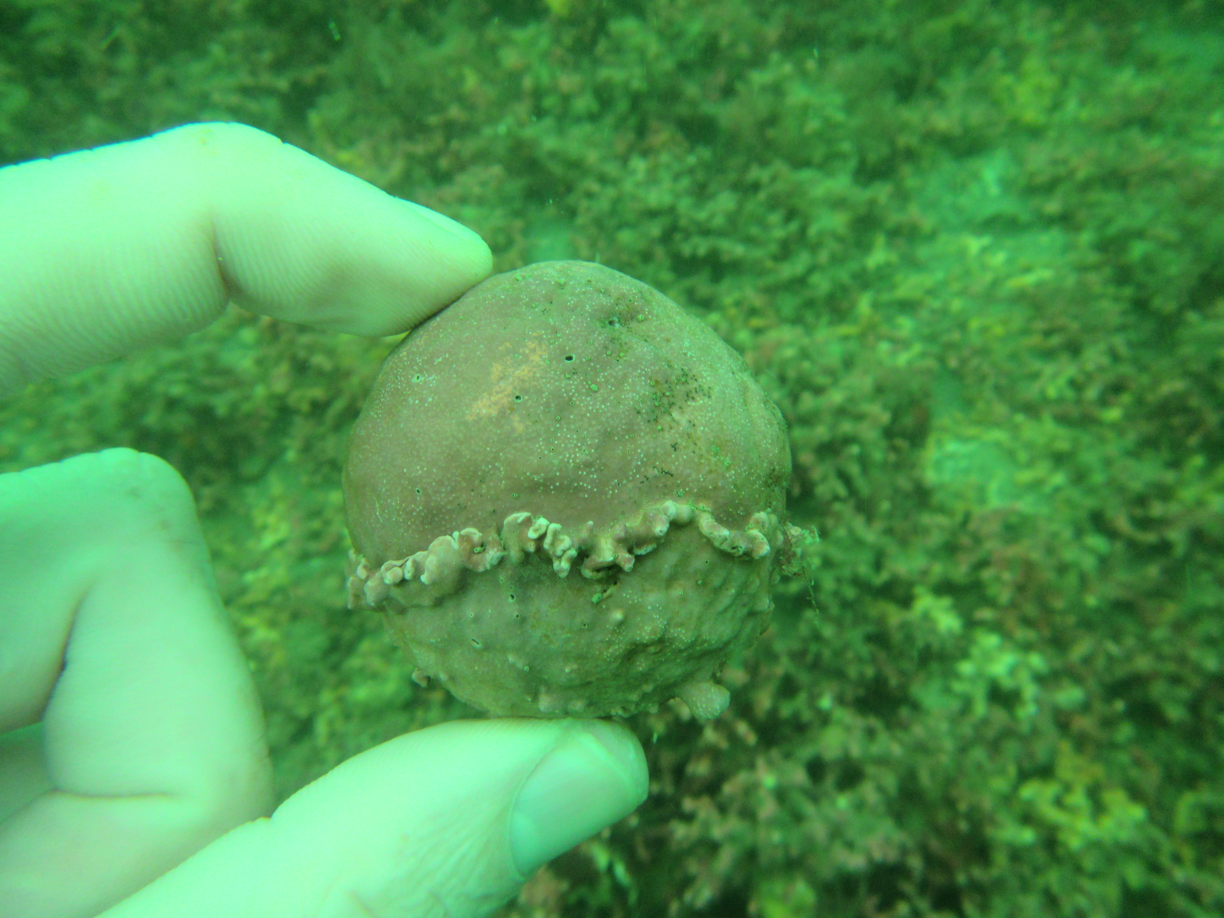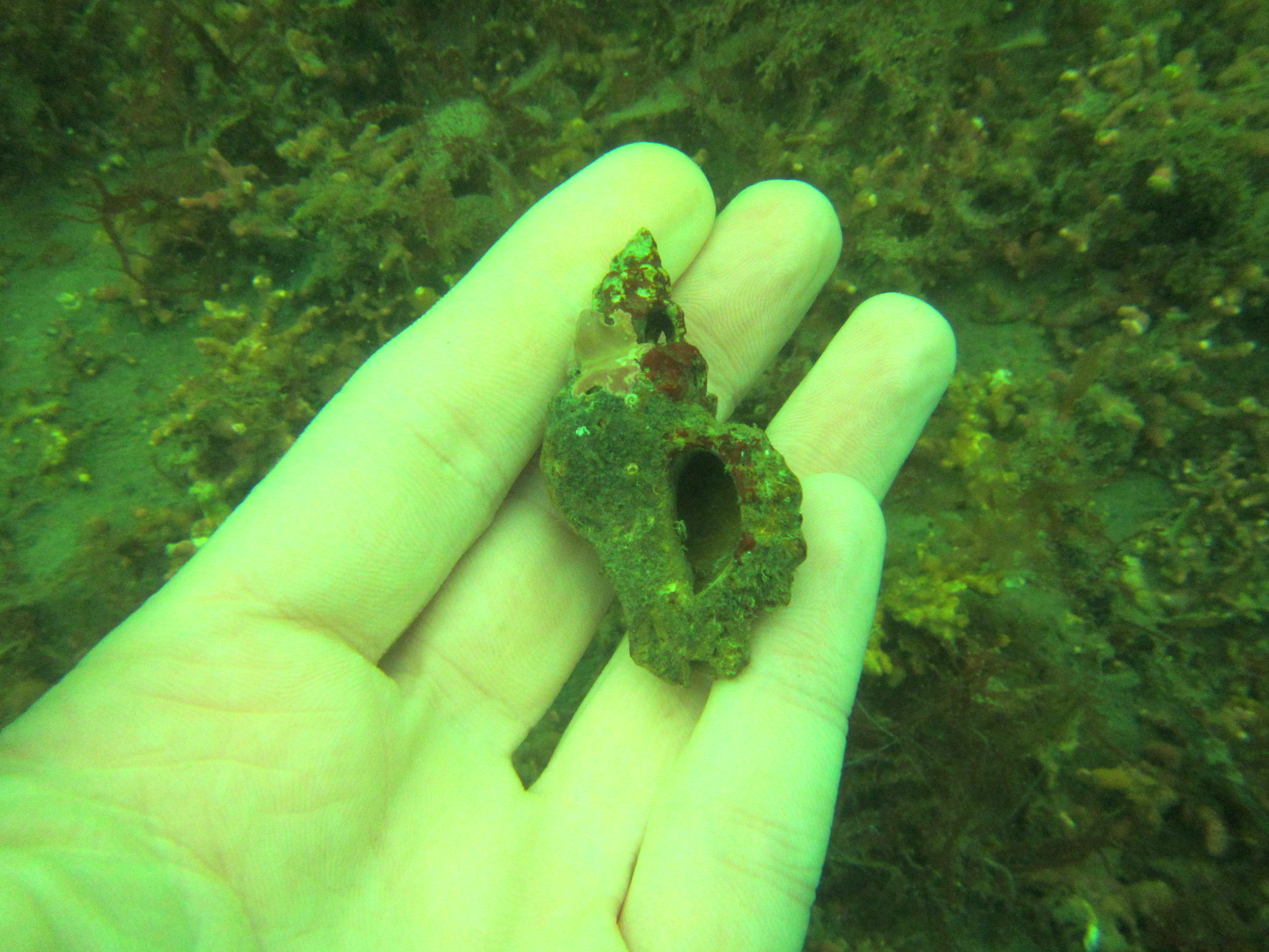 Swimming crabs were common and probably mostly were the Harbour crab Liocarcinus depurator. The first picture was the only one with flash and shows the Maerl colours a bit better. The second photo shows a Velvet swimming crab Necora puber under a snakelocks anemone sitting on top of a bottle. This species can be very commonly seen rockpooling. Lastly an empty shell of the largest European sting winkle Ocenebra erinaceus I have seen so far and probably the largest sponge I have seen so far too (with a human head for scale).