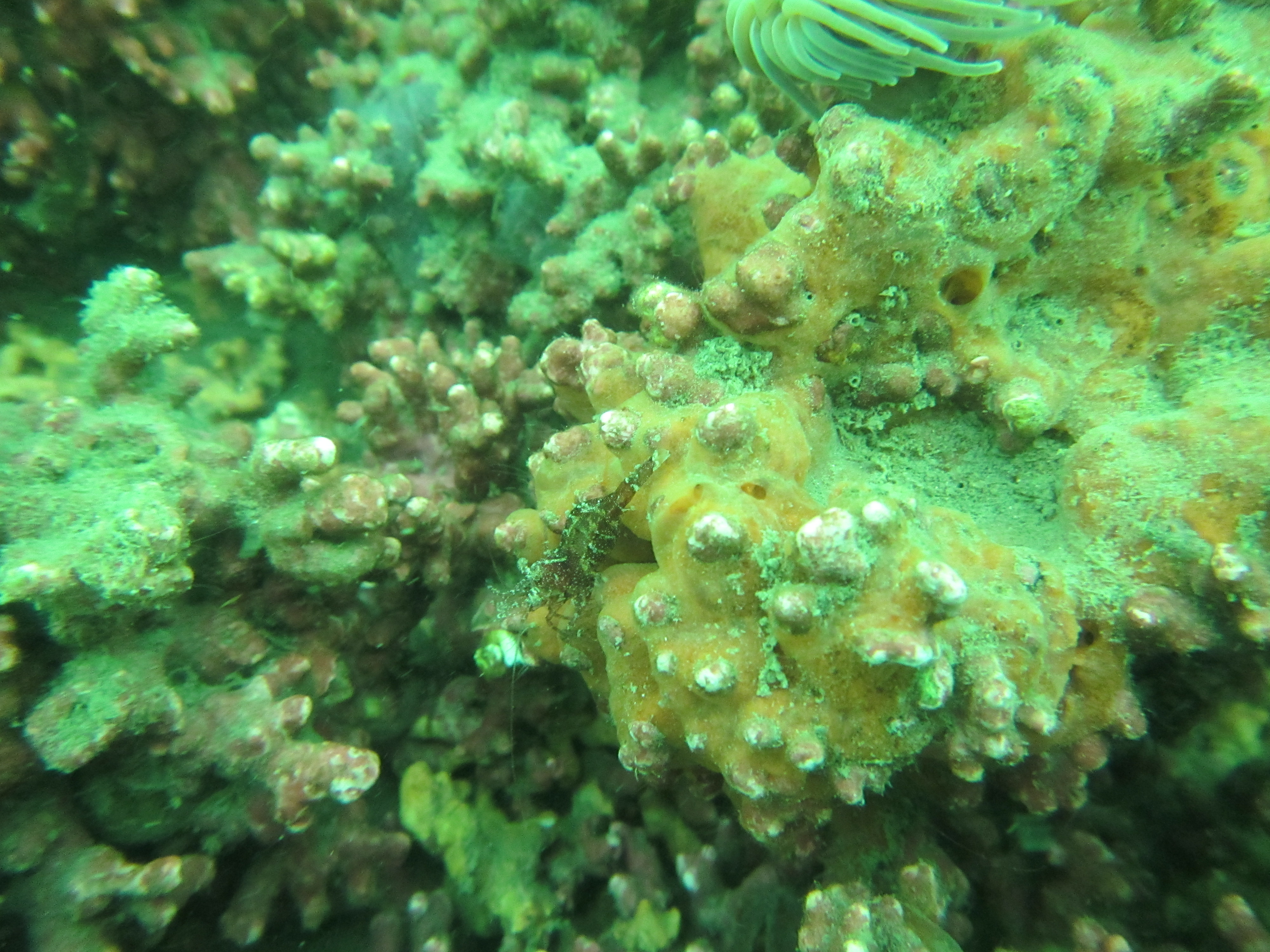 We saw a couple of *very well* camouflaged crabs sitting about. They were completely covered by sponges, coralline algae and seaweeds. There are a number of crab species shaped like this but most of them seem too small. Best guess is the Toad crab Hyas coarctatus the Europan spidercrab Maja squinado in a particular extravagant mood. There are lots of little things hiding in the Maerl; gobies (rock gobies I think), squat lobsters, swimming crabs, hooded prawns and things that hide faster than I can identify them. I noticed a dainty little prawn sitting about which is probably Thoralus cranchii, although it could also be Eualus occultus (second picture is cropped).