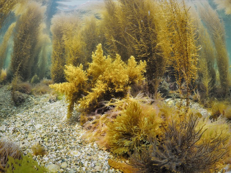 The photo below shows some of the common species, from the bottom right to top left: Cladostephus spongiosus, Dictyota dichotoma, Asparagopsis armata, Cystoseria baccata with Sargassum muticum in the background. Ij the second photo it is obvious that the Wireweed and Rainbow wrack are quite dominant, same for the Hairy sandweed Cladostephus spongiosus. The Thong (or Spaghetti) weed is covered in fuzzy epiphytes. I will keep practicing for when the reds and purples come back in autumn!
