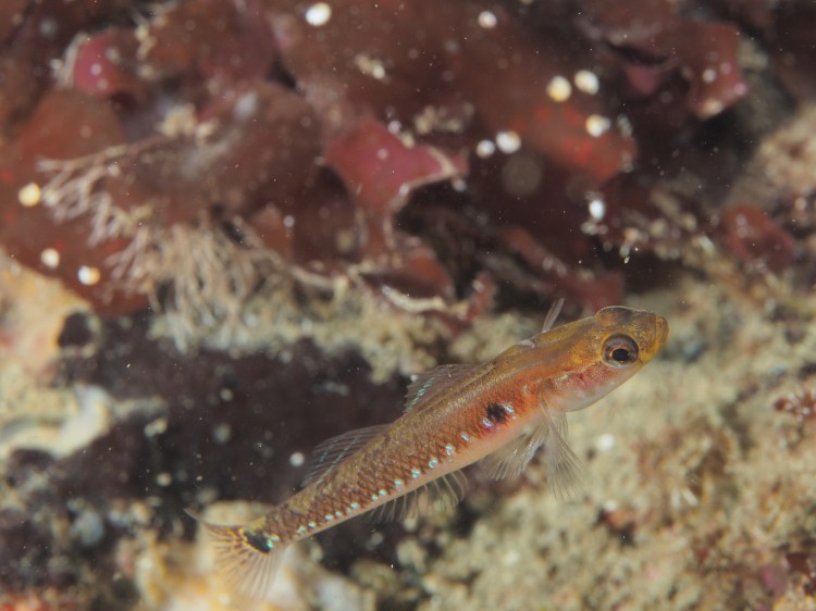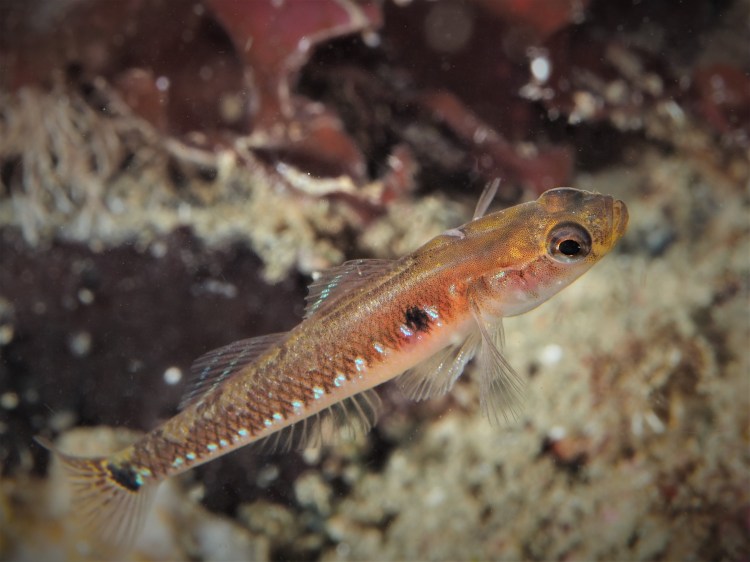 Yet another solo dive (I know, I know, not ideal) this Thursday morning before the easterlies are kicking in. Actually, the water was already choppier than I expected, but for macro photography the viz is not as important. I did not get ‘the’ shot but it was a nice dive all around. I discovered a little swim-under and saw lobster, rock lobster (craw fish) and a huuuuge conger eel. I was focusing on a little tunicate when I looked up and saw it looking back at me from not very far away at all. Its head was as big as mine. I slowly swam backwards, thinking of this encounter…..overall they do seem to be aggressive towards people though, and with my fisheye lens this could have been a really good shot. This later happened again, this time a smaller individual but still sizable. I did not stick my macro lens up its nose but grabbed a halfhearted shot with a passing by Twospot goby almost in focus to give an idea: