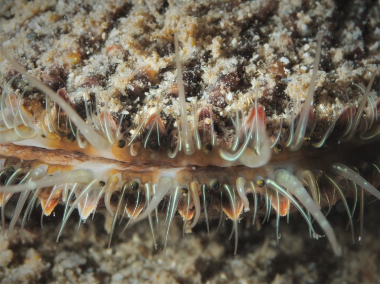 A quick snorkel in the rockpools today. Tried to photograph some gobies and prawns but they were not very cooperative. I noticed a small clam under an overhang: the Variegated scallop Mimachlamys varia (old name: Chlamys varia). This species occurs quite commonly attached under rocks here, and although it can have all kinds of amazing purple, yellow and orange colours it is usually a dull brown. I managed a couple of OK shots; it is fun to see the rows of eyes. Definitely worth trying again (and going for a much bigger Scallop Pecten jacobaeus while diving should be fun too).