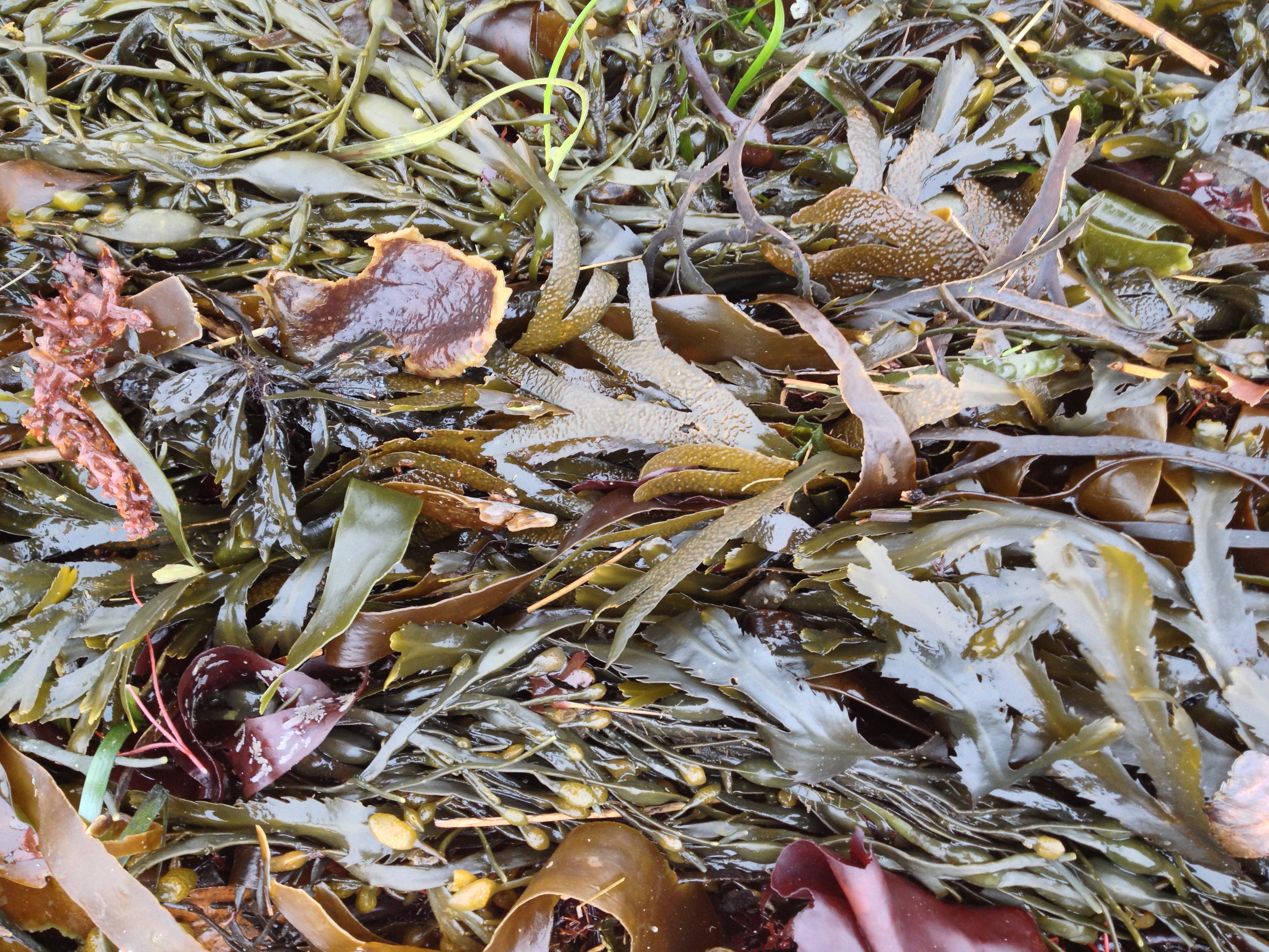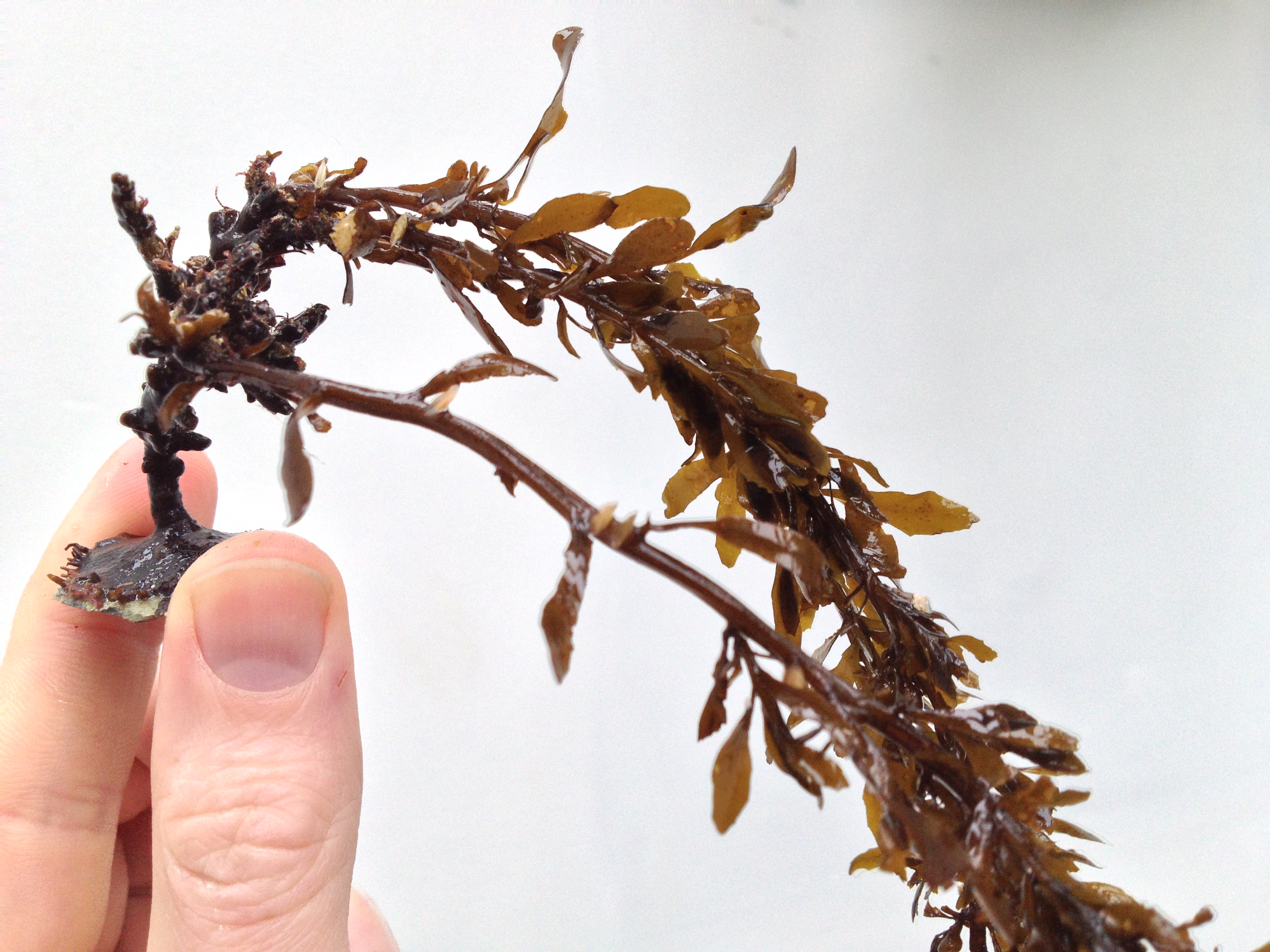 The above picture is of Grape pip weed Mastocarpus stellatus. Like many seaweeds, it is very firmly attached to the rocks. Ripping it off results in a handful of separate fronds which will just float around when transferred to the aquarium. Such species (see here for another example) can only be brought over to the aquarium attached to a rock. Some species readily grow on smaller rocks (Solier’s red string weed often is washed up attached to shells) but others don’t. It is possible with suitably shapedseaweeds to weigh them down using a piece of string and a pebble. (I am not sure about the lead weights used to weigh down plants in freshwater aquariums; on one hand lead is toxic, but on the other hand a layer of lead oxide will form around the weight which prevents leaching. Leaching should be less of a problem in salt water which is slightly alkaline anyway. I’ll stick with pebbles in any case!) Some seaweeds on Castle beach in Falmouth when pulled from the substrate take with it a shard of rock, which makes it easy to anchor them in the aquarium (check):