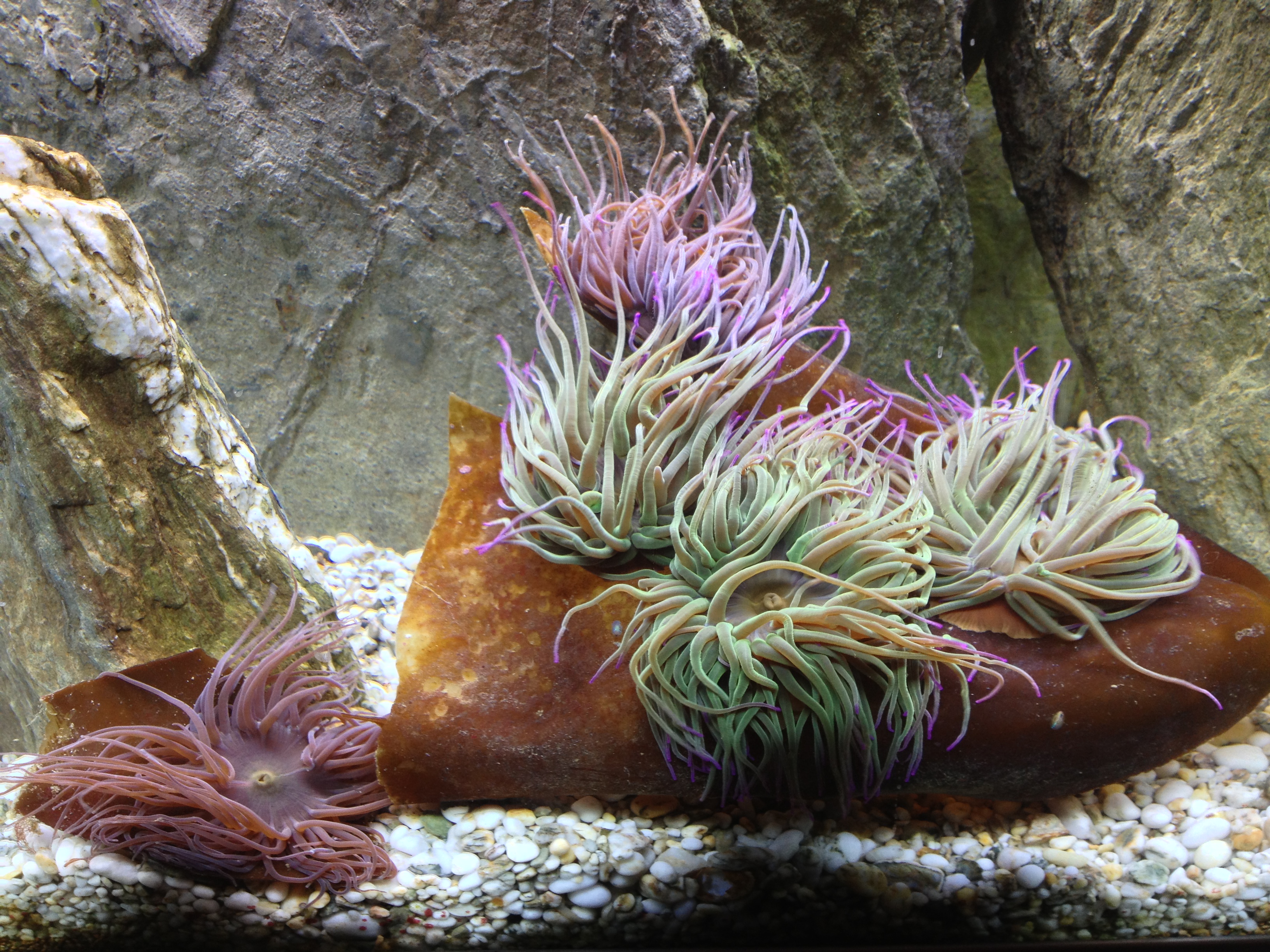 The anemones are still so-so. I think that plumose anemones need very fines foods and water changes, which I do not really do and as a result they are often closed and not growing. The strawberries and beadlets still don’t do as well as they did, no idea why. My Red-speckled anemones (Anthopleura ballii) on the other hand do great and are my favourites. Below a photo of a specimen I collected at a good low tide in Flushing this week and one in my aquarium that has grown quite a bit. It fluoresces in the middle.