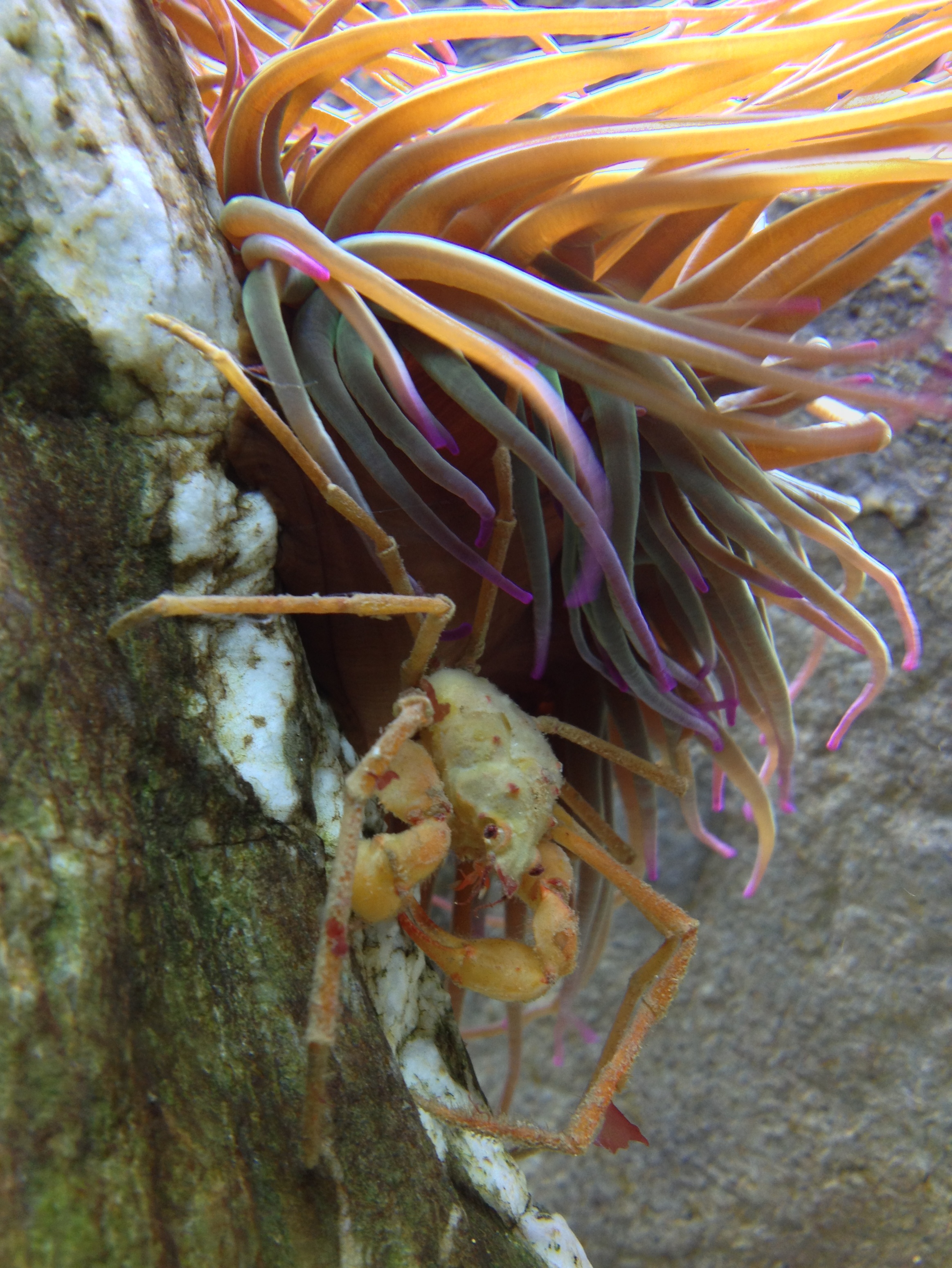 With some finicking I could get the anemones off the kelp and on the rocks or gravel. The Leach’s spider crab (decorated with small pieces of red seaweed) quickly hid behind a rock. However, after two days it was accustomed to its new surroundings and found a place underneath one of the anemones right in the front of the tank: