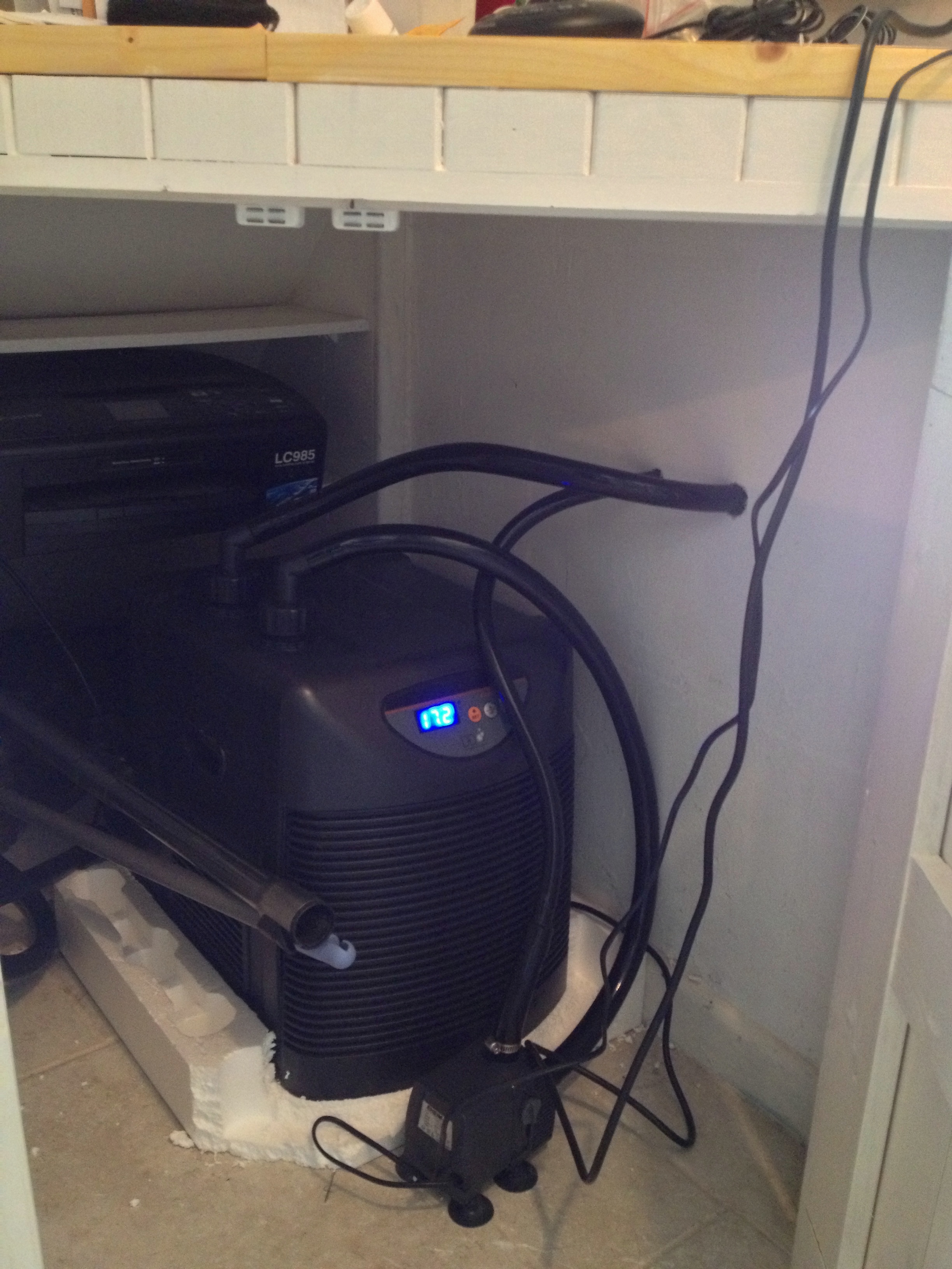 After a year and a half of running a supposedly cold water aquarium at room temperature (usually above 20C), I have finally bought a chiller! I found it very hard to choose between the several available brands, with mixed messages on forums about noise, ventilation and size. In the end I decided on a D-D DC300 chiller; however, the supplier was out of stock and suggested to take the 750 Watt model instead. As it was not that much more expensive and as running a larger chiller at shorter intervals is more econonomical (and also after a year of indecision I of course could not just wait for a couple of extra weeks), the D-D DC750 chiller it was. I ordered an Eheim compact +2000 pump (1000 to 2000 l/hr) to go with it online and got some insulated tubing from my local stoner hydroponics guy. When the chiller arrived it was a lot bigger than I thought. I placed it in a kitchen cabinet out of sight, and hopefully hearing, and with help from friends drilled two holes in the wall to the living room, to lead the tubing up to the tank: