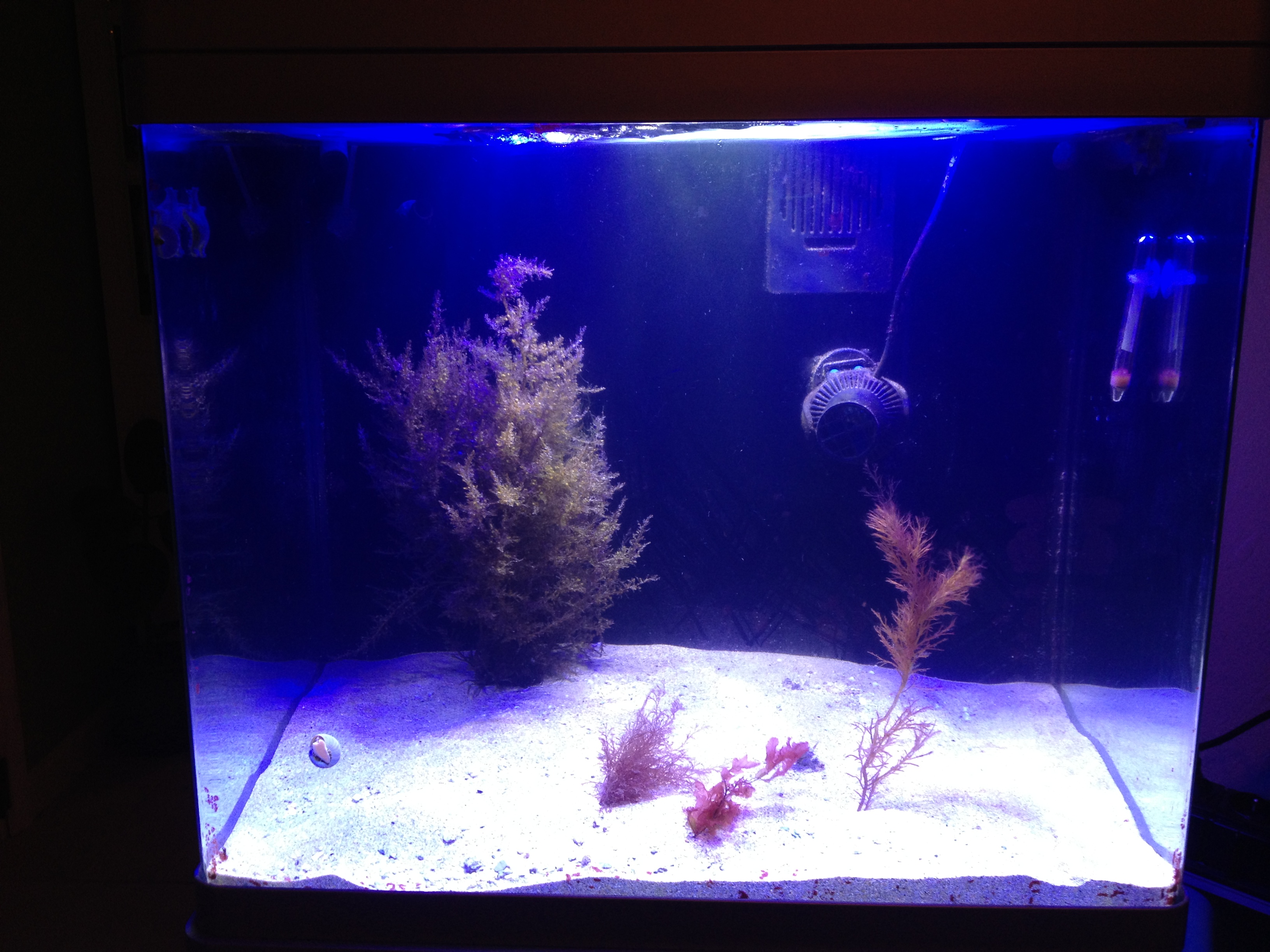 I have put in sand instead of gravel which looks nicer. I have put in some Wireweed to provide some competition for algae now the light are back on (I could not resist sticking in some red seaweeds I found). Some cushion starts and topshells were left, but with the chiller and LEDs in place it is time to get properly get back to collecting animals and seaweeds. Marius has raised the bar pretty high on his Irish Rockpool Aquarium blog, so let’s see how it goes!