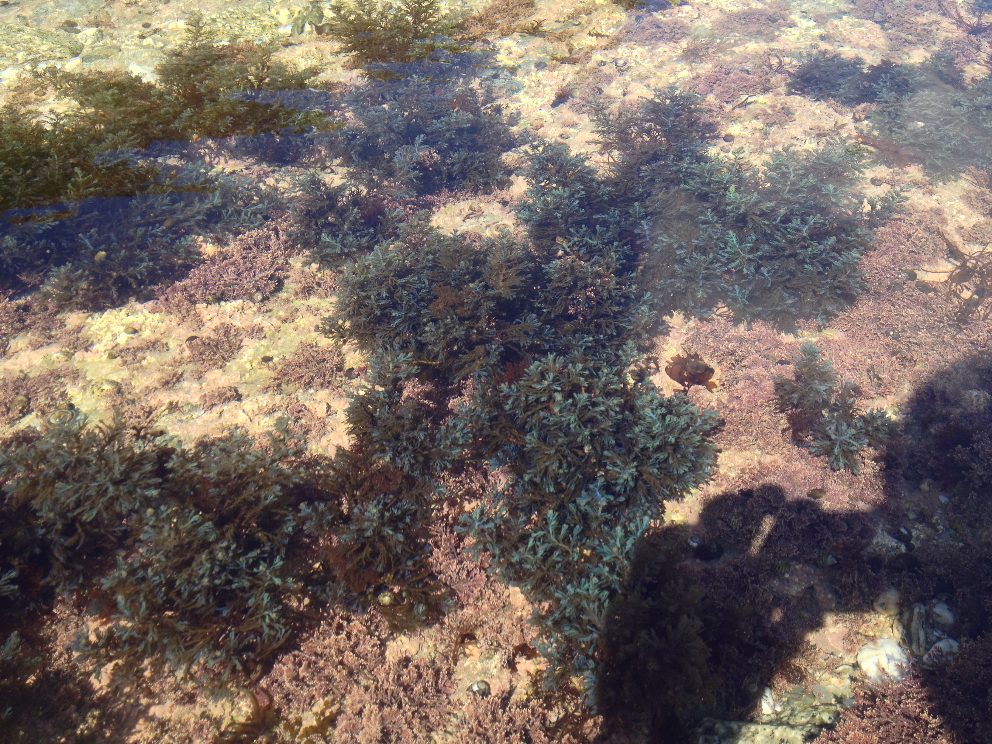 I could not attach the fine red seaweed (see last post) either and did not want to have it floating around so I have removed it. My nice red seaweed streaming from the pump outlet, most probably Devil’s tongue weed Grateloupia turutu (as the name indicates, another invader from the Pacific), broke of. A crap picture of both weeds: