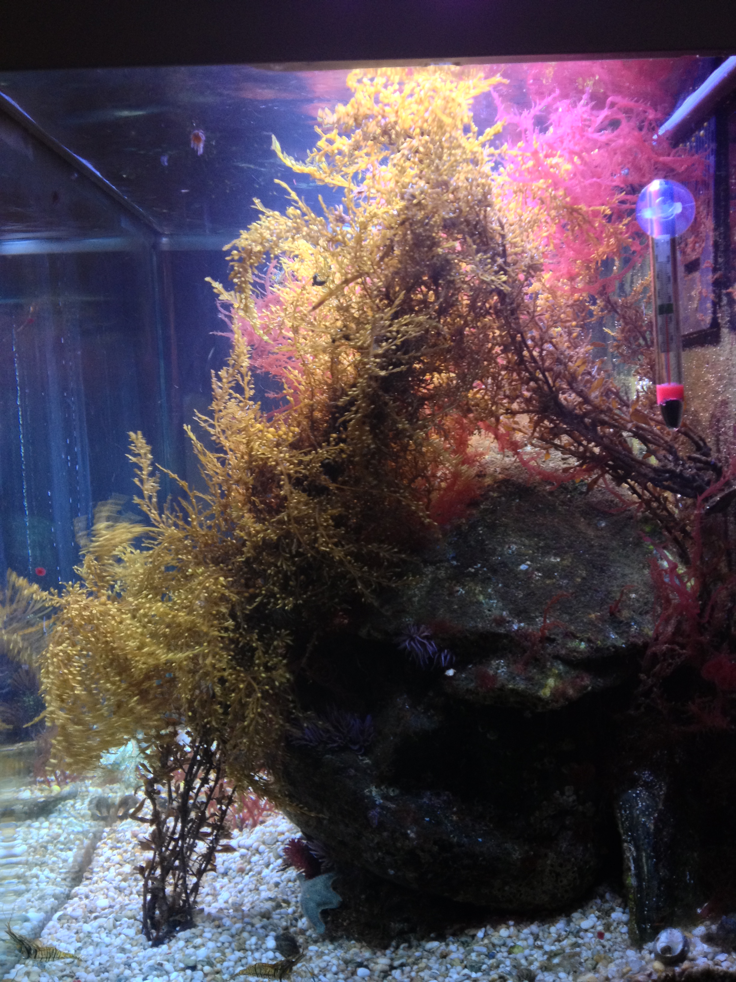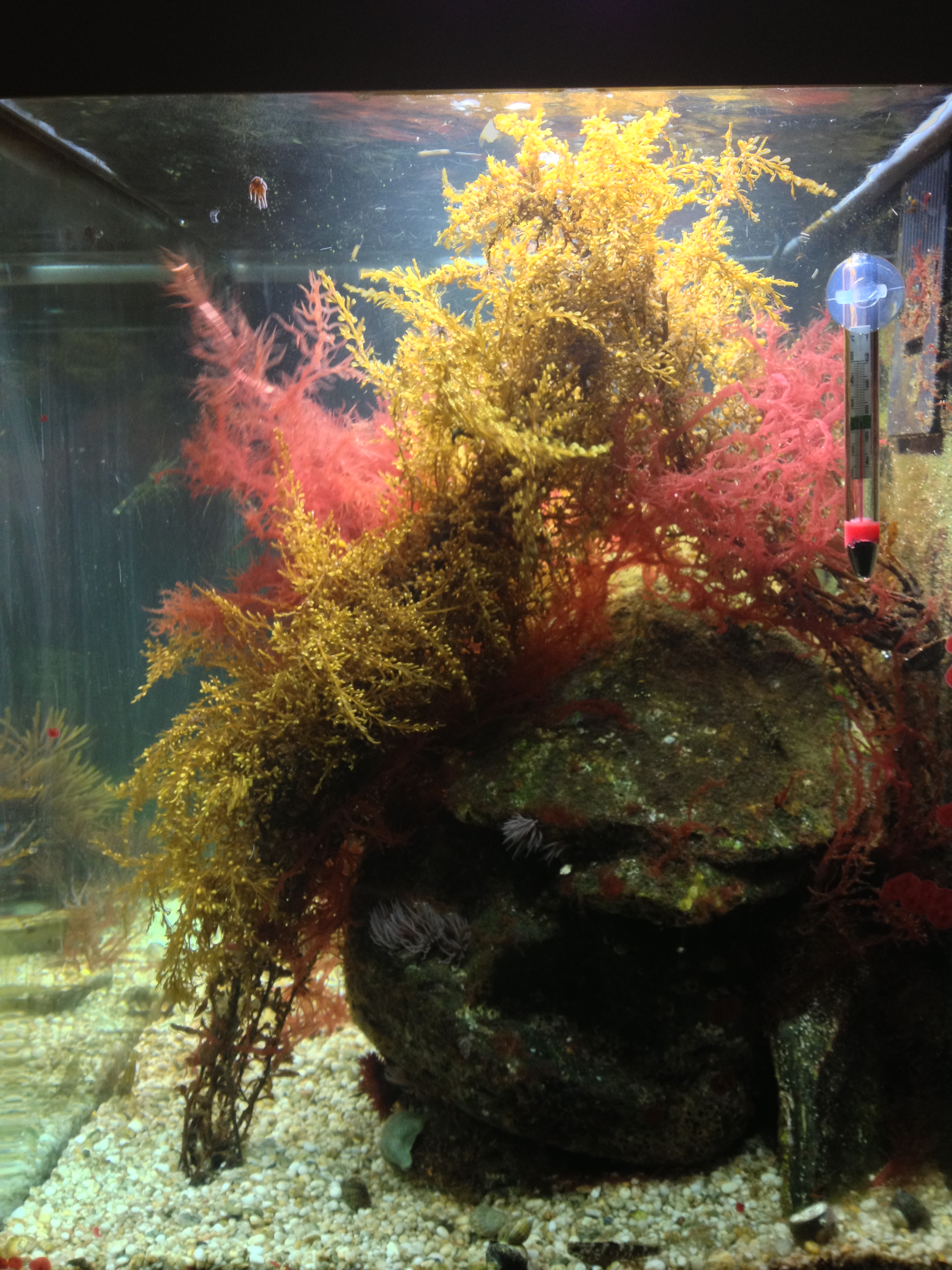Welcome to this most obscure of blogs, my dear reader. The aquarium is a bit of a mess at the moment for a variety of reasons. First of all there are a lot of algae growing; I have a bag with Rowaphos hanging in the back compartment to remove phosphates but this does not seem to help much (I have had good experiences with before though). Second, one of my pumps broke and so filtration runs at half capacity. Third, the mixed success of planting many different seaweeds has left loads of detritus in the tank. I have made large water changes which helped a bit. An additional tank for experimenting would be nice to have… Fourth, I have been unlucky with some of the seaweeds: the Wireweed grew really well, but the large size meant it caught a lot of the current and was easily dislodged. The Dudresnay’s whorled weed Dudresnaya verticullosa was growing really well (see here) but broke off from the rocks and could not be replanted: