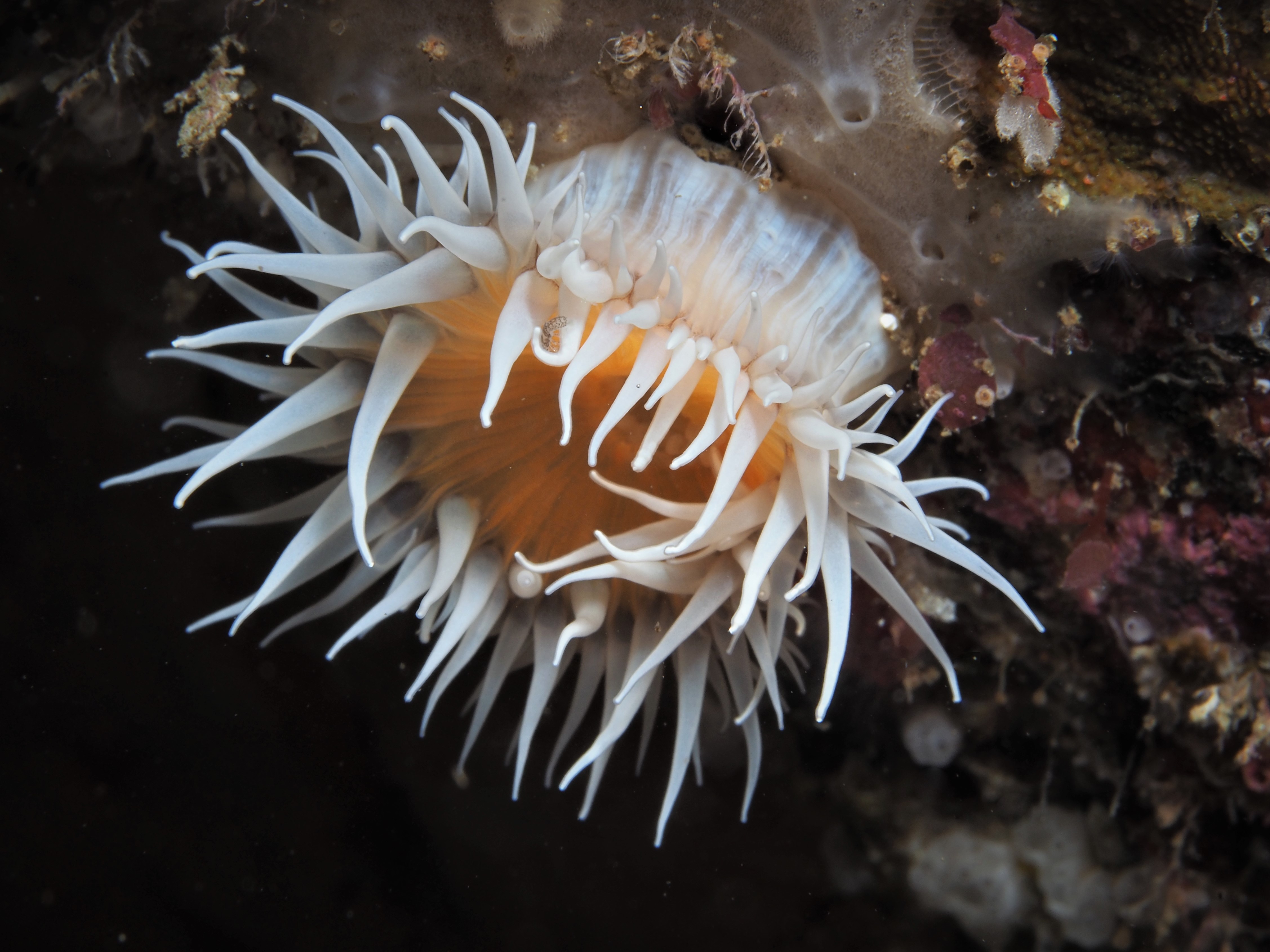 Many other critters were found too and I took shots of a selection. First, a Sea Spider, all legs and crawling away. A tiny mat of colonial tunicate that looked like a persian rug on drugs. A quick shot of the ubiquitous (if you know where to look – on kelp fronds) blue-rayed Limpets and a stalked jellyfish. Finally, I spent a lot of time taking shallow-depth-of-field AND slow shutter-speed photos of a scorpion spider crab in a snakelocks anemone to get some sort of ‘artistic’ shot. It did not really work, but it was fun nonetheless and I will have a go at it again. After almost 2,5 hours in the water I stumbled back to the car to get changed – an afternoon well-spent!