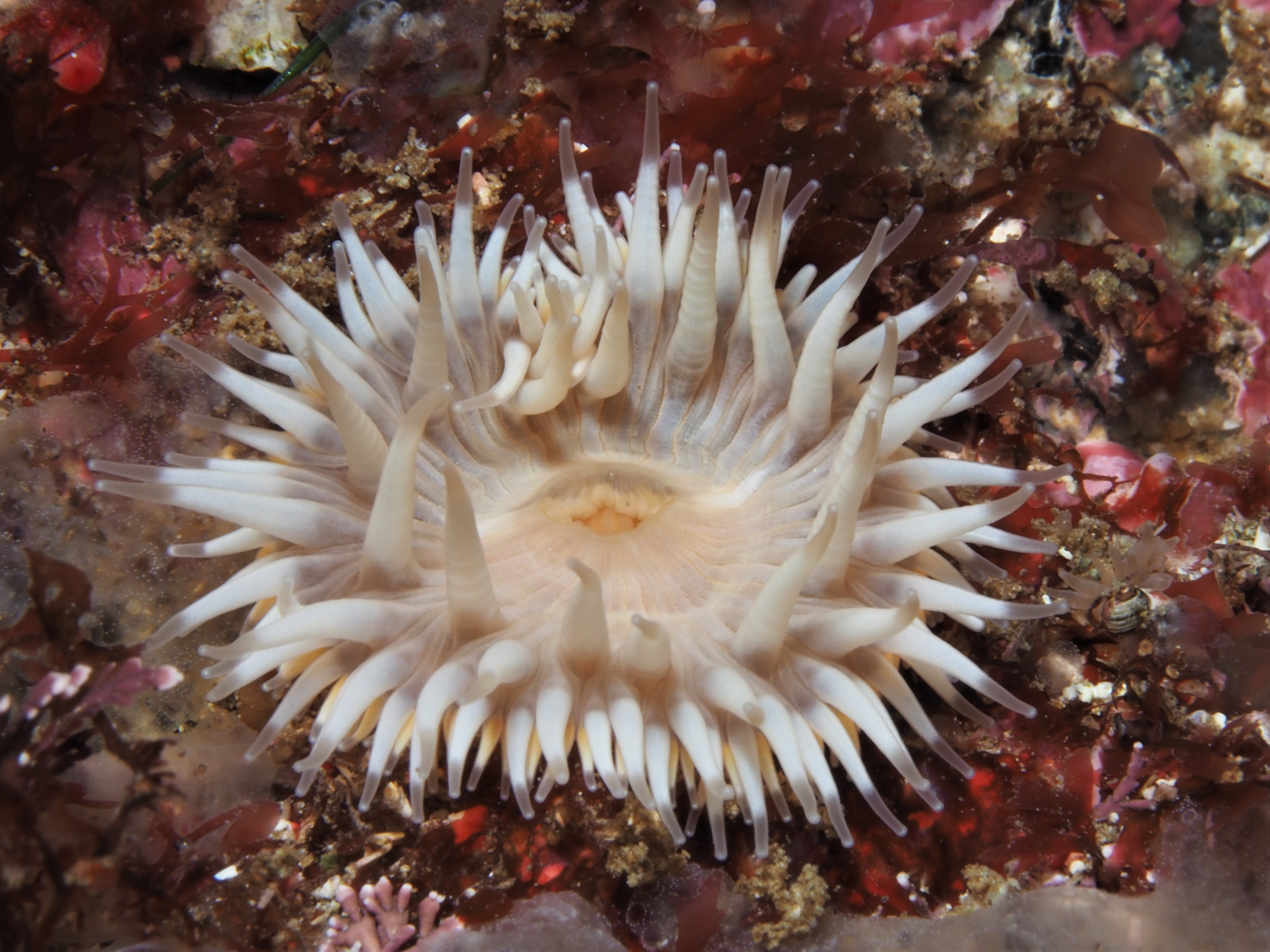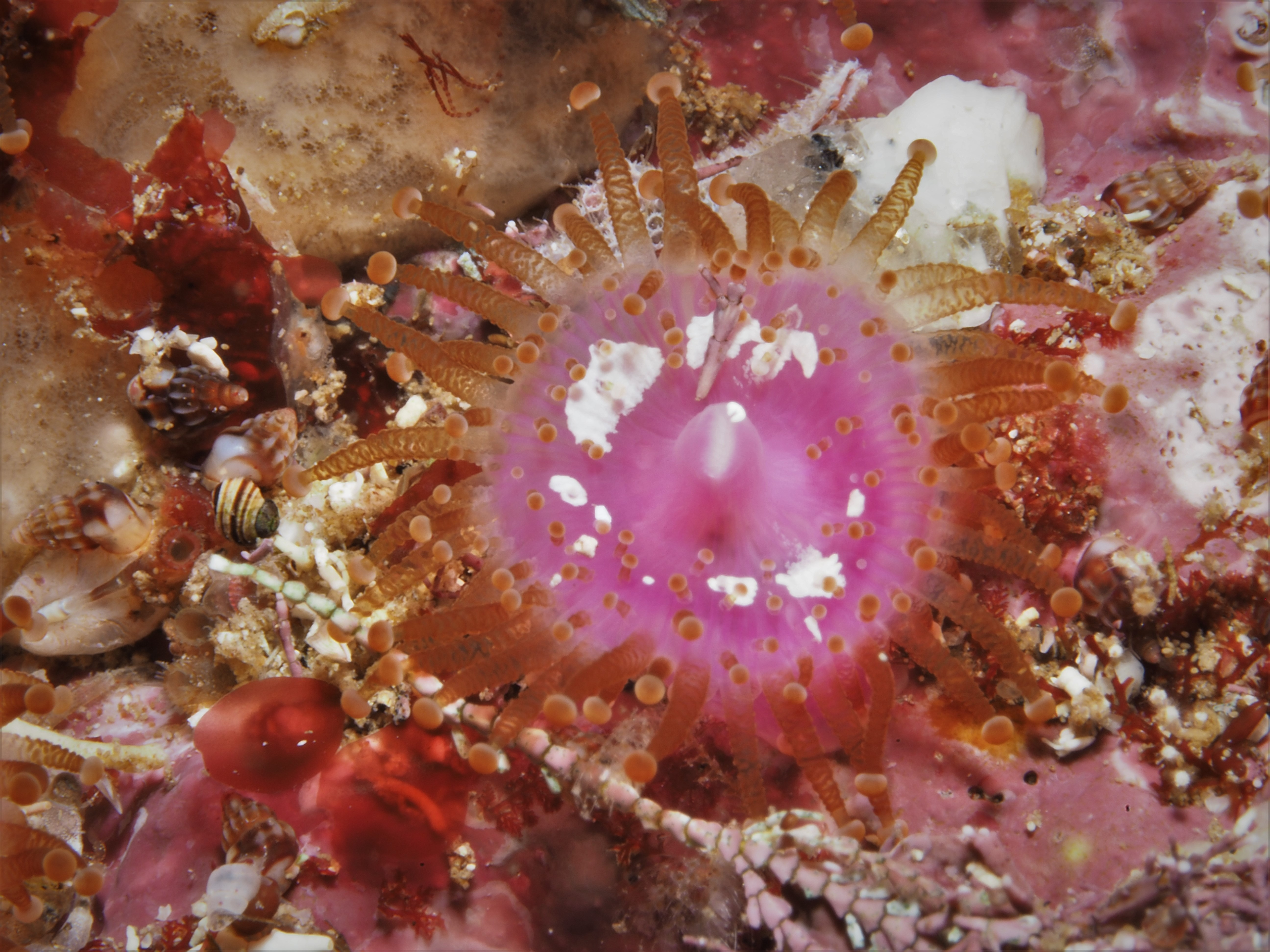 Jewel anemones were indeed found in this spot….the water was too shallow to take a good photo though. I therefore jumped in the water where at first I got a bit seasick of all the waving Furbelows kelp. The water was noticeably colder than on the South Coast too. I discovered a nice deep gully with a whole variety of sea anemones growing on the vertical rock face. Orange, purple and green Jewel Anemones (Corynactis viridis) were common from 6 meters deep (at low tide). Very tricky for this middle-aged man to take good photos on one breath though! I was stumped by one white anemone but as Dave pointed out it looked like a Dahlia Anemone (Urticina felina) (and multiple ‘normally’ coloured individuals lived nearby so that makes sense). Finally a Sandalled Anemone (Actinothoe sphyrodeta) (my photos of the White-striped Anemone Anthothoe albocincta were unfortunately out of focus).