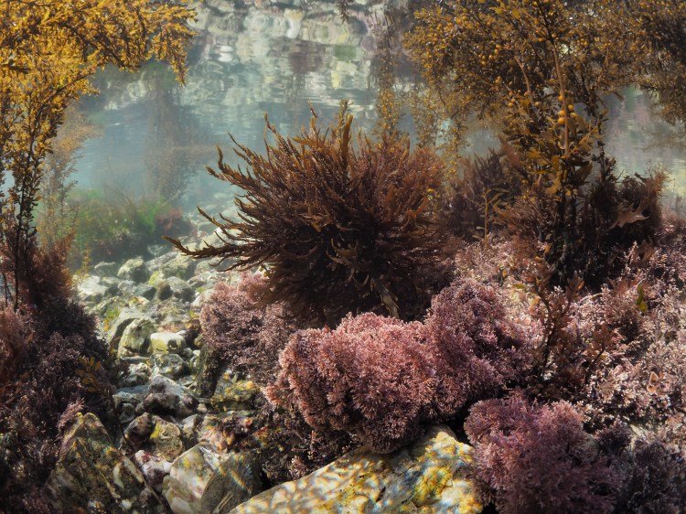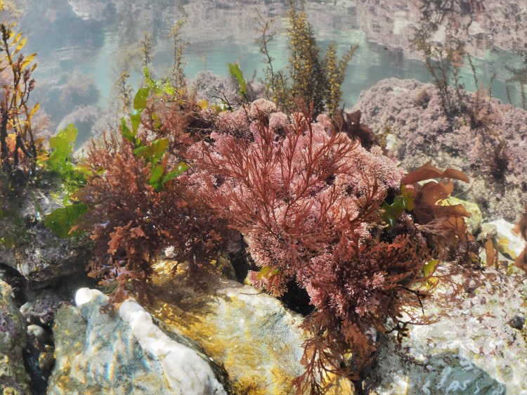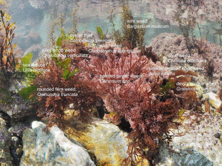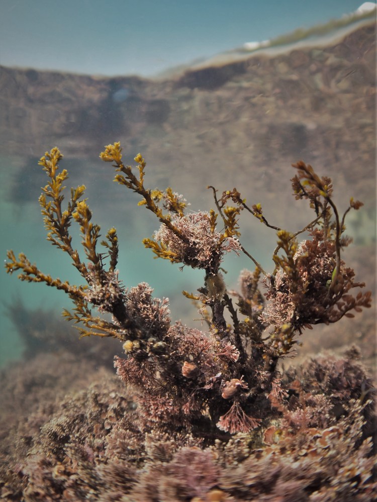 Below, Thong Weed Himanthalia elongata, Little Fat Sausage Weed Champia parvula and Juicy Whorl Weed Chylocladia verticillata and a bit of Bushy rainbow wrack Cystoseira tamariscifolia covered in red epiphytes.