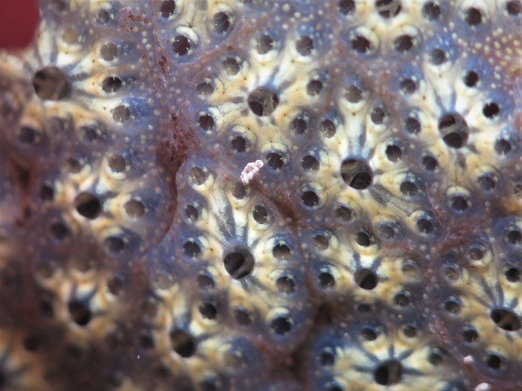 I recently posted my first photos taken with the nauticam CMC macro wetlens using stalked jellyfish as a subject. I since lost my lens, which I in large part blame on the bad fit of the adapter with which it is attached to the housing. The best thing in these cases is not to agonize over it too much, order a new one straight away and keep going, so that is what I did (also I am now a bit more careful of course). Here some more photos of macro subjects. Above a very easy subject as it is very common this time of year and also it does not move….Paddle worm egg capsules (probably Eulalia viridis clavigera). The individual eggs can be just made out in the gelatinous blob. Below, one of the more common nudibranch species Polycera quadrilineata. Nudibranchs come in all kinds of stunning colour variations and are very species rich and so are a favourite of macro photographers (see this old post hunting for them with David Fenwick in Newlyn, and check out the NE Atlantic Nudibranch facebook page for lots of eye candy). Tricky with the narrow depth of field to get the whole animal in focus. Mysid shrimp are quite common and beautiful little animals hovering about in small groups. They need dissection to determine which species it is, but this might be Leptomysis lingvura (around 10 mm). Finally, the colonial star Ascidian Botryllus schlosseri; these form colonies (‘systems’) where zooids have individual inhalant openings and a shared exhalant opening. They are common, sessile, flat, and come in a range of colours so they make ideal subjects for a beginning macro photographer. Not only that, apart from fish they are our closest relatives in rock pools, which is most obvious in the tadpole-like larvae which have a dorsal notochord (a cartilage rod functioning as a backbone). I hope to devote a post to them later in the year.