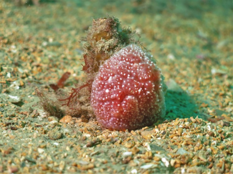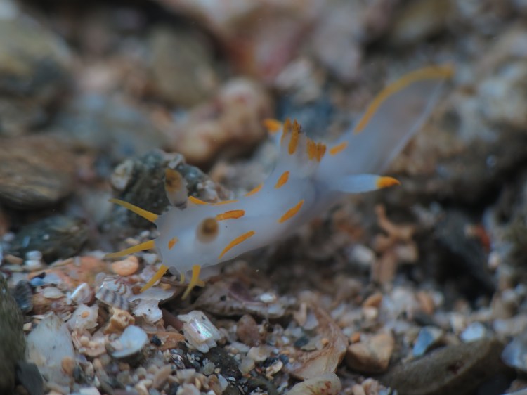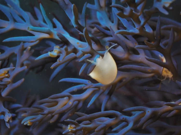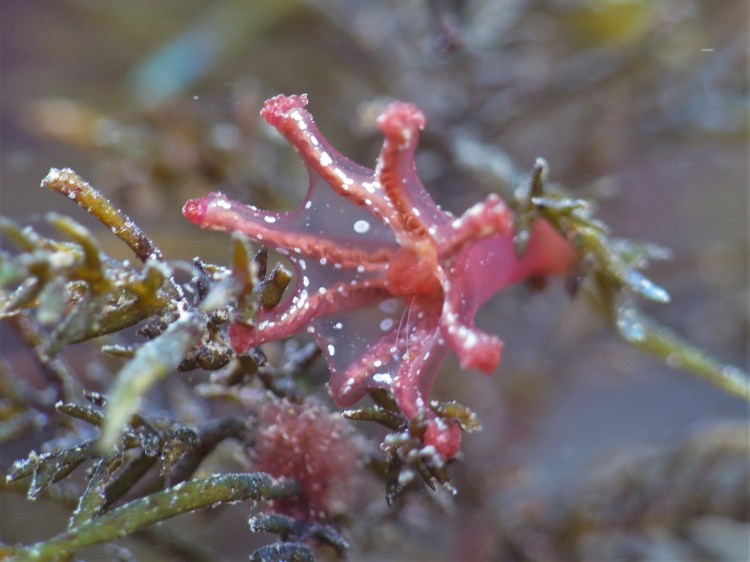 Another difficulty is working the strobe. Unlike the ‘normal’ ambient light photography I am used to, the image after clicking is different from that seen through the viewfinder so it is trial by error. Often the subject is not properly exposed. Also, floating particles cause backscatter. Perhaps I should try a snoot to minimise this effect, which can ruin an otherwise decent (in focus) photo, like this one of a Stalked jellyfish Haliclystus octoradiatus which are common at the moment. (Notice the tiny molluscs on the seaweed in the background.)