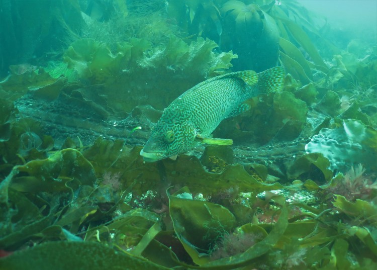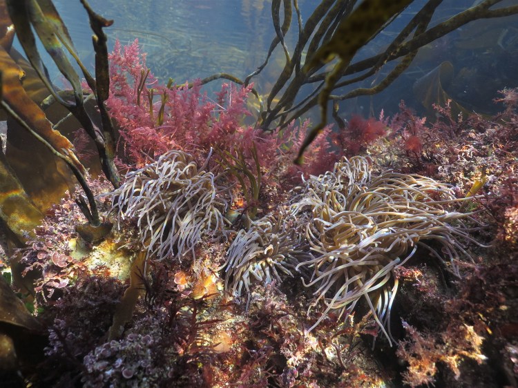 Was last Wednesday the last sunny day of the year? It might well have been and so it was good I had taken a day off to drive to the north coast for some rock pool snorkeling at Trevose Head near Padstow. A beautiful, empty beach at Booby’s Bay led to the low cliffs of Trevose Head. I did not make it that far up the headland as there were some deep gullies and the waves were pounding below. If you slip and fall on your head you could be in real trouble on these solo outings, so easy does it. Like St. Agnes and Fistral at Newquay the pools were dominated by Brown fork tuning weed Bifurcaria bifurcata, one of my favourite seaweeds and not a species I have ever seen near Falmouth. In contrast to my local Castle Beach spot, the coral weed Corallina officinalis was not bleached but a deep purple and growing much more vigorously. I lowered myself in some of the deeper pools and although the viz was not the greatest I instantly knew the trip was worth it.