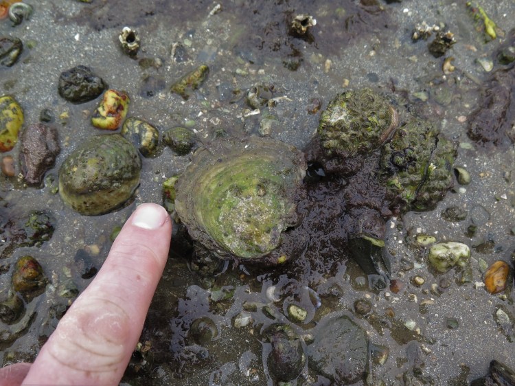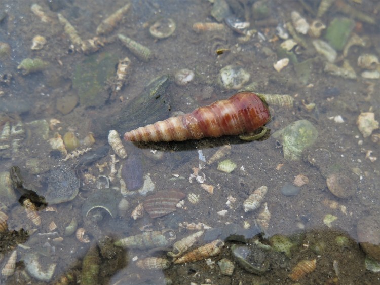 This Sunday we went on a lovely walk from Helford Village to St. Anthony in Meneage on the south coast of the Helford river. The tide was very low, so we decided to follow the mud flats for a bit before heading to the woodlands. The mud flats are a brown-grey and strewn with shells, pebbels and, unfortunately, litter. Not as pretty as the rock pools, but still interesting. There were small banks with mussels, cockels, slipper limpets and oysters, both the native oyster Ostrea edulis (quite some juveniles) as well as the invasive Pacific (or Portuguese) oyster Magallana gigas. Of course also the abundant, barnacle-covered periwinkles Littorina litorea. I saw my first Auger shell Turritella communis (which does not reflect rarity at all, just the fact that I usually stick to rocky shores); the small shells around it are Needle whelks Bittium reticulatum. Finally a Chinaman’s hat (probably no longer the prefered nomenclature!?) Calyptraea chinensis.