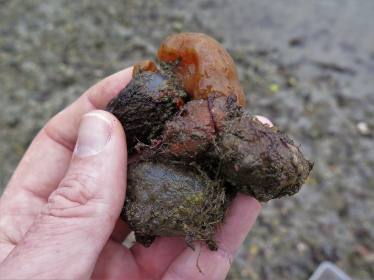 We met up with David Fenwick and partner-in-crime Carol who were busy sampling around Treath. David’s interest was caught by a mooring rope covered in seasquirts, and a boxful was collected for careful examination under the microscope later. The clump I am holding below shows the Compass seasquirt Asterocarpa humilis (red, middle) (invasive), Morchellium argus (orange, top) (native), the Dirty seasquirt Ascidiella aspersa (three grey ones) (native) and the Creeping seasquirt Perophora japonica (tiny yellow zoids connected by stolons growing over the Ascidiella) (invasive). Astonishingly, by the next day, in a single tupperware box filled with muddy seasquirts, David had found 70 species! (With 142 species recorded in total on the day.) To finish this post full of grey blobs and brownish molluscs, I am adding photos David made of four out of nine species of Heterobranchs (Nudibranchs ‘proper’ as well as Ophistobranchs) present in the sample. Stunning images and proof that there is tremendous biodiversity to be found on a muddy bank if you know how to look for it. More of David’s nudibranch work is featured in this old post. See for his continously expanding collection of images, from seaweeds to fish and from tiny marine fungi to stranded seaturtles, aphotomarine.com.