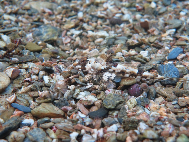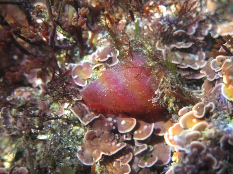 During my ‘seaweed sessions’ I of course keep my eyes open for animals too. Most prominent are the beautiful Snakelocks anemones Anemonia viridis (see also here). Other anemone species seem much more rare, such as the Dahlia anemone Urticina felina. Little schools of Mysis shrimp are very common (and very hard to photograph) but fish seem less common than a few months back. The common dragonet Callionymus lyra is (as the name suggests) not uncommon but hard to approach, the third photo was the best I could do and demonstrates how masterfully it is camouflaged (but see here what fullblooded males can look like!). Next a very pretty pink sea squirt species and a Broad-clawed porcelain crab Porcellana platycheles, completely flat so, very-well adapted to living under rocks. Finally, a tiny stalked jellyfish Calvadosia campanulata. Stalked jellies seemed to have disappeared over summer, but like the seaweeds are making a little comeback during autumn. There are not many around though, I have seen less than one per hour snorkelling (see this post for better stalked jellyfish photos; I need to work on the depth of field!).