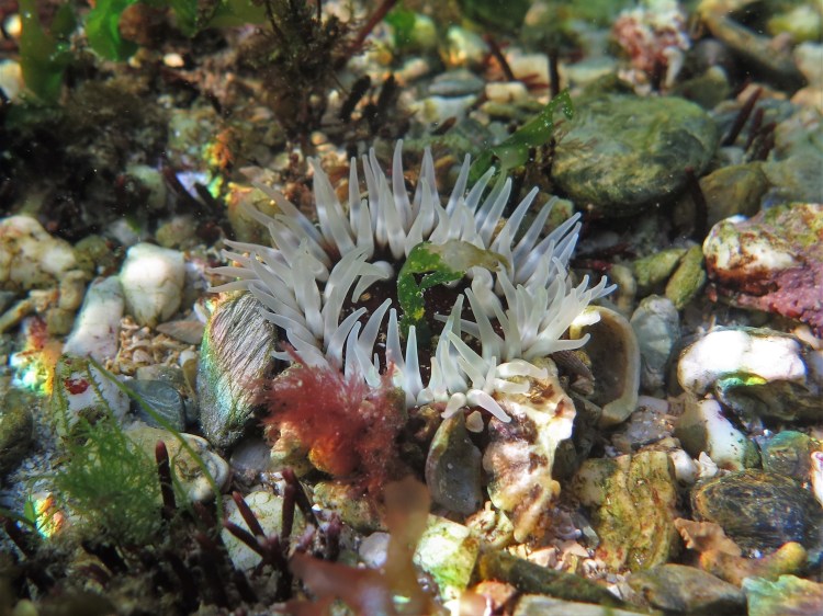 Up next three common species: a little Rock goby Gobius paganellus, the colonial Antenna hydroid Nemertesia antennina and the colonial sea squirt Aplidium elegans (thanks David Fenwick). I keep my eyes open for seaweeds too of course, there were some small red species and what I suspect is Desmarest’s prickly weed Desmarestia aculeata. I found out back on the boat that I completely missed a small octopus that Alex pointed out, argh! I was very happy though that I managed to spot an Imperial anemone Capnea sanguinea, which is an uncommon species. The photo of this all-white individual was taken without a strobe; I really should have taken more time to get a decent shot. A good reason to go back though, and maybe we can spot some cannon balls then too. The water is 13-14 degrees and so it is still doable to dive with a wetsuit.