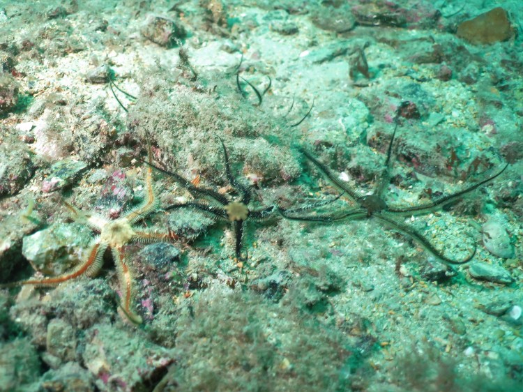 The dive today took us to the cannon ball site, roughly a mile from Pendennis Castle, and an area where many of the cannon balls fired for practice ended up. With buddy Alex we descended to around 16 m using a shot line. Again a flat ‘rubbly’ area with few fish. The seafloor was covered with Common brittlestars Ophiotrix fragilis. The viz was quite good, and it was much lighter than the previous dive. I also had *a bit* more luck with the strobe. Leach’s spider crabs were common, and we also saw some Sea lemons, Doris pseudoargus, a large seaslug.