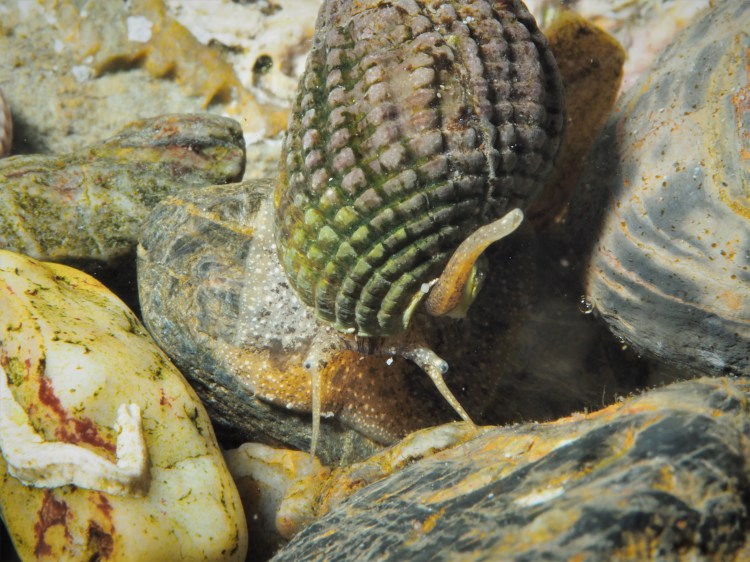 To give an idea of how tiny some things are see the photo above of the shell-less mollusc Runcina coronata (this is an ophistobranch, it does not have gills on its back as do nudibranchs), it was really, really tiny! This photo is nice for ID purposes but I do not expect I can take good photos of species this small (you reallly need an additional macro wetlens for that). I only later noticed the even smaller mollusc Flat skenea Skeneopsis planorbis next to it. (I identified this species using the excellent new Essential Guide to Rockpooling by Julie Hatcher and Steve Trewhella by the way, highly recommended!). I also noticed I need to clean my finger nails! (More tiny molluscs were present, including Eatonina fulgida.) Next, the mollusc Tritia reticulata (which I knew under the names Nassarius reticulatus or Hinia reticulata….) or Netted dog whelk in common parlance. These are very active and fun animals. The macrolens really brings out how battered and overgrown the shell is and the beady little eyes also stand out. A little hermit crab posed nicely as well.