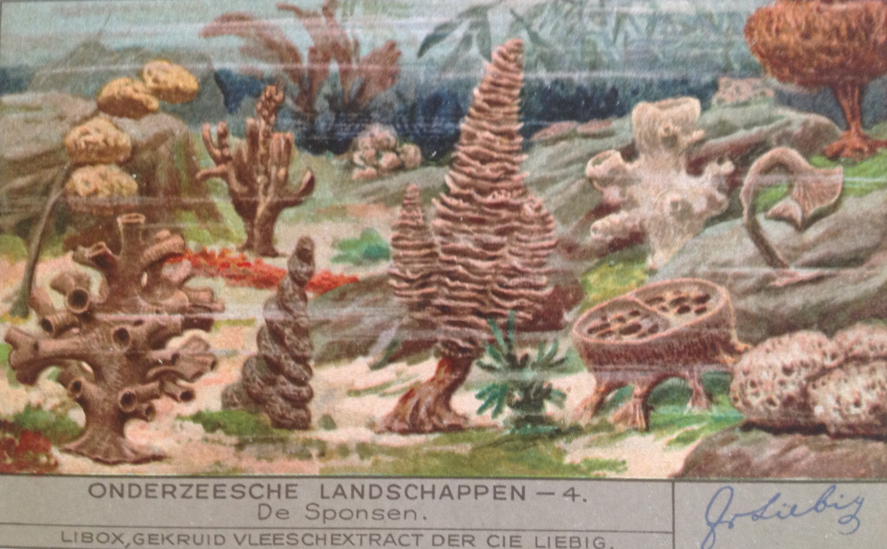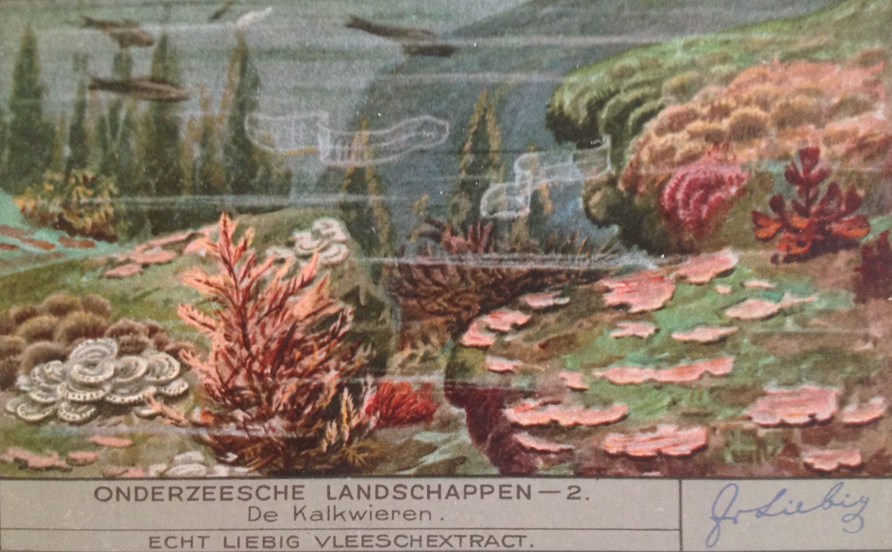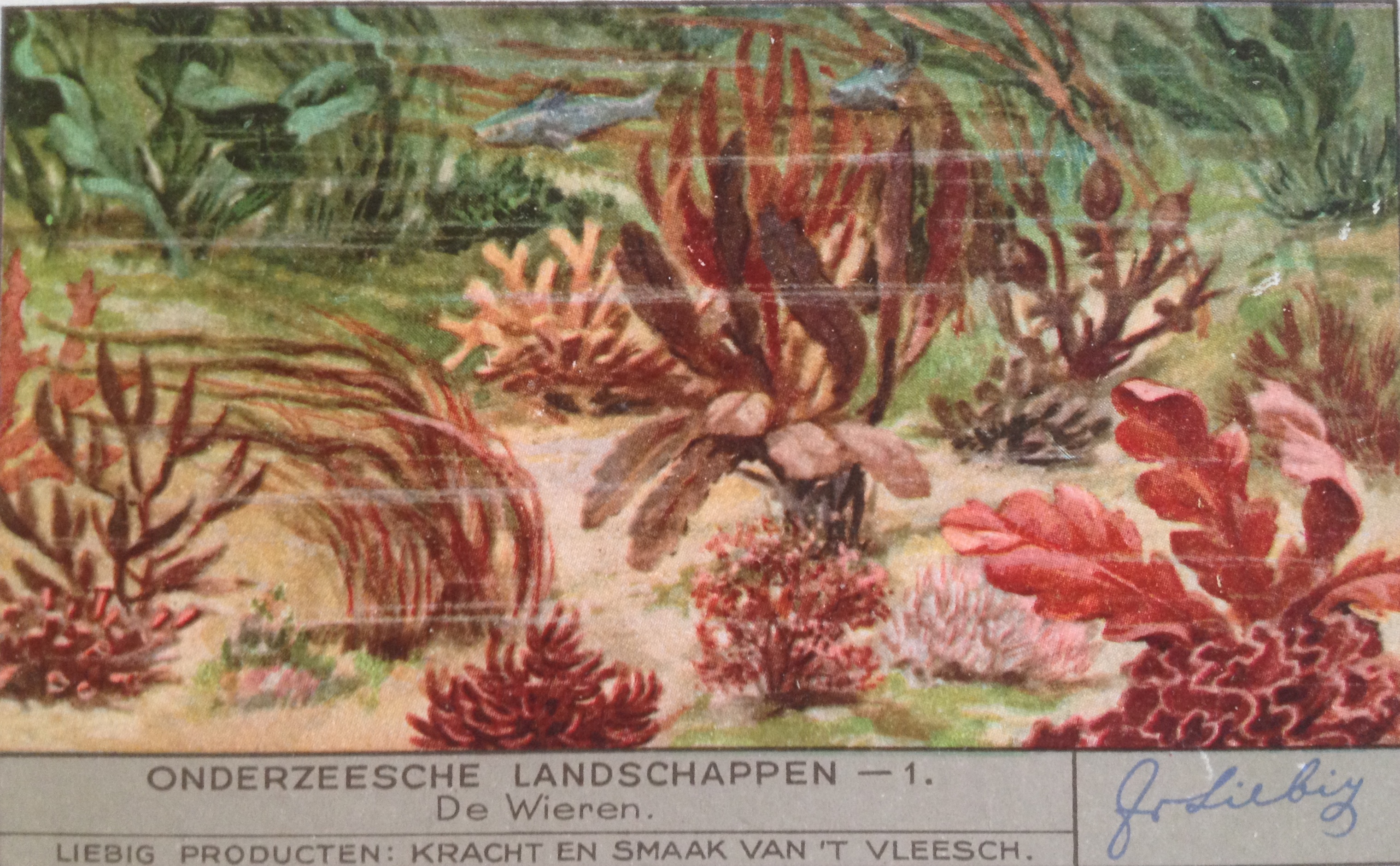 Thus the old Dutch spelling of “Undersea Landscapes” (the English word ‘landscape’ comes from the Dutch word ‘landschap’ btw). I bought some Liebig Cards online; these free collectible cards were supplied with stock cubes and included many biology-themed sets. Besides this set (1936), I also found a seaweed set (1937, in French), cool!