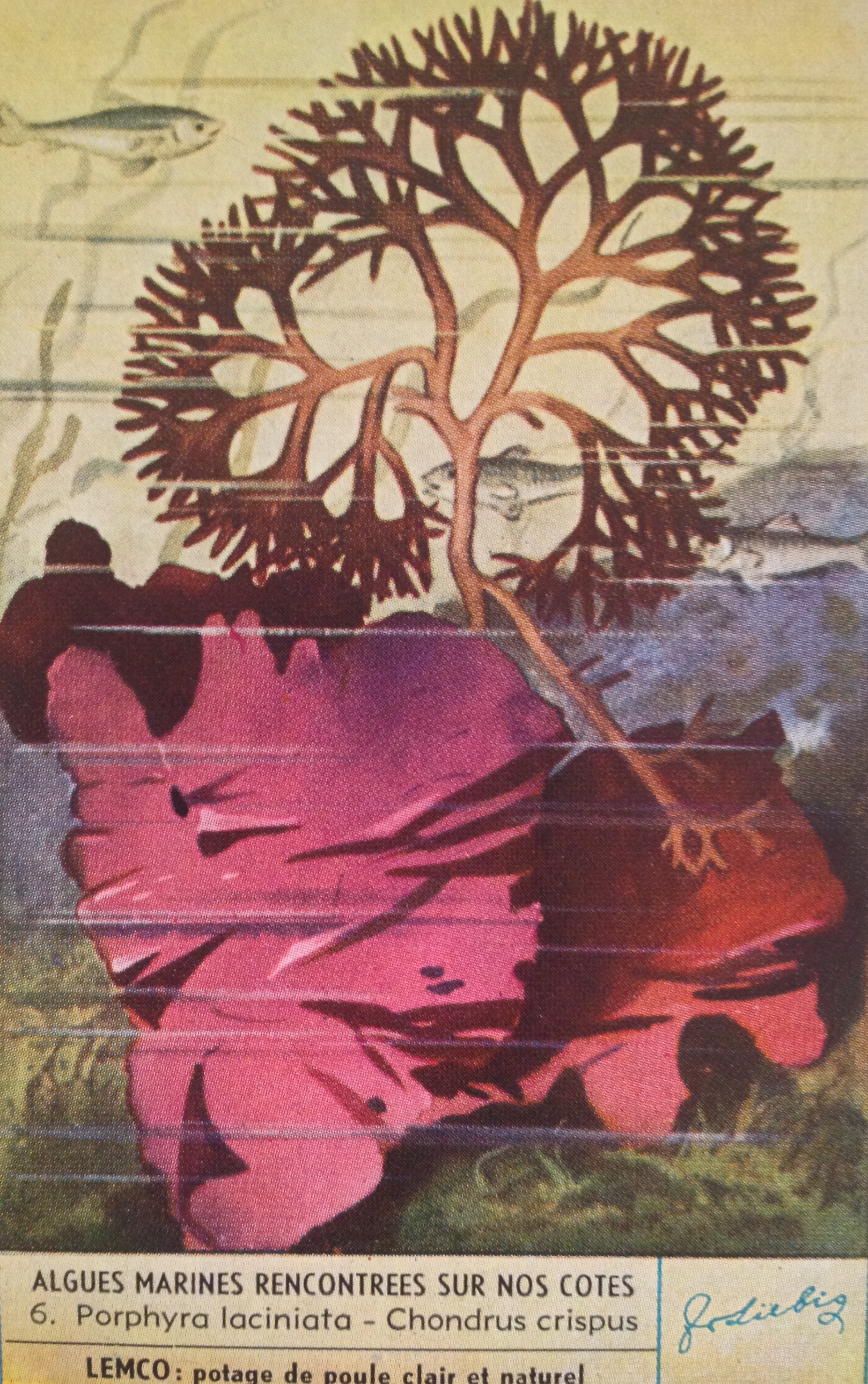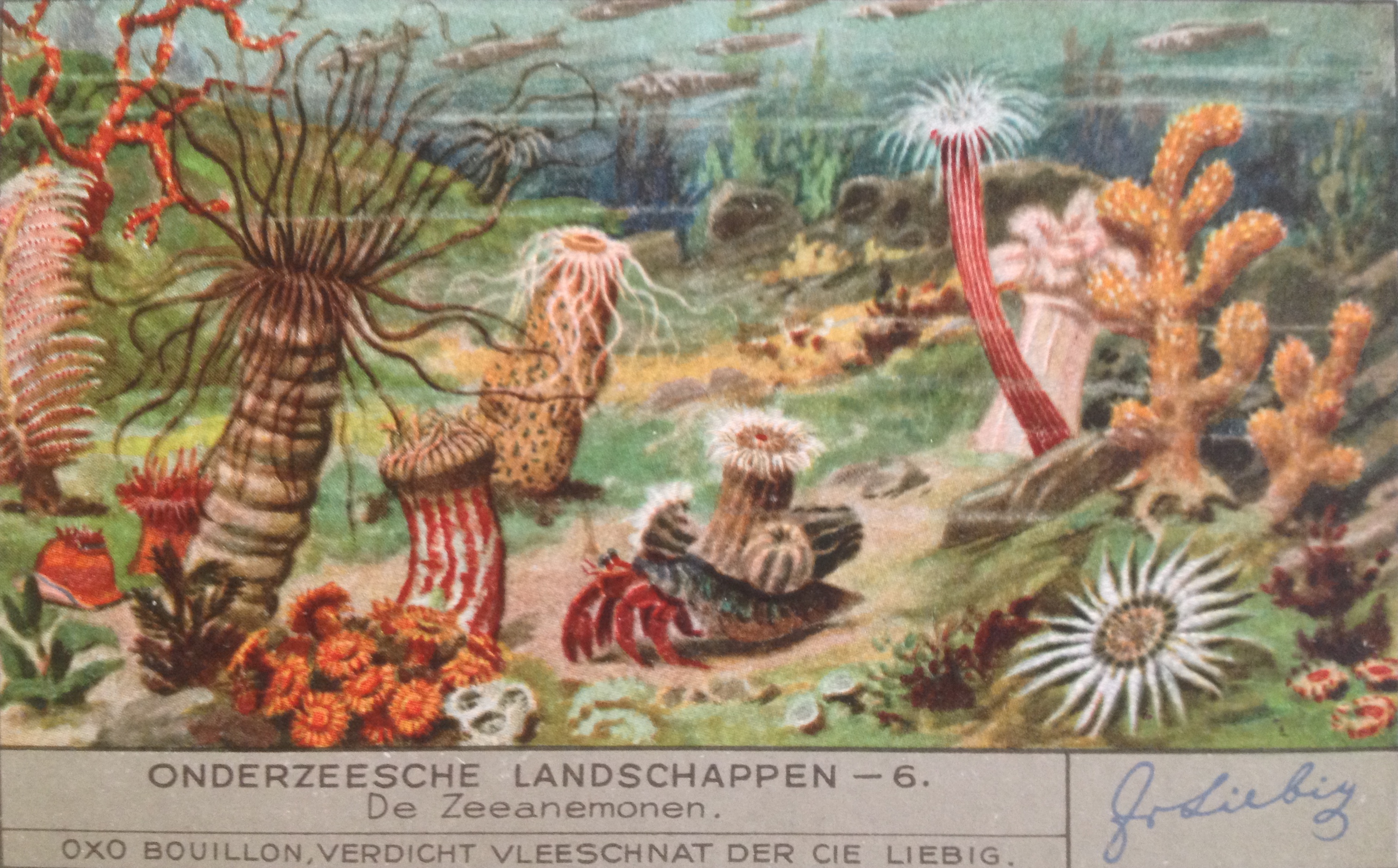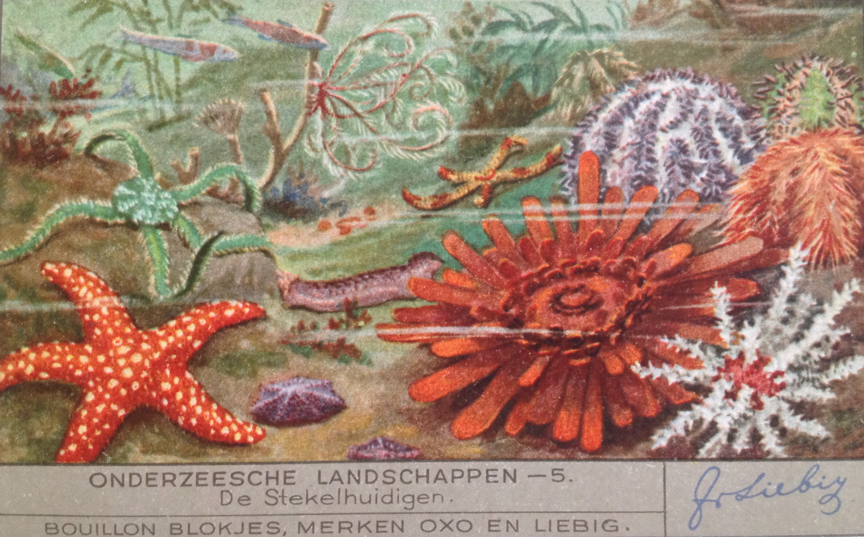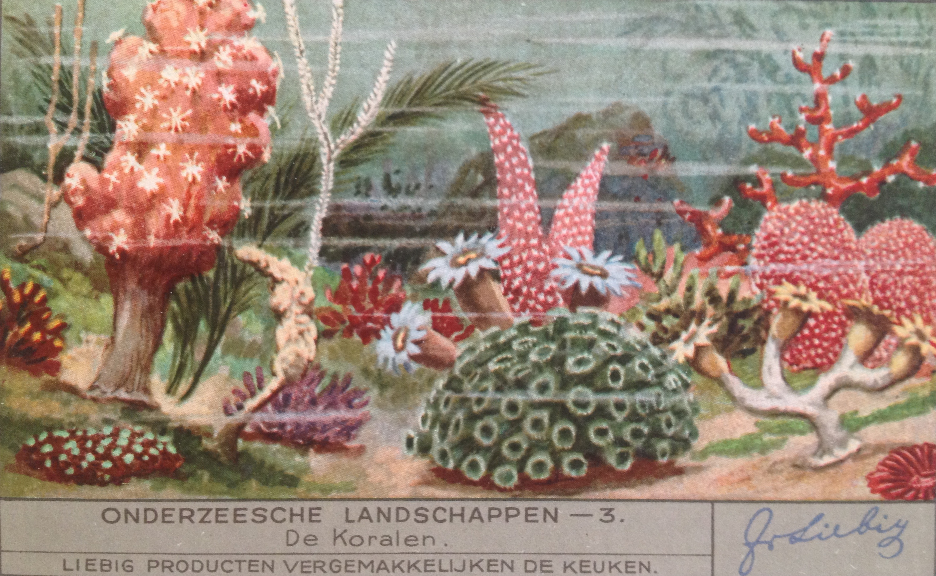 Thus the old Dutch spelling of “Undersea Landscapes” (the English word ‘landscape’ comes from the Dutch word ‘landschap’ btw). I bought some Liebig Cards online; these free collectible cards were supplied with stock cubes and included many biology-themed sets. Besides this set (1936), I also found a seaweed set (1937, in French), cool!