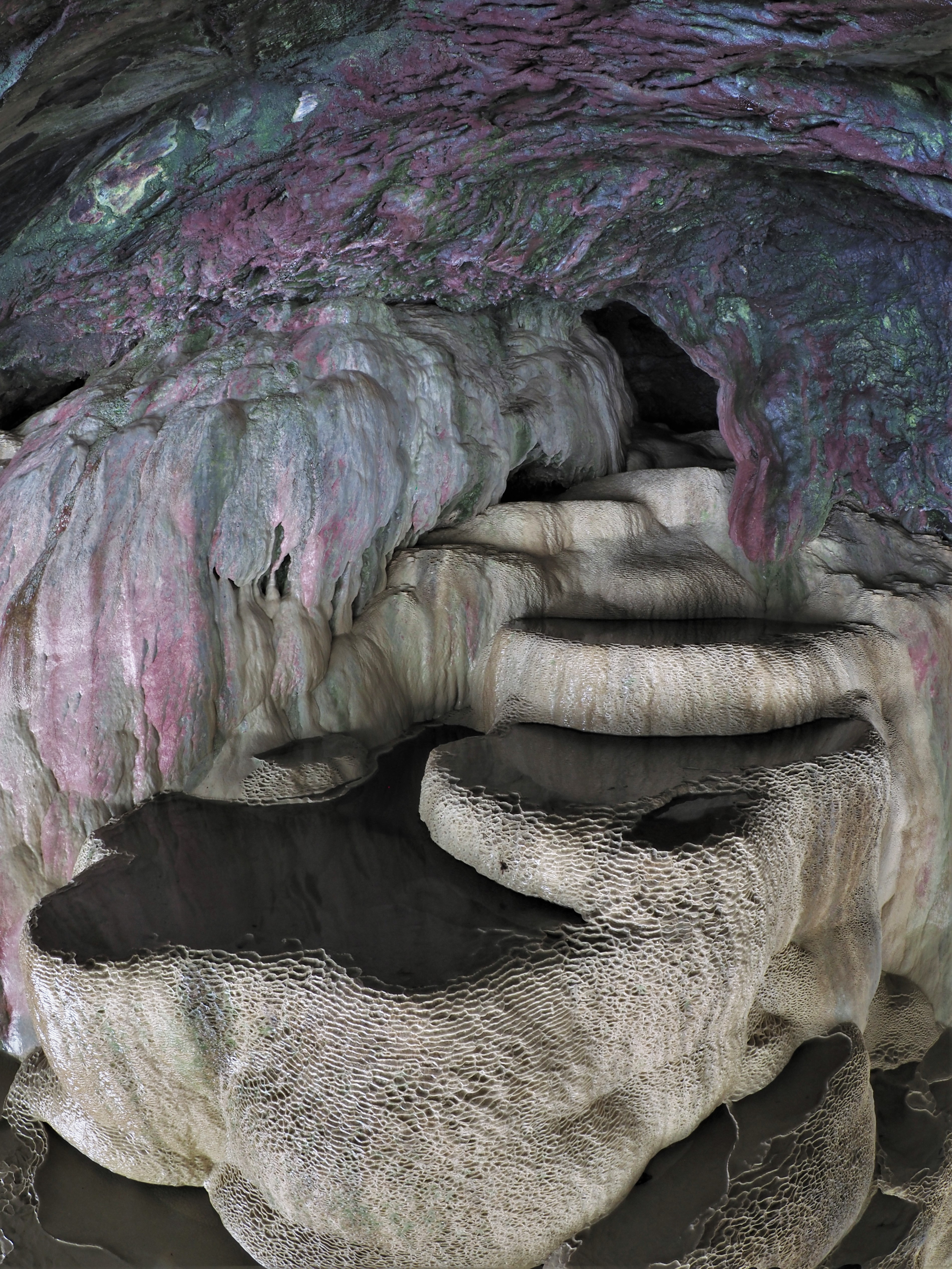 The formations result from a rare (in Cornwall) limestone deposit in the roof of the cave. Slightly acidic rainwater percolates through this limestone, dissolving calcite and becoming enriched in calcium bicarbonate. When the water drips down the rocks, the process is reversed and calcite precipitates, especially in areas where the water moves a little, causing CO2 to gas off. This results in the dam-like rimstone (or gours) formations. The tiny ‘rice terrace’-like formations on the dams are called microgours. I’d like to go back one time to experiment more and also to take some macro photos of the microgours and colourful microbes.