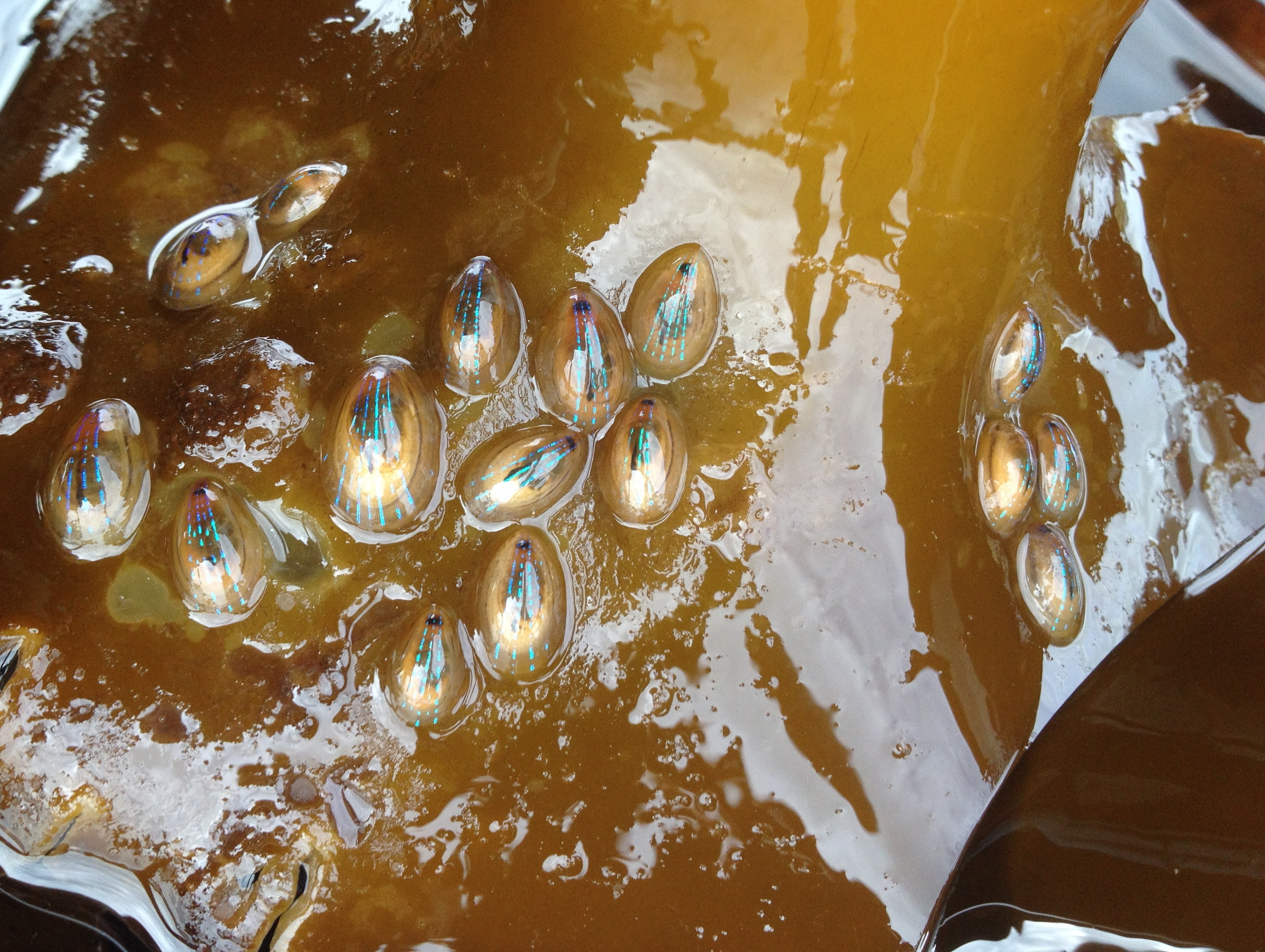 Because of the plankton bloom (see the last post), I decided to try my hand again at some above-water macrophotography. Above and below a Flat periwinkle Littorina obtusata on bladder wrack. More subjects: a Red Doris Rostanga rubra, a Painted topshell Calliostoma zizyphinum, Cornish sucker (or Shore clingfish) Lepadogaster purpurea eggs (they must not be laid long ago and so the tiny fish are not yet visible, although if you zoom in you can see an outline forming) and some layers of Coral weed.