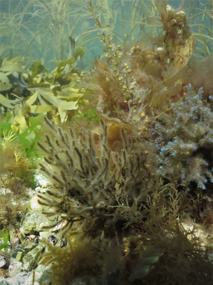 I need to go back studying photography basics. A main challenge is contrast. The pools have beautiful white sand, which result in hugely overexposed photos (or completely darkened subjects). I have come up with my own law, the Photography Frustration Index (PFI): the beauty of the subject (B) x the difficulty of capturing it (D). The PFI is very high in the case of seaweeds! Next: Bushy rainbow wrack under Thong weed, Purple claw weed Cystoclonium purpureum, Bushy berry wrack Cystoseira nodulosum covered with the epiphytes Asparagopsis (left) and Bonnemaisonia (right), Hairy sand weed Cladostephus spongiosus, Black scour weed Ahnfeltia plicata (you can see they grow in the sand and must be used to scouring) a ‘bouquet’ of different species (with a snakelocks anemone) and a last photo of a variety of species, including the common False eyelash weed Calliblepharis jubata. The tides and weather conditions are unfavourable the coming days but I hope to go snorkeling again end of the week!