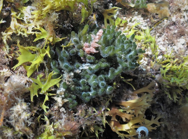 On the two photos above Bushy berry wreck Cystoseira baccata (along with Brown fan weed and Oyster thief). There are many big snakelocks anemones around and quite some fish, mainly shoals of juvenile pollack, Corkwing wrasse and Ballan wrasse, Two-spot gobies and, beyond the pools above the kelp forest, shoals of sand eels and sand smelt. The wind has picked up again so no more snorkelling in the coming days. I’d love to go for a dive again but my strobe malfunctioned and is back with the manufacturer for repair and so I might wait a bit going back into the water….