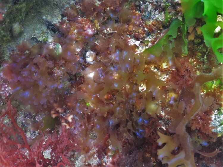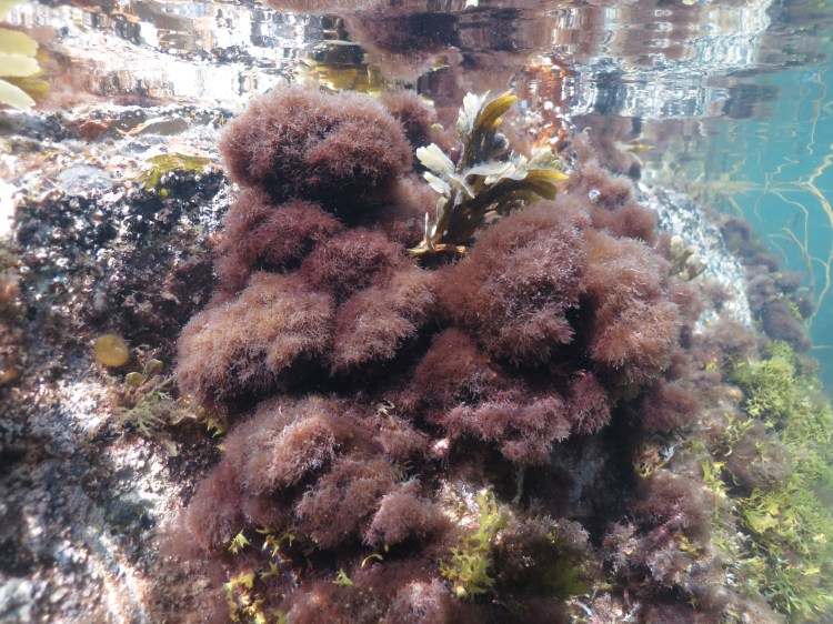 This Thursday was only sunny, but also not windy, with a good low tide in the early afternoon, which meant I reserved a few hours to go to Tunnel/Castle/Gylly beach for some snorkelling. The photo above shows Gylly Beach, with the start of Swanpool lagoon behind it and the Lizard in the far distance. (I took this with my iPhone using a Hipstamatic filter; for more iPhone pics of Cornwall see cornwall_hipsta on instagram…). The water temperature was OK (9C?) but the viz was not as good as I hoped. The seaweeds are at their peak now and the pools looked very pretty. Not many fish, but I saw a small brown thing floating around which I first thought was Sea hare, but turned out to be a small (perhaps a Connemara) clingfish lazing about until it noticed me and bolted into the seaweeds. I carefully snorkelled in about half a meter of water, admiring the views and trying to take photos close-up (as the viz was not too good) with my wide angle wetlens. Below an above-water shot of some iridescent Bushy rainbow wrack Cystoseira tamariscifolia and the invasive red Bonnemaisonia hamifera (on the left).