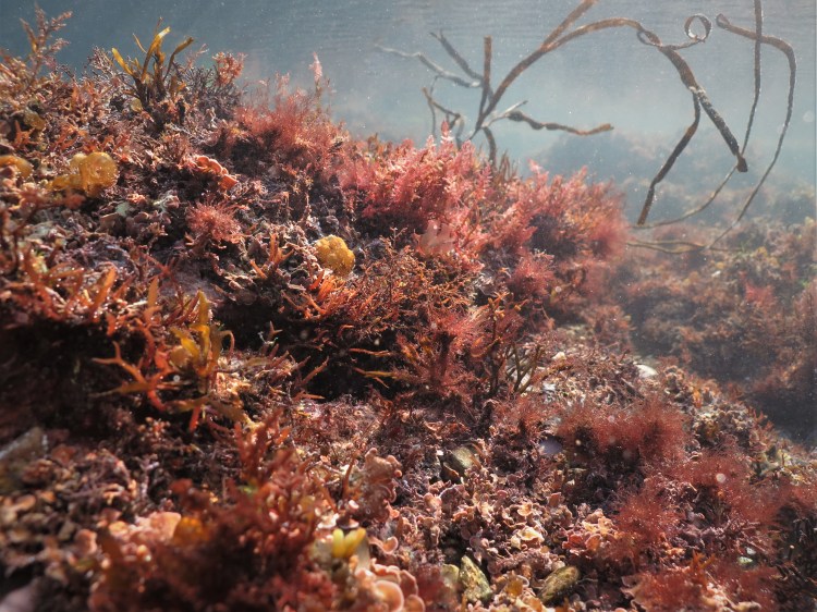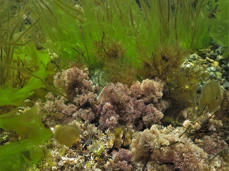 Wednesday had a good low tide, sun and no wind so I headed out for the water during my (long) lunch break. I was not disappointed with the viz, although the wireweed and thong weed shed tissue (conceptacles and/or epiphytic algae?) which immediately cloud the water so you have to ‘swim and shoot’ before the opportunity is gone. At this time of the year, the seaweed biomass is at its greatest, with lots of Harpoonweed, Wireweed, Sea lettuce, Bushy rainbow wrack and Thong weed but the biodiversity is lower, with many other species such as Discoid forkweed, False eyelash weed, Bonnemaisons Hookweed and Red grape weed gone or decaying. Below some general impressions (more photos from around the same time last year here and here):