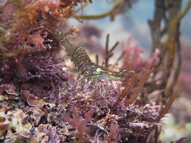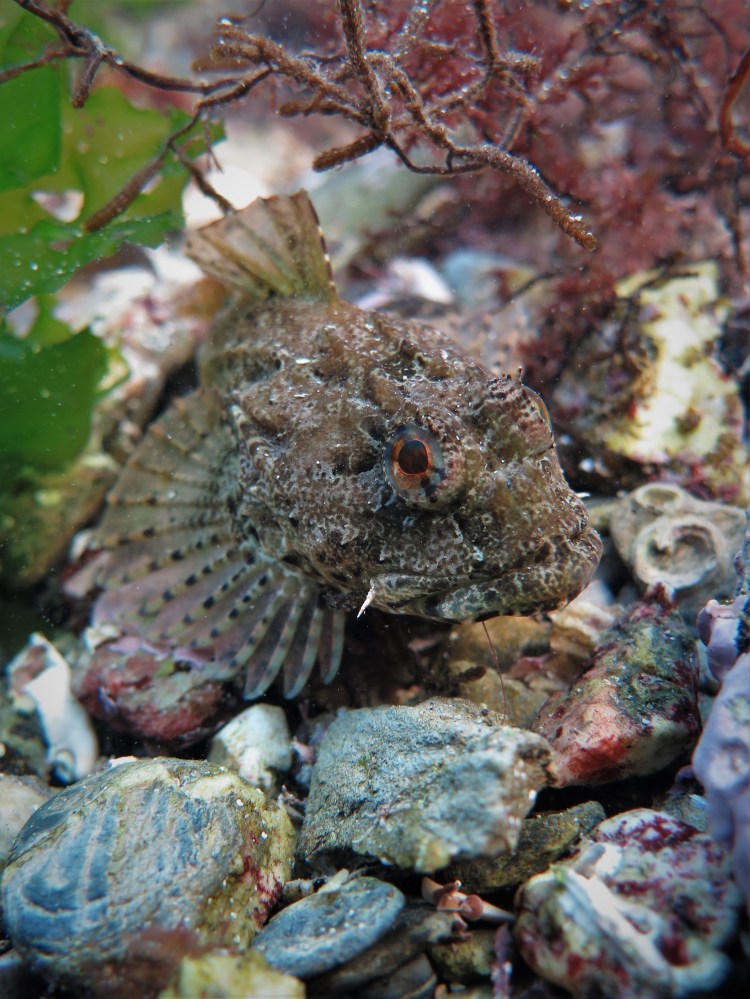 I turned over a stone and found a Long-spined sea scorpion Taurulus bubalis, these keep very still and are also easy to photograph. Prawns were of course around and are actually really pretty with blue and yellow legs and striped body. Finally a shot of seaweeds in this pool showing fresh growth of many red species and a shot with green Cladophora showing limited visibility due to wave action. Btw, I see this is the 200th post on the blog!