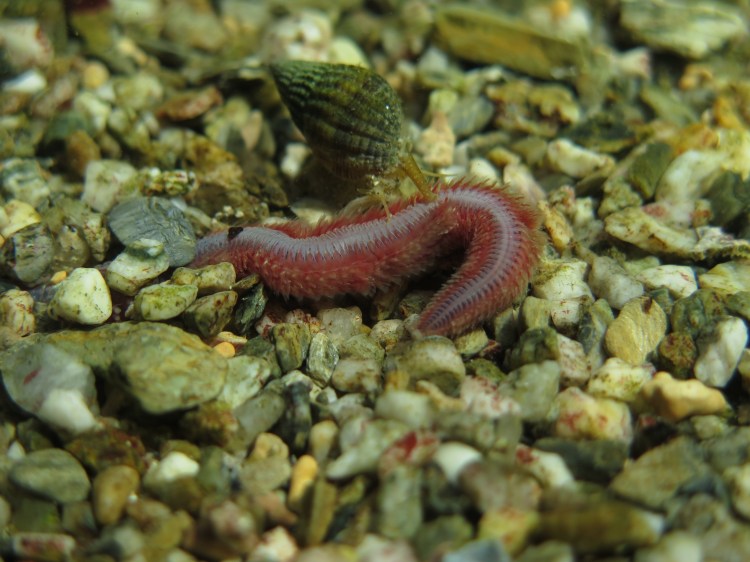Finally, three shots giving a general impression of the seaweed growth and what I think is Chipolata weed Scytosiphon lomentaria as well as a snakelocks anemone inbetween yellowed False eyelash weed Calliblepharis jubata. About the animals: there are some juvenile pollack around, as well as two-spot gobies. I saw a brown, flabby shape drifting through the water at one point and my first thought was that it was a seahare but it actually turned out to be a small clingfish (I could not get a photo unfortunately). There were quite some polychaete worms erratically swimming around in their reproductive ‘epitoke’ stage. The final photo shows one (with a Nassarius reticulatus in the background) which could be Perinereis cultifera.