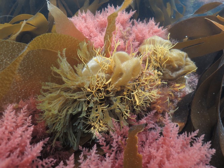 I need to go back studying photography basics. A main challenge is contrast. The pools have beautiful white sand, which result in hugely overexposed photos (or completely darkened subjects). I have come up with my own law, the Photography Frustration Index (PFI): the beauty of the subject (B) x the difficulty of capturing it (D). The PFI is very high in the case of seaweeds! Next: Bushy rainbow wrack under Thong weed, Purple claw weed Cystoclonium purpureum, Bushy berry wrack Cystoseira nodulosum covered with the epiphytes Asparagopsis (left) and Bonnemaisonia (right), Hairy sand weed Cladostephus spongiosus, Black scour weed Ahnfeltia plicata (you can see they grow in the sand and must be used to scouring) a ‘bouquet’ of different species (with a snakelocks anemone) and a last photo of a variety of species, including the common False eyelash weed Calliblepharis jubata. The tides and weather conditions are unfavourable the coming days but I hope to go snorkeling again end of the week!