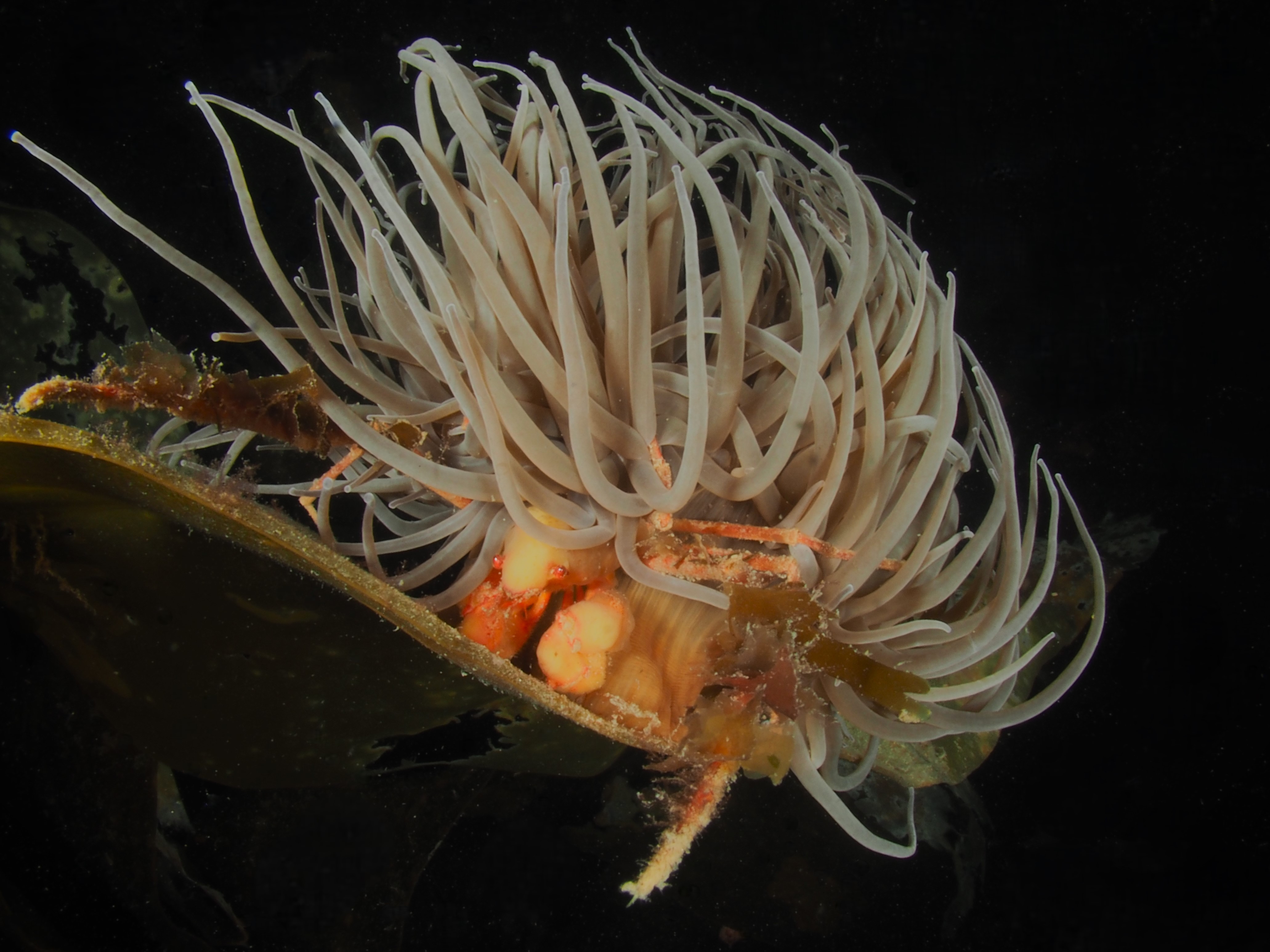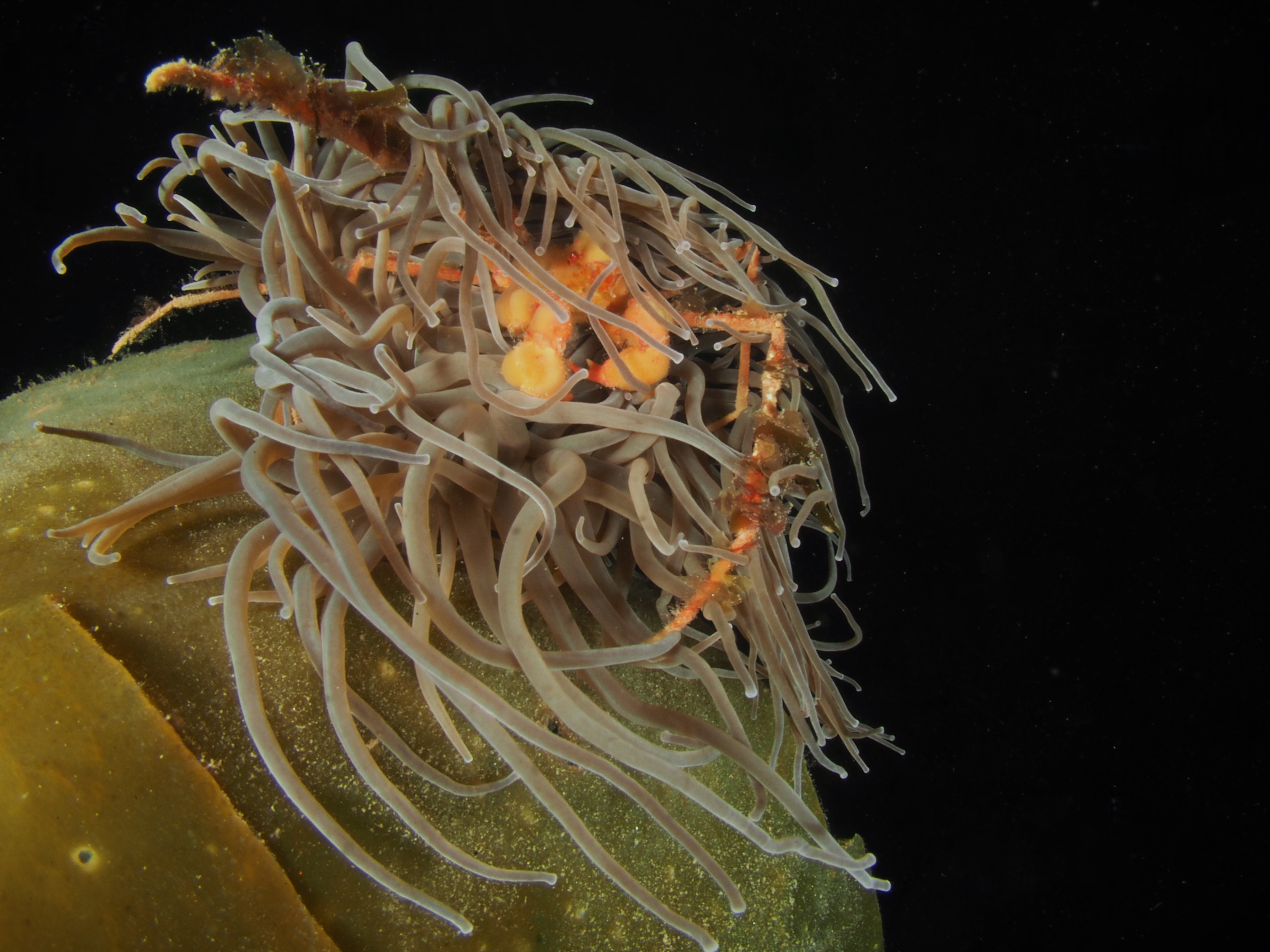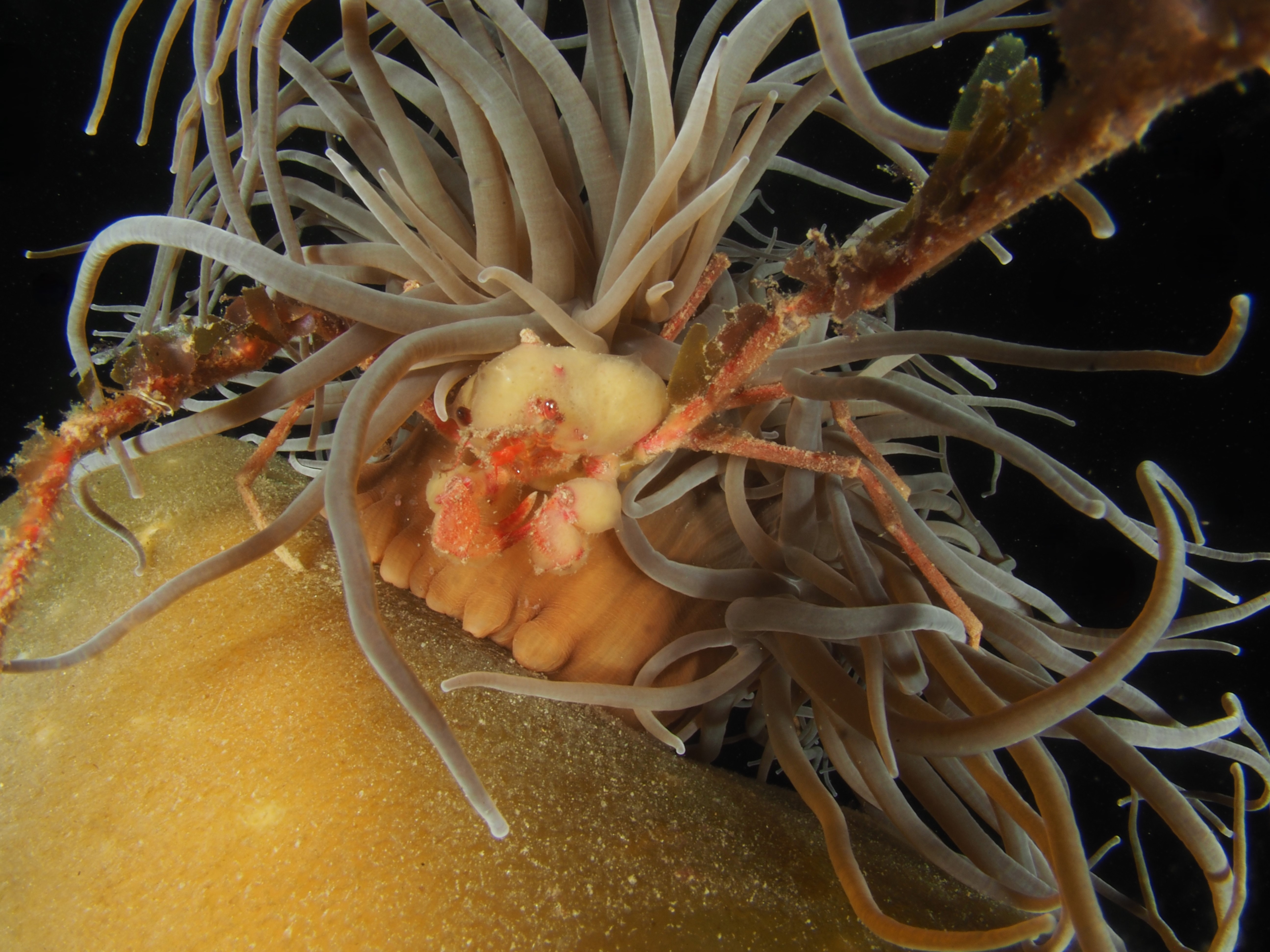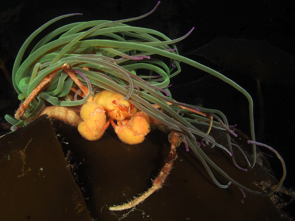 Many other critters were found too and I took shots of a selection. First, a Sea Spider, all legs and crawling away. A tiny mat of colonial tunicate that looked like a persian rug on drugs. A quick shot of the ubiquitous (if you know where to look – on kelp fronds) blue-rayed Limpets and a stalked jellyfish. Finally, I spent a lot of time taking shallow-depth-of-field AND slow shutter-speed photos of a scorpion spider crab in a snakelocks anemone to get some sort of ‘artistic’ shot. It did not really work, but it was fun nonetheless and I will have a go at it again. After almost 2,5 hours in the water I stumbled back to the car to get changed – an afternoon well-spent!