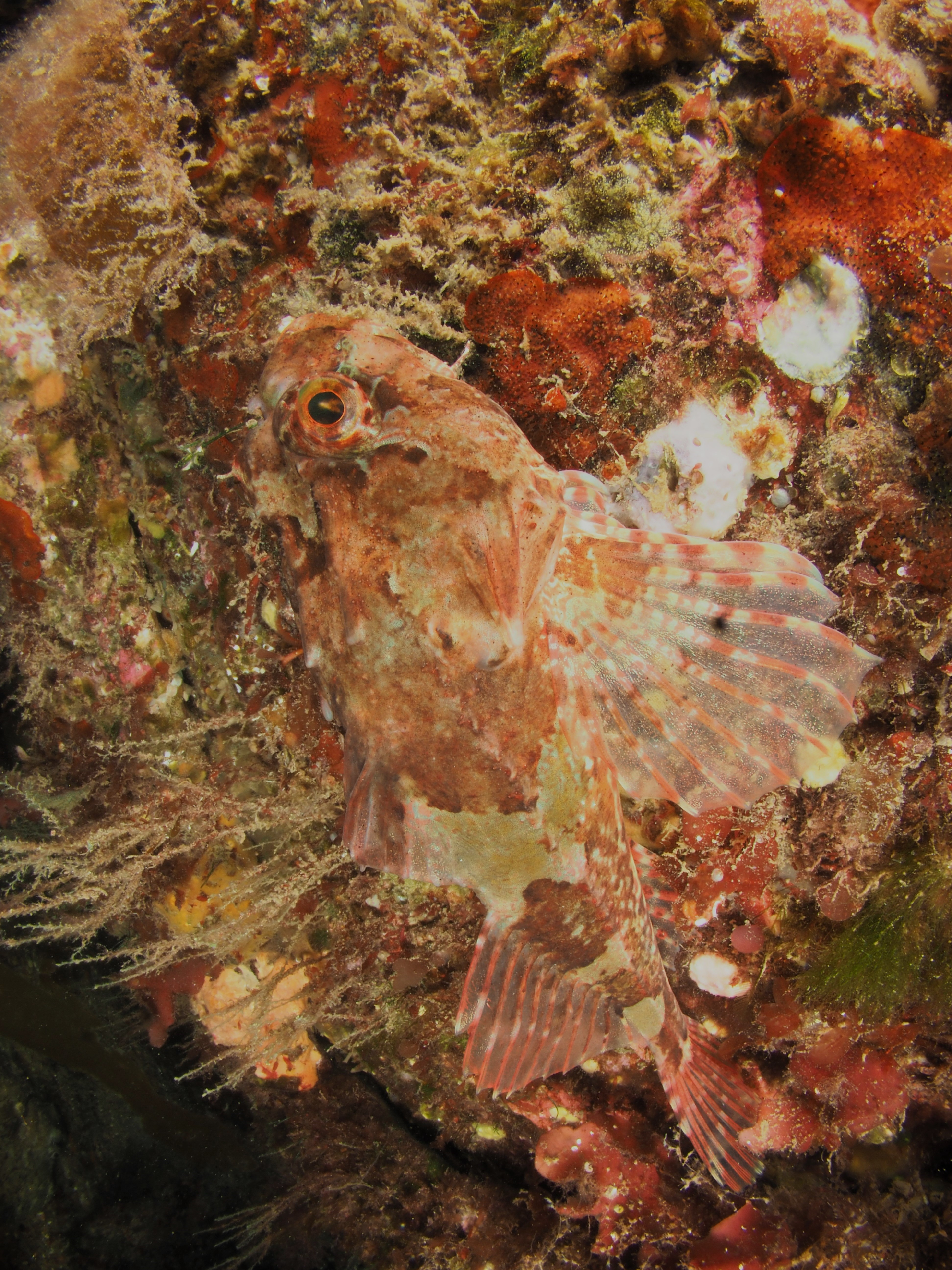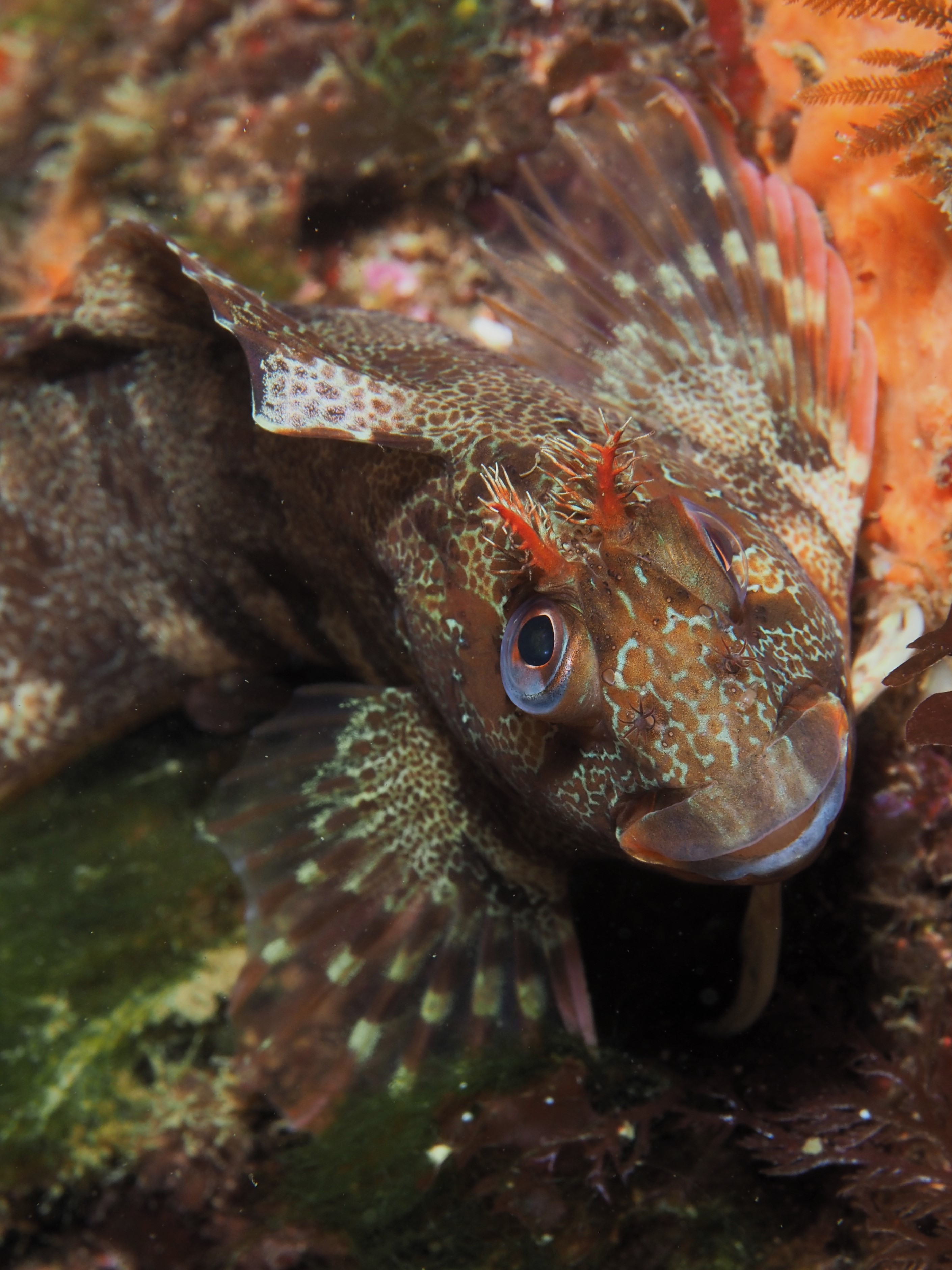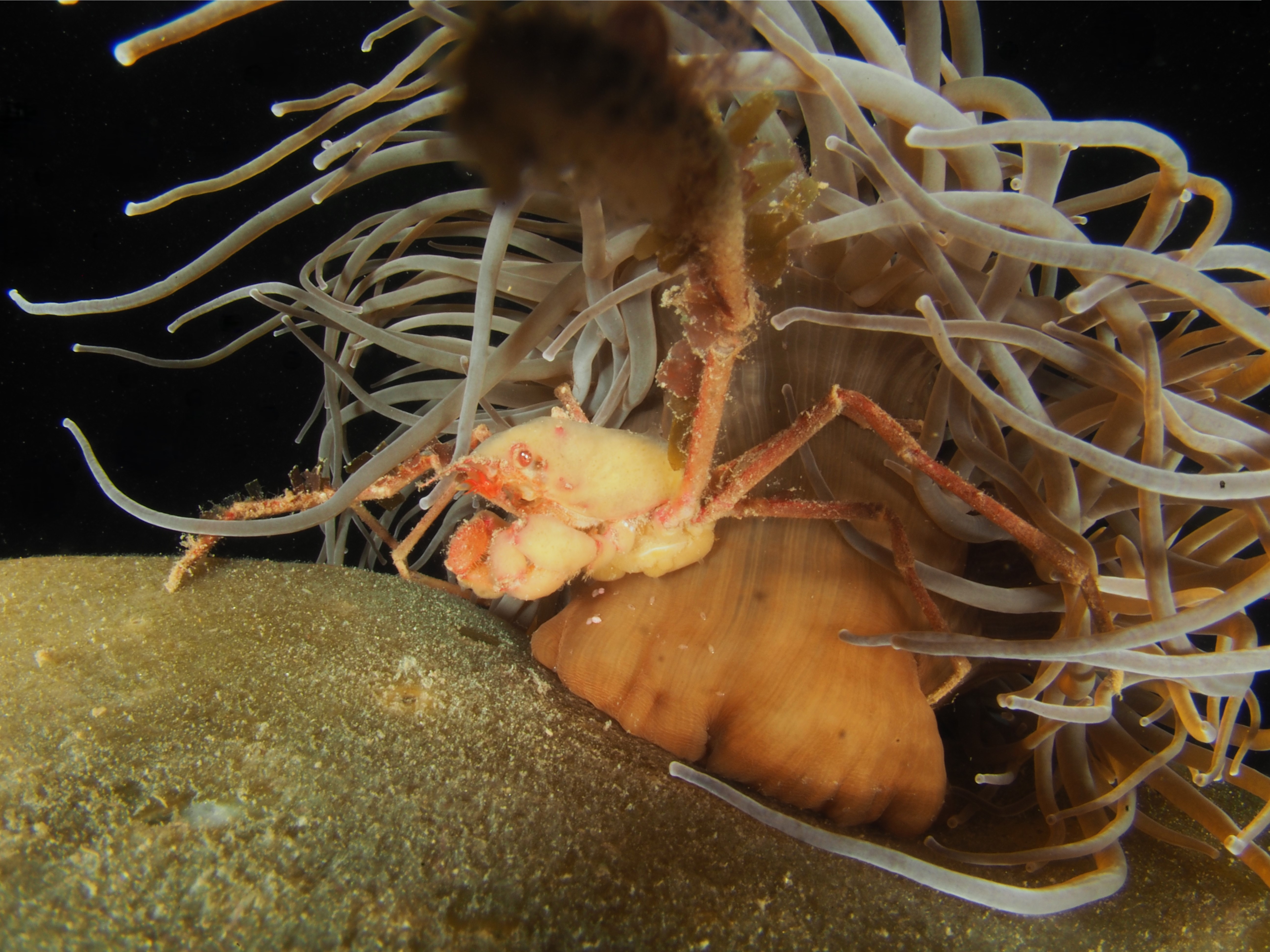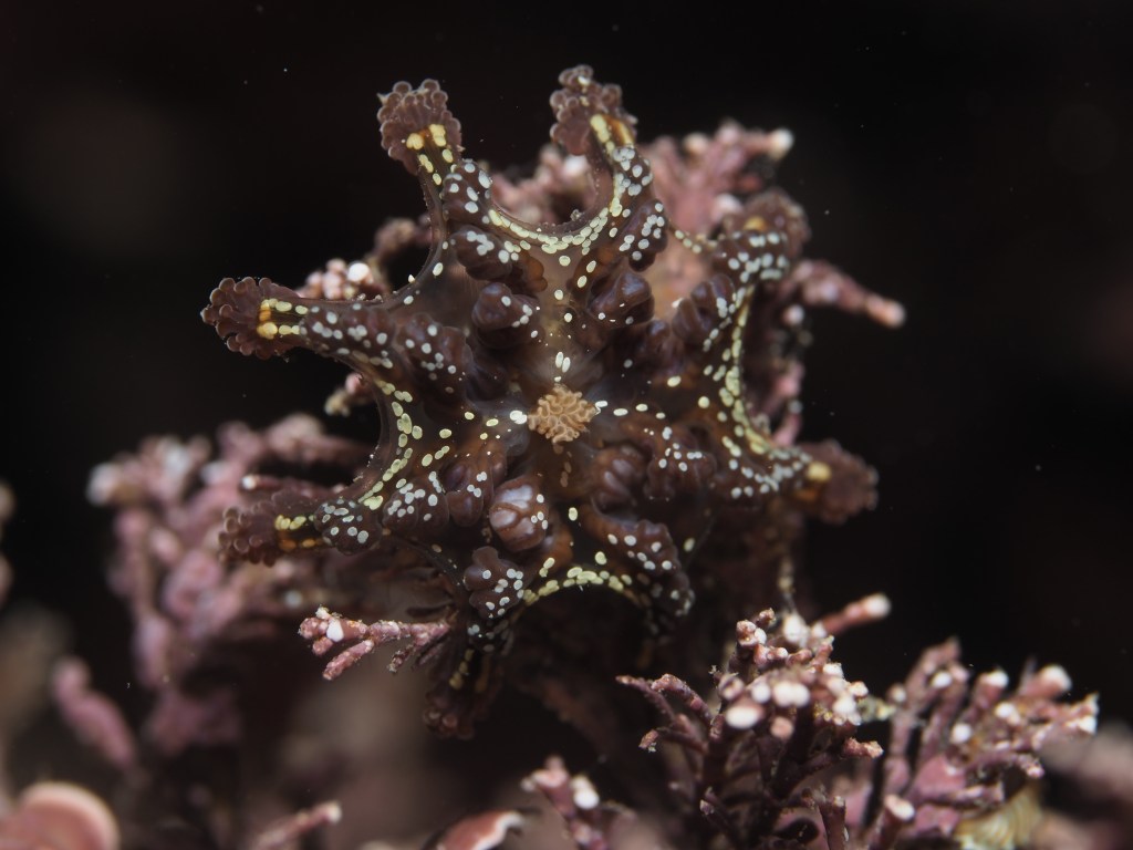 Many other critters were found too and I took shots of a selection. First, a Sea Spider, all legs and crawling away. A tiny mat of colonial tunicate that looked like a persian rug on drugs. A quick shot of the ubiquitous (if you know where to look – on kelp fronds) blue-rayed Limpets and a stalked jellyfish. Finally, I spent a lot of time taking shallow-depth-of-field AND slow shutter-speed photos of a scorpion spider crab in a snakelocks anemone to get some sort of ‘artistic’ shot. It did not really work, but it was fun nonetheless and I will have a go at it again. After almost 2,5 hours in the water I stumbled back to the car to get changed – an afternoon well-spent!