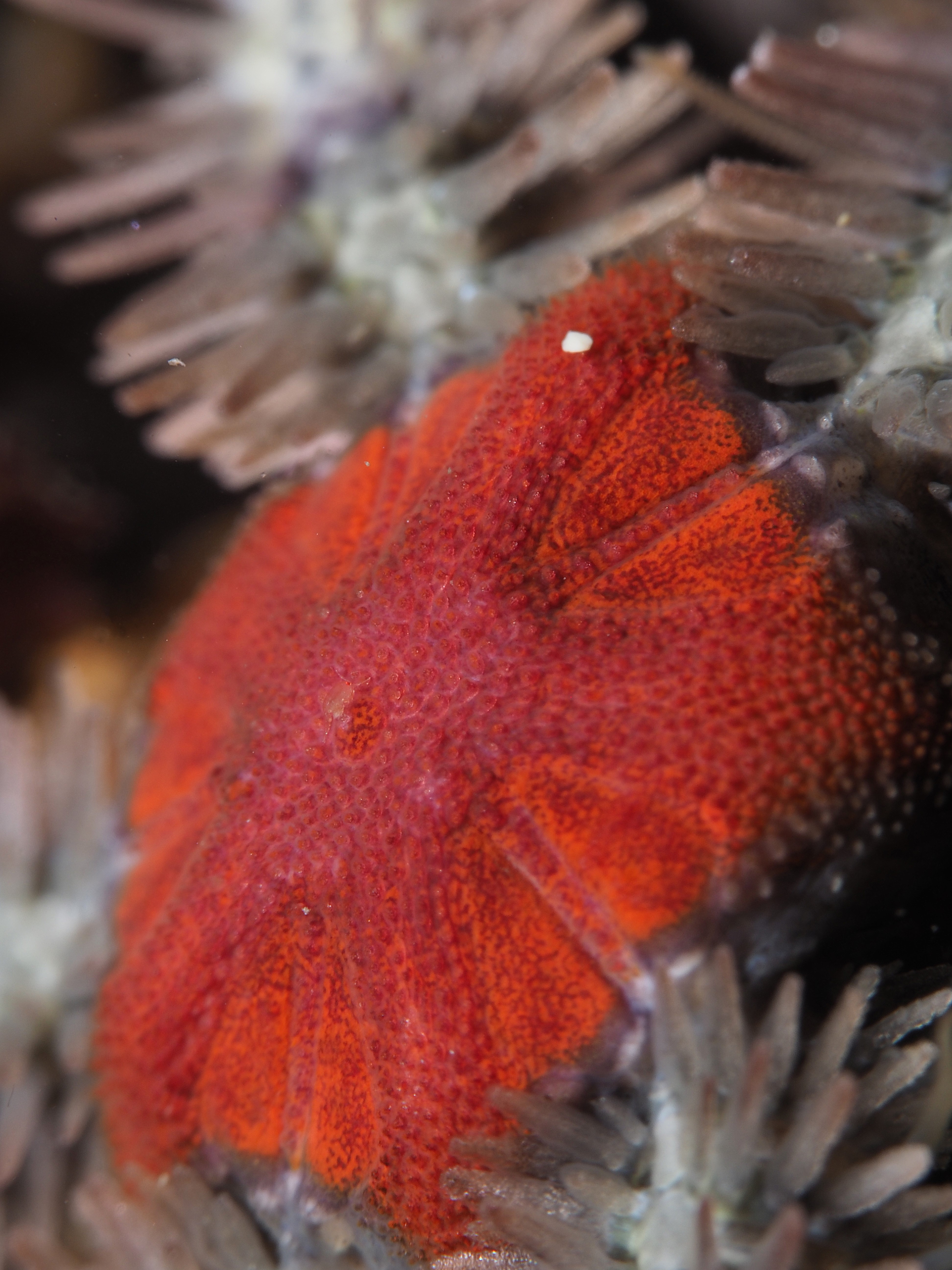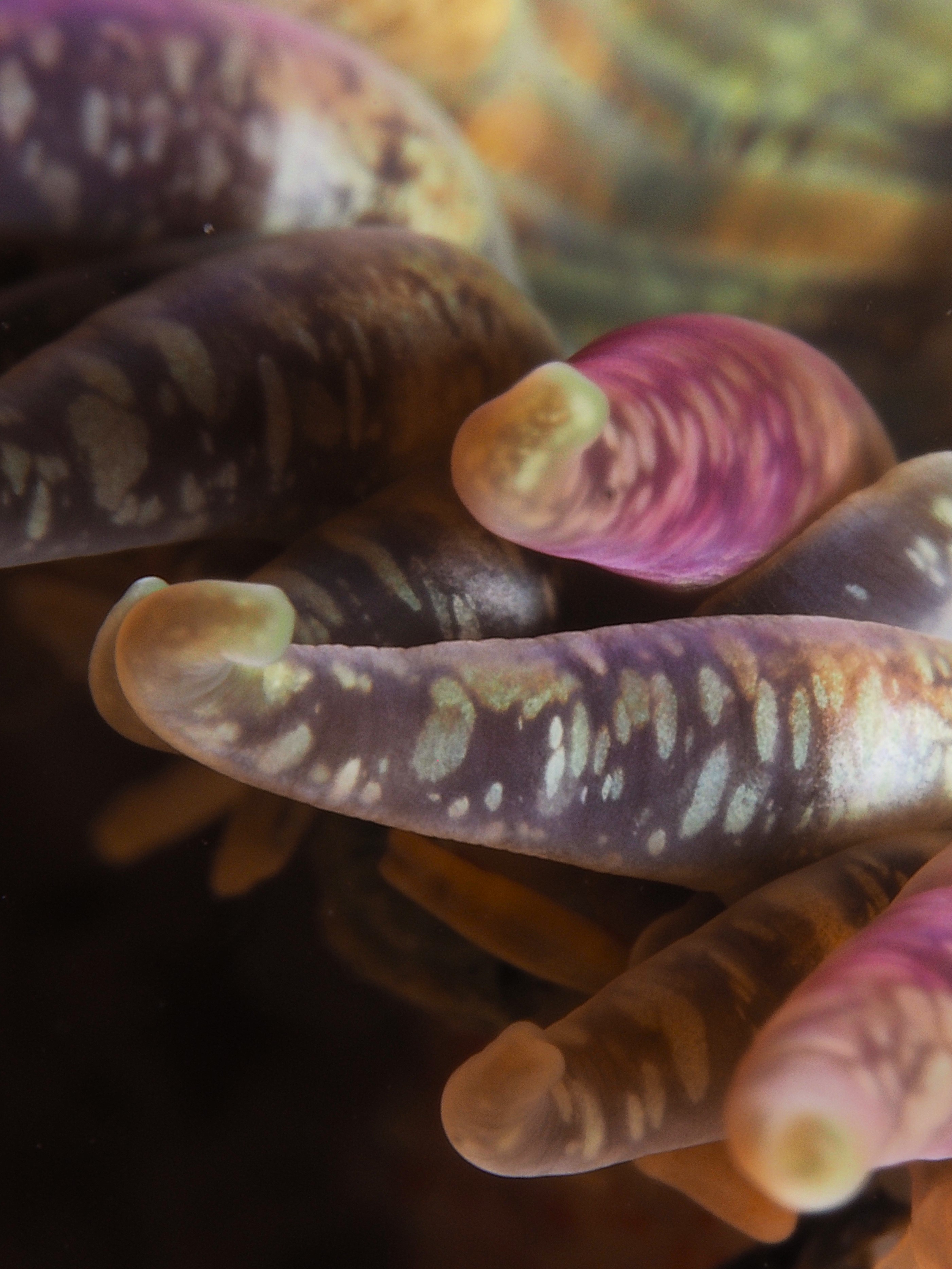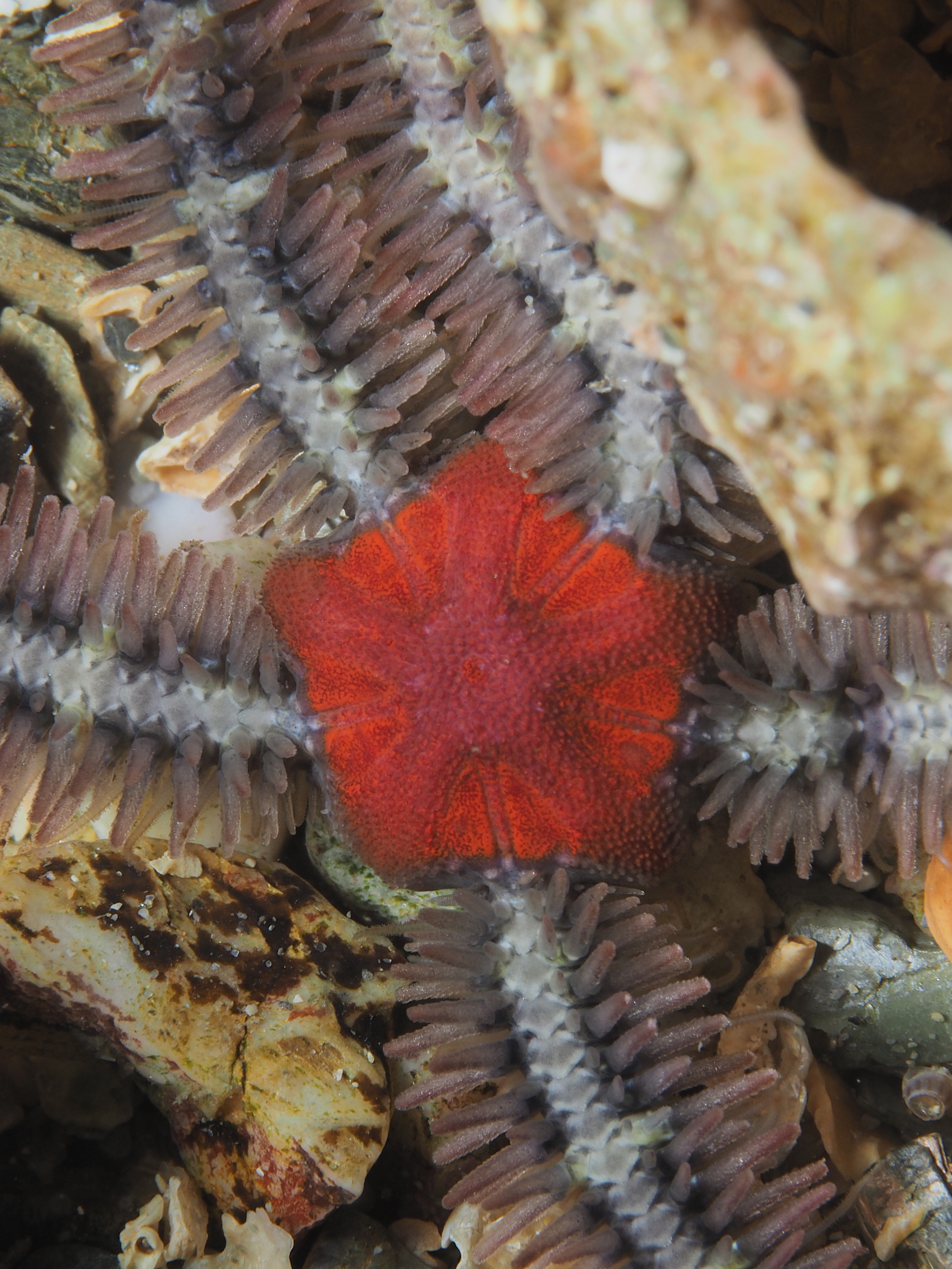 Easterlies (bad viz) and low tides meant some macro photography in the rockpools this Saturday. The water is getting chillier but staying in for two hours is still possible. I returned to a subject I tried my hand at before: the tube feet of a Green Sea Urchin (Psammechinus miliaris). The 60mm macro + cmc-1 wetlens plus some cheeky cropping gets me close, although I always want to get even closer! I was happier with the results than the previous times, so I posted it on instagram (@an_bollenessor). Below a more zoomed out view of the underside of the urchin, yours truly in the water, a common brittlestar, a small brittlestar, a pheasant shell, a tiny nermertean worm which might be this (thanks David Fenwick!) and a detail of a redspeckled anemone.