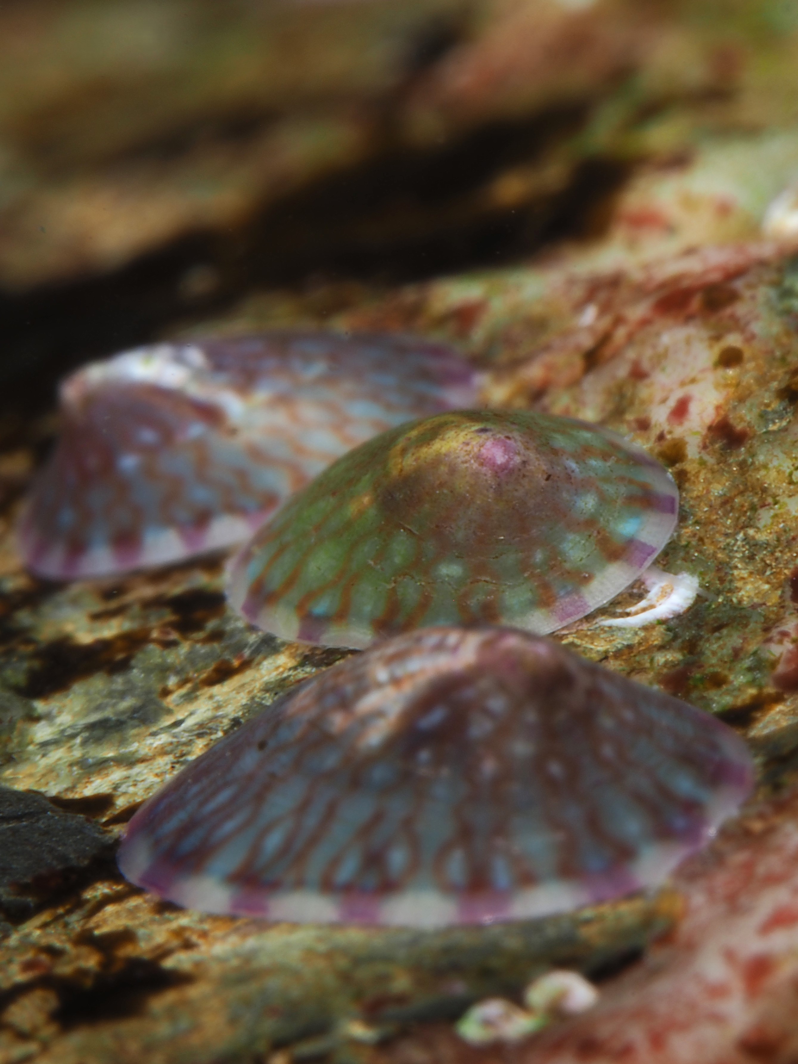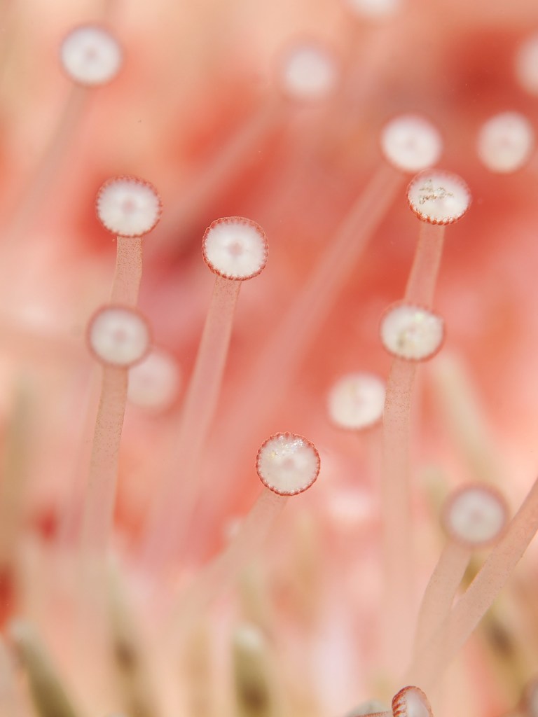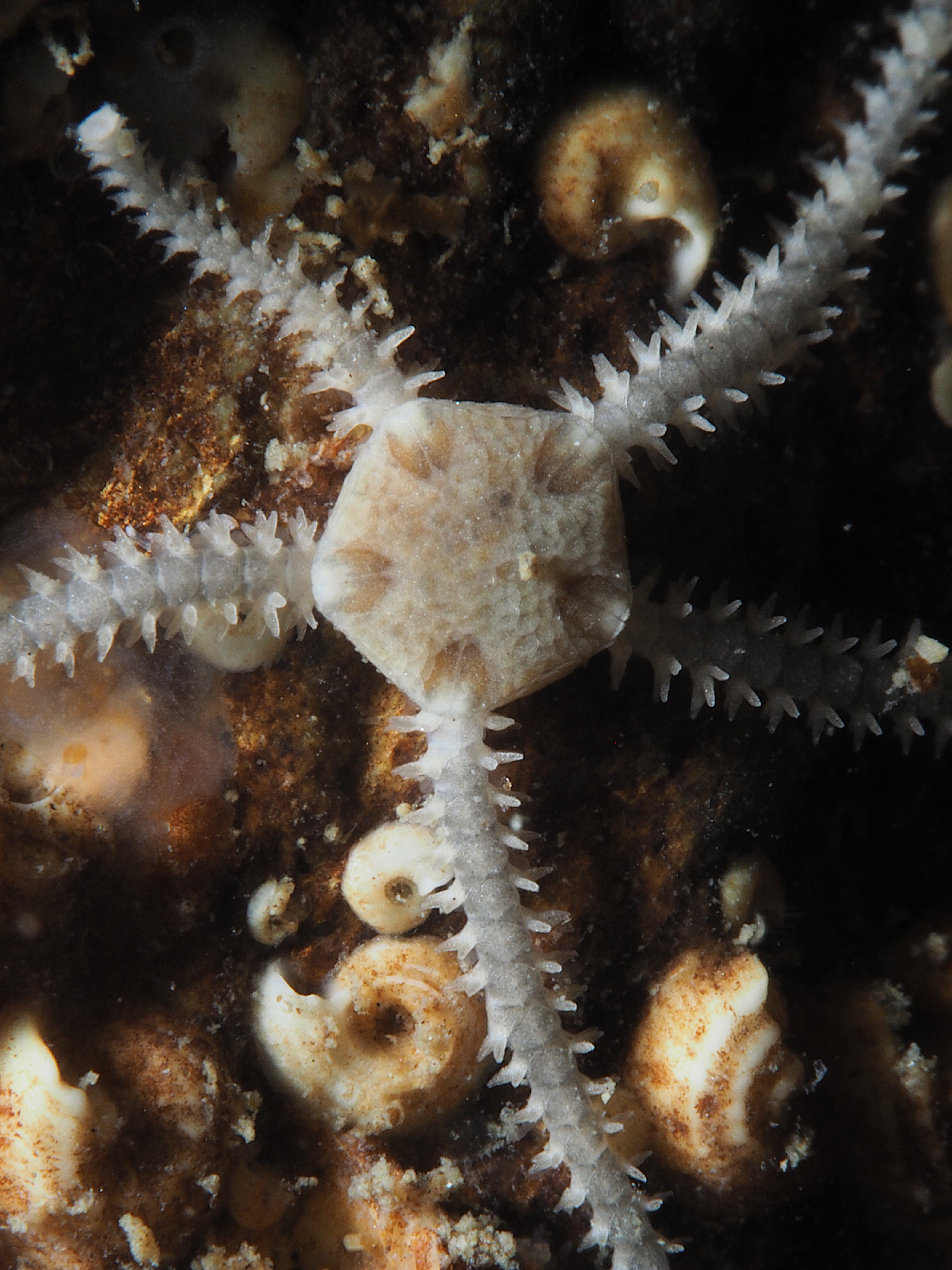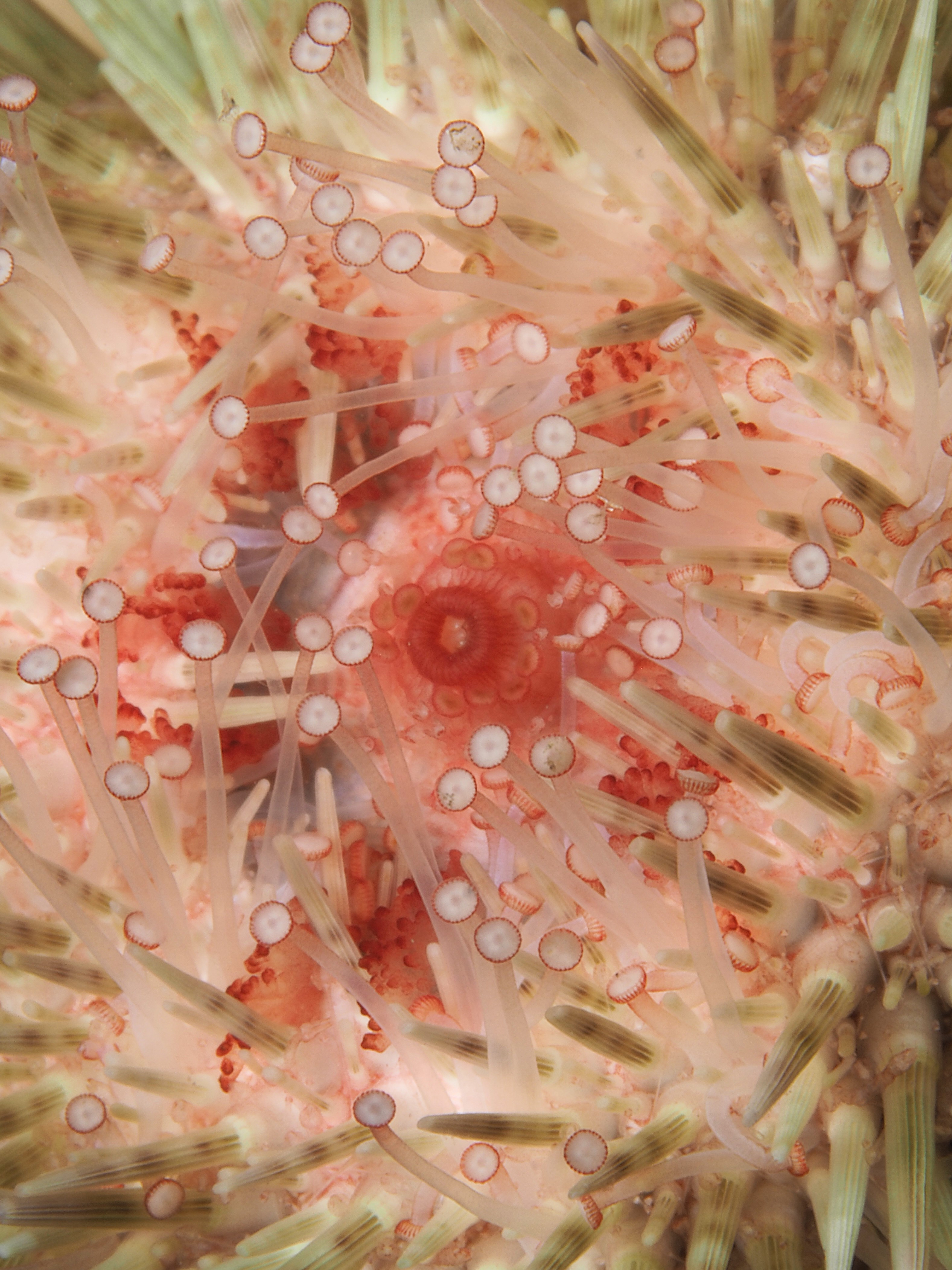 Easterlies (bad viz) and low tides meant some macro photography in the rockpools this Saturday. The water is getting chillier but staying in for two hours is still possible. I returned to a subject I tried my hand at before: the tube feet of a Green Sea Urchin (Psammechinus miliaris). The 60mm macro + cmc-1 wetlens plus some cheeky cropping gets me close, although I always want to get even closer! I was happier with the results than the previous times, so I posted it on instagram (@an_bollenessor). Below a more zoomed out view of the underside of the urchin, yours truly in the water, a common brittlestar, a small brittlestar, a pheasant shell, a tiny nermertean worm which might be this (thanks David Fenwick!) and a detail of a redspeckled anemone.