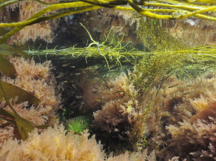 A quick snorkel this Tuesday to check out my favourite rock pools at Castle Beach here in Falmouth. The tide was low, the water still and the sun was shining, creating beautiful shimmers of light. The Wireweed, Thong weed, Sea lettuce and also the Bushy rainbow wrack are in full swing, but most of the other species are in decline, with for instance the Harpoon weed and False Eyelash weed bleaching. Still, it is very pretty! The most common fish encountered so far this year have been Two-spot Gobies, with the occasional wrasse or dragonet. Now, loads of juvenile Pollack Pollachius pollachius have appeared (ID thanks to the excellent folk at the Seasearch Cornwall facebook page). The following photos are all variations on the same theme; I could not decide which ones were best so I just posted the whole lot: