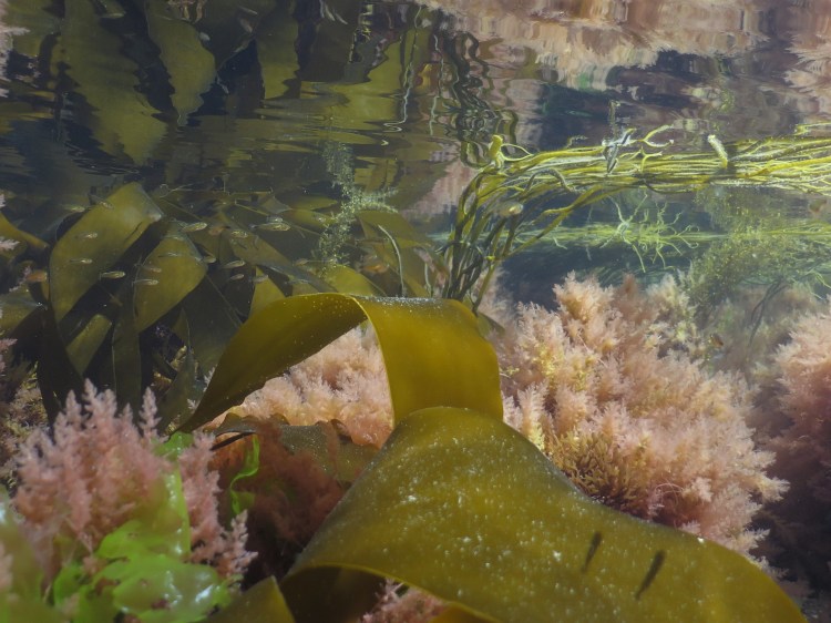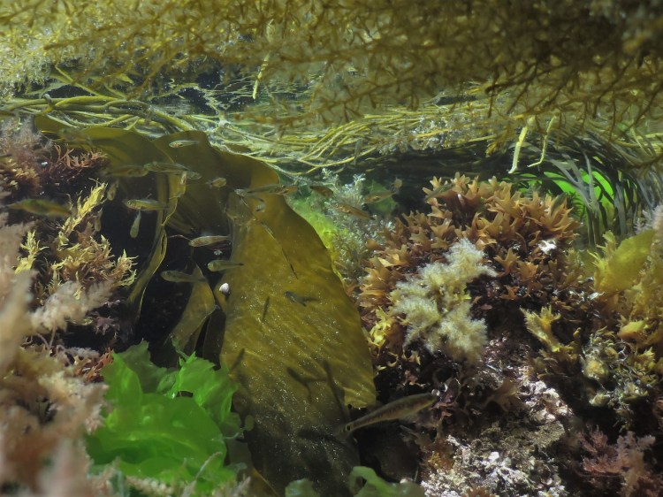 A quick snorkel this Tuesday to check out my favourite rock pools at Castle Beach here in Falmouth. The tide was low, the water still and the sun was shining, creating beautiful shimmers of light. The Wireweed, Thong weed, Sea lettuce and also the Bushy rainbow wrack are in full swing, but most of the other species are in decline, with for instance the Harpoon weed and False Eyelash weed bleaching. Still, it is very pretty! The most common fish encountered so far this year have been Two-spot Gobies, with the occasional wrasse or dragonet. Now, loads of juvenile Pollack Pollachius pollachius have appeared (ID thanks to the excellent folk at the Seasearch Cornwall facebook page). The following photos are all variations on the same theme; I could not decide which ones were best so I just posted the whole lot: