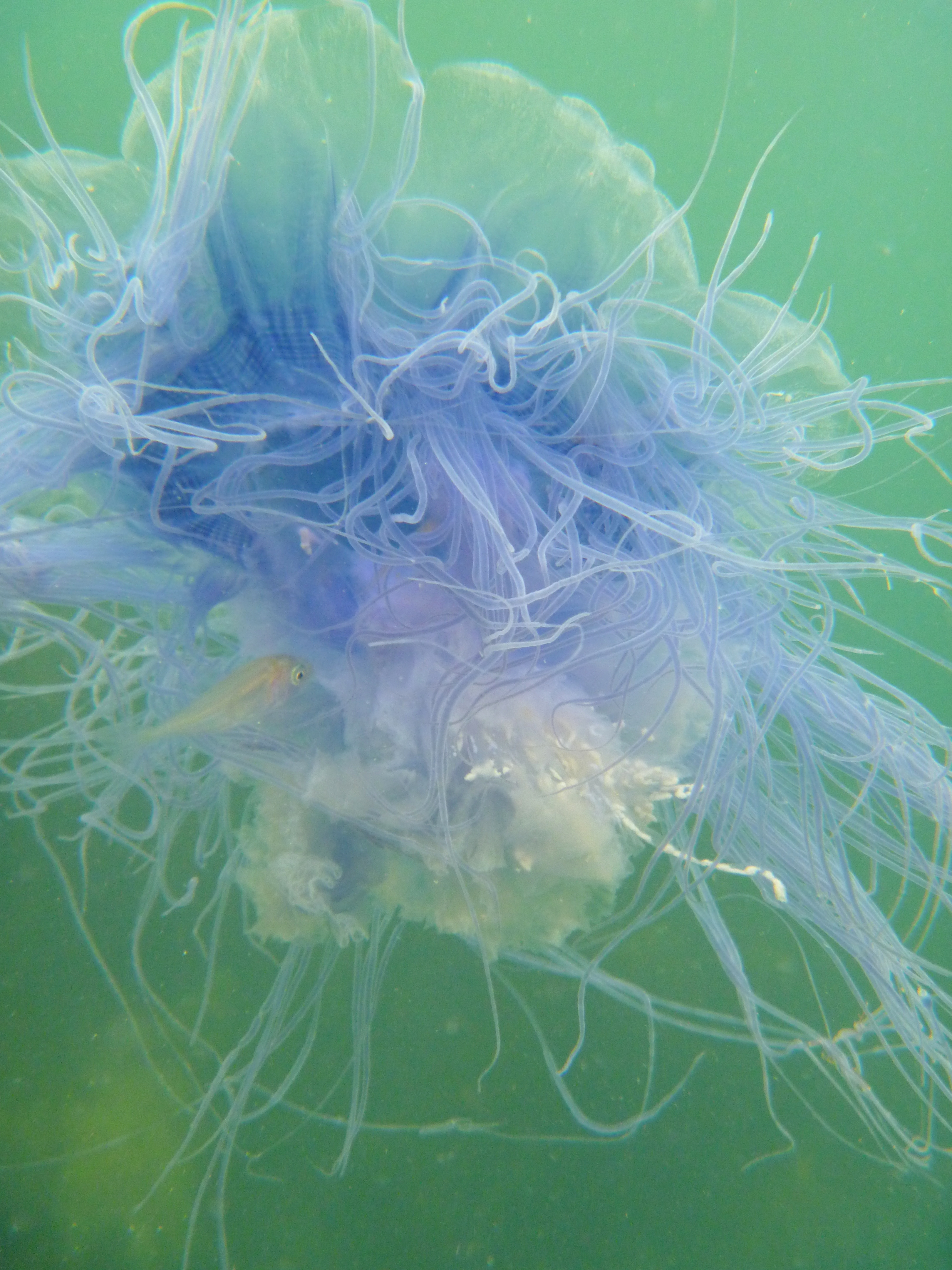It did not end there. I next spotted a beautiful Blue jellyfish Cyanea lamarckii gently pulsating through the water column. Inbetween the tentacles three tiny fish were hiding, most probably juvenile Horse mackerel Trachurus trachurus: